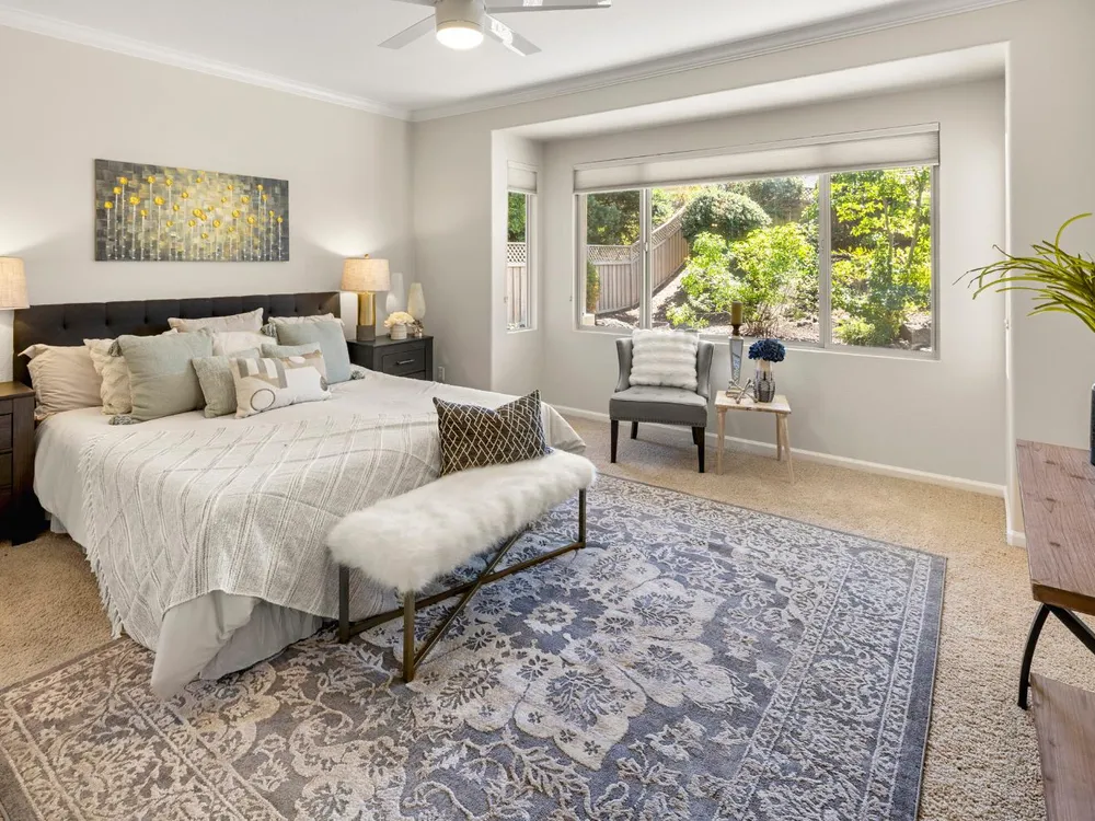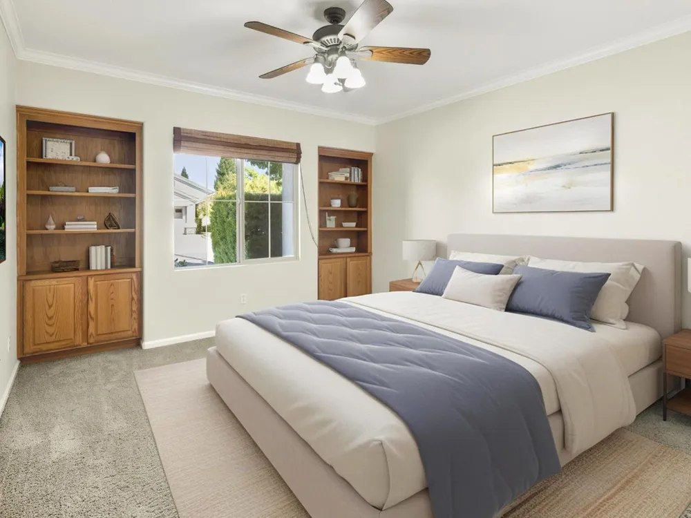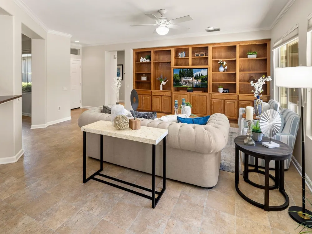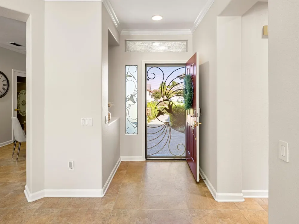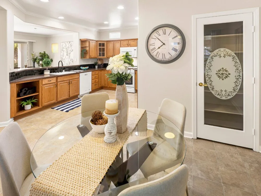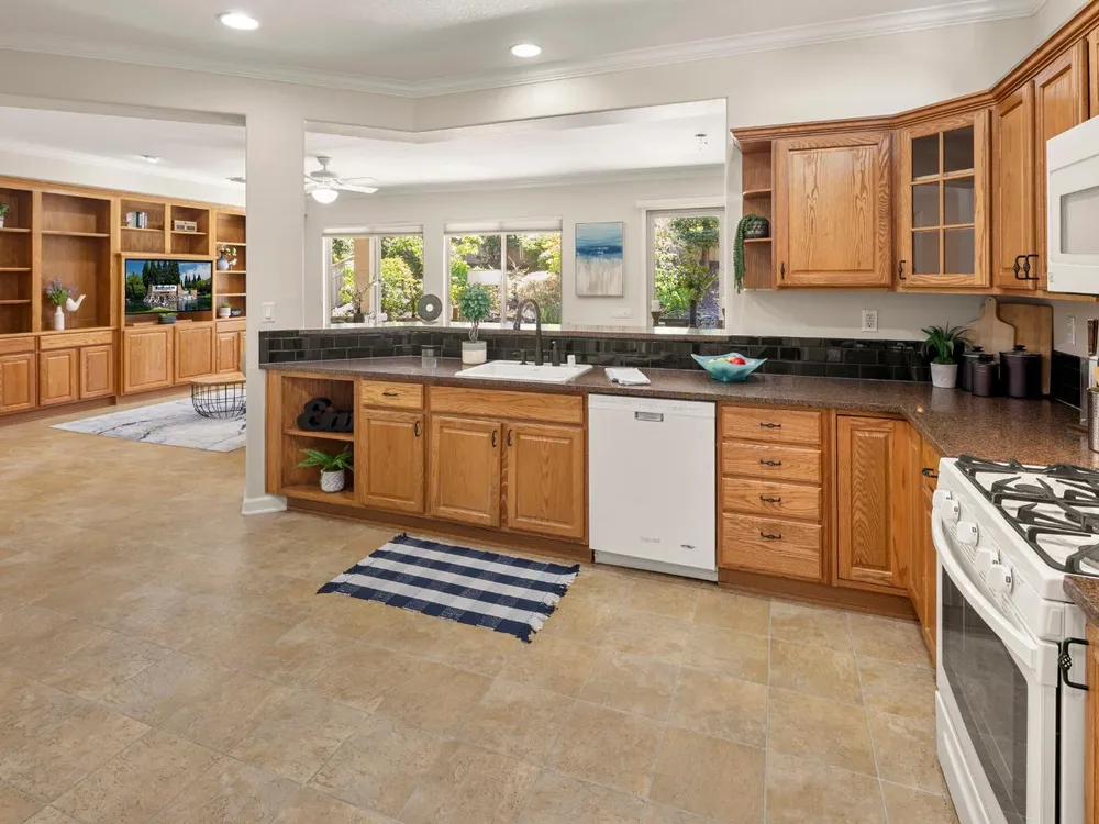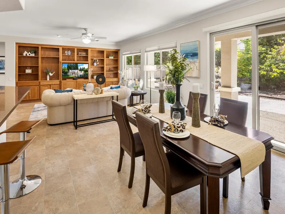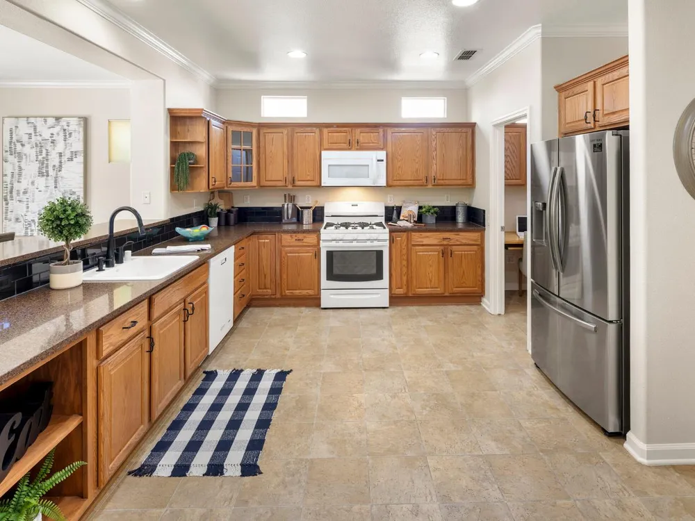 Close to the Orchard Creek Lodge and move-in ready is this 1571 sf Quail Cove plan. Architectural features include the Primary Bedroom Bay Window, the extra 1/2 car garage and Radiant Barrier Sheathing in the attic for energy efficiency! The plumbing is not original (no Kitec) and the Heating/Ventilation/Air Conditioning has been replaced. There is a leased solar which has substantially reduced the seller's PGE bills each month. This plan has it's signature 2 bedroom footprint without a den but with a 13x13 dimension at the second bedroom allowing for quite the flexibility! Also, there is a nice pantry, office, collaborative space off the kitchen where the laundry has been relocated into the garage. Visitors love the large great room with lots of light and the wall of windows framing the full back patio directing your eye out to the tranquil rear gardens and water feature! The vinyl flooring makes for easy maintenance and is consistent through the home except the bedrooms. The rear garden sprinkler system has been recently tuned up and fresh bark front and back! Pride of ownership throughout.