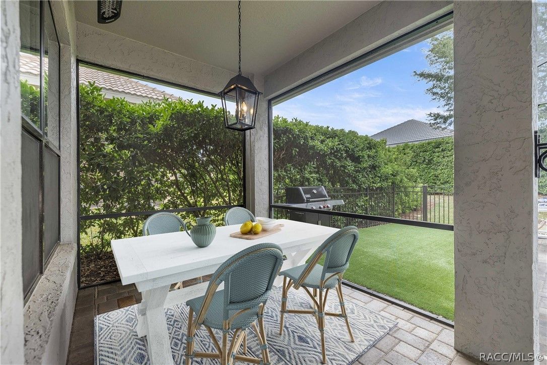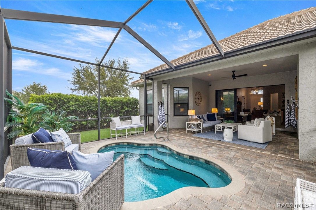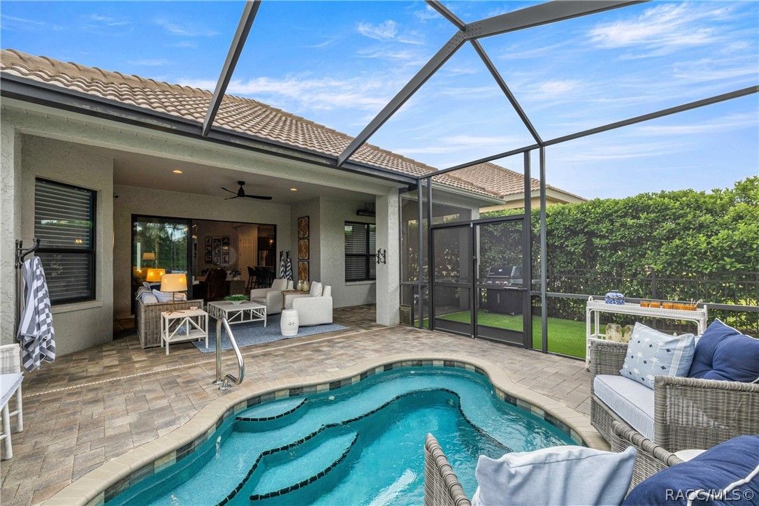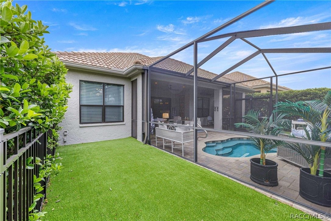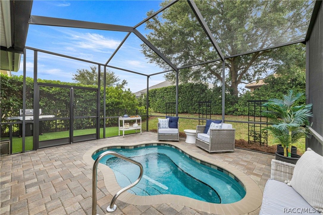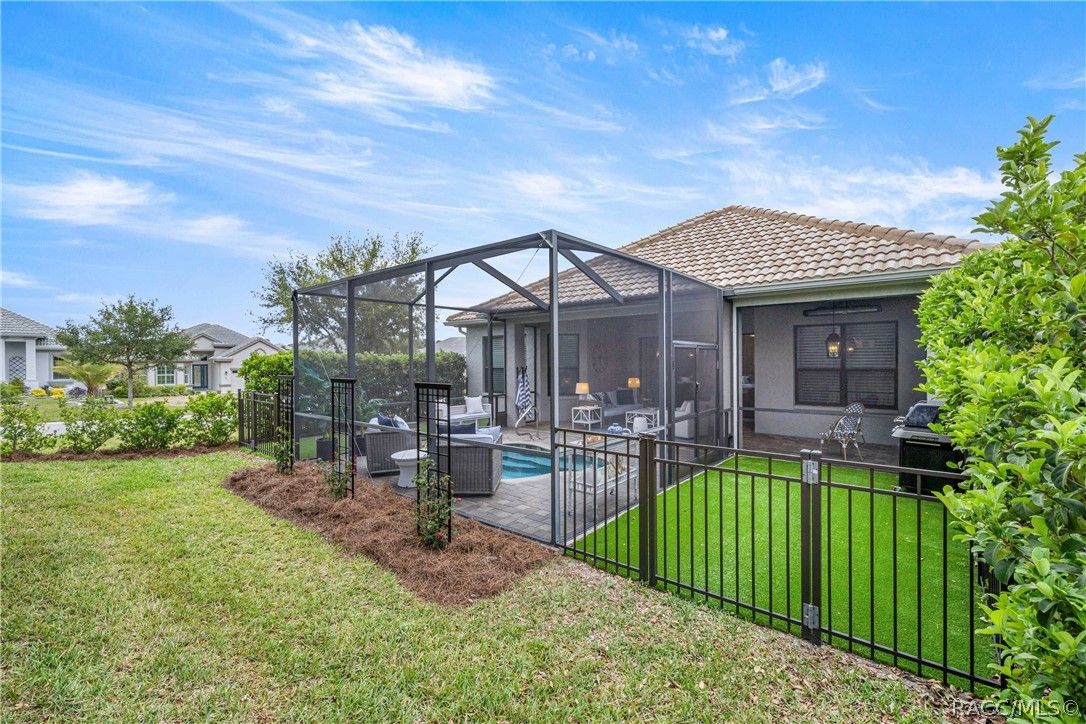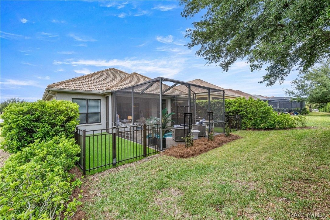 Imagine effortless Florida living in this beautifully upgraded Carefree SPOOL home, perfectly positioned on a private, oversized corner homesite in the desirable Westford Villa neighborhood of Terra Vista. Sitting at 98 feet above sea level, this stunning St. James–style residence blends comfort, style, and peace of mind in one exceptional package. From the moment you step inside, you’re welcomed by elegant finishes and thoughtfully curated details—rich crown molding, tray ceilings, designer lighting, and gorgeous quartz countertops all come together to create a warm yet sophisticated atmosphere. Hunter Douglas Silhouette window treatments frame the views to your expansive lanai, where your private SPOOL (spa + pool) invites you to relax, unwind, or entertain in style. The screened enclosure is uniquely designed with two separate fenced areas—ideal for pets or creating a safe, turf-lined space for grilling and outdoor enjoyment. Whether hosting friends or enjoying a quiet evening poolside, this home delivers the perfect setting. The spacious primary suite offers two large closets and a well-appointed bath, while the home’s functional layout includes a generous laundry room and a two-car garage with extra storage space. Beyond your doorstep, Terra Vista offers a vibrant, resort-style lifestyle. Spend your days at the tiki bar, on the pickleball or tennis courts, or out on the golf course. Enjoy a state-of-the-art fitness center, luxurious spa, multiple swimming pools—with a new resort-style pool coming soon—and a full calendar of social events and classes. This is more than a home—it’s a lifestyle. Come experience it for yourself.