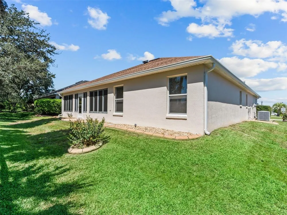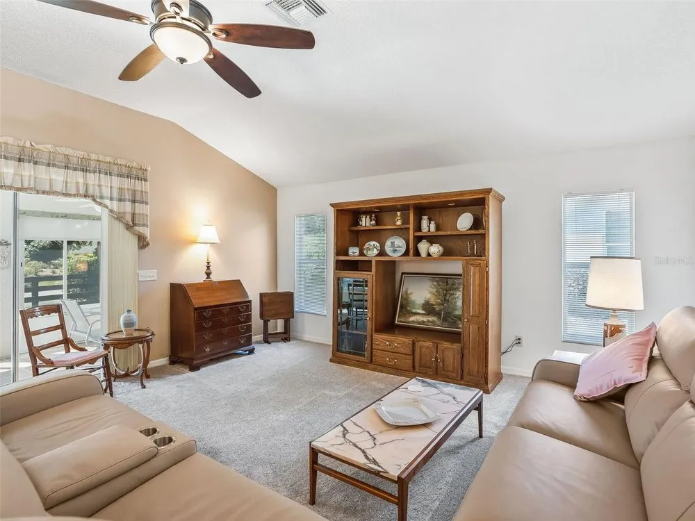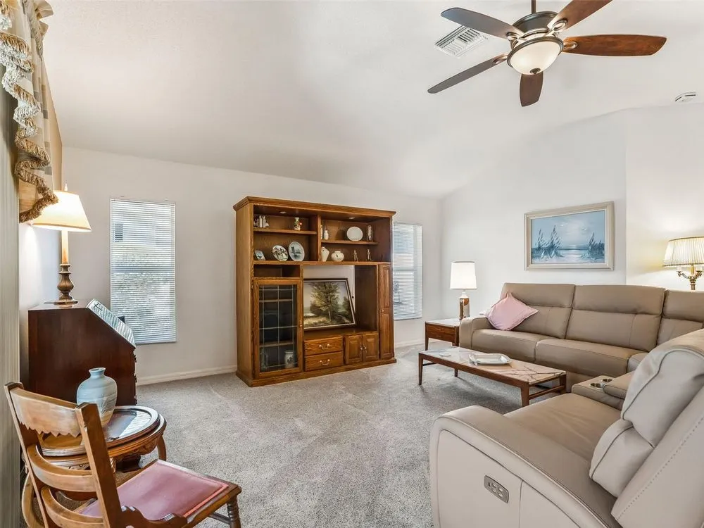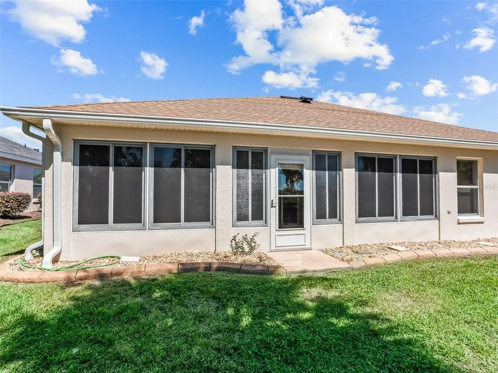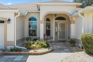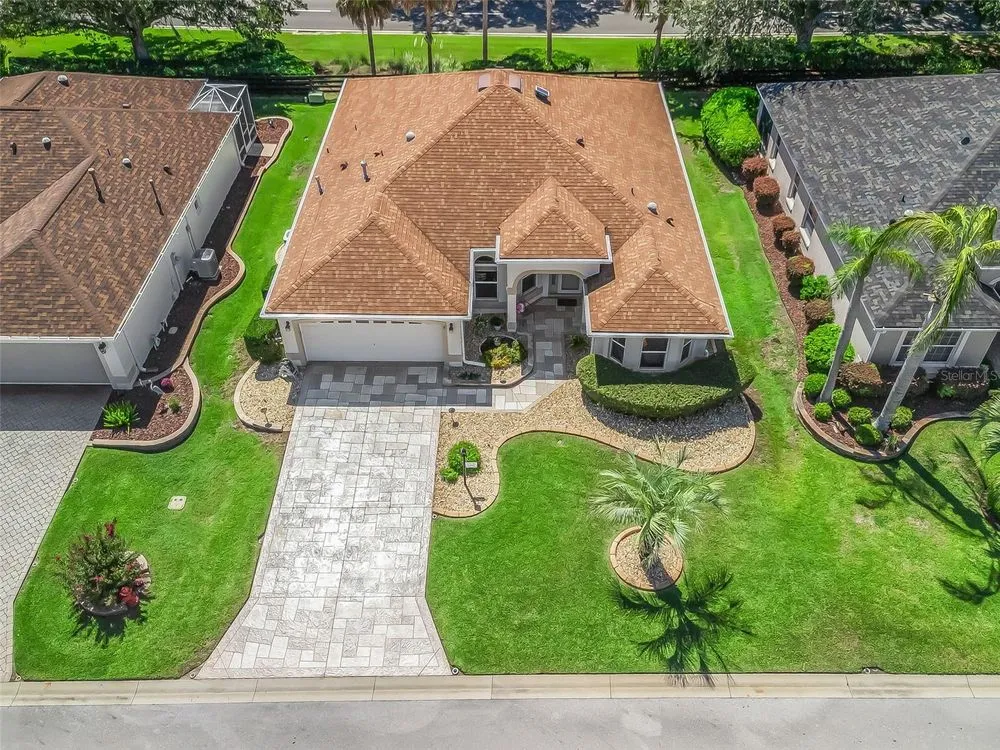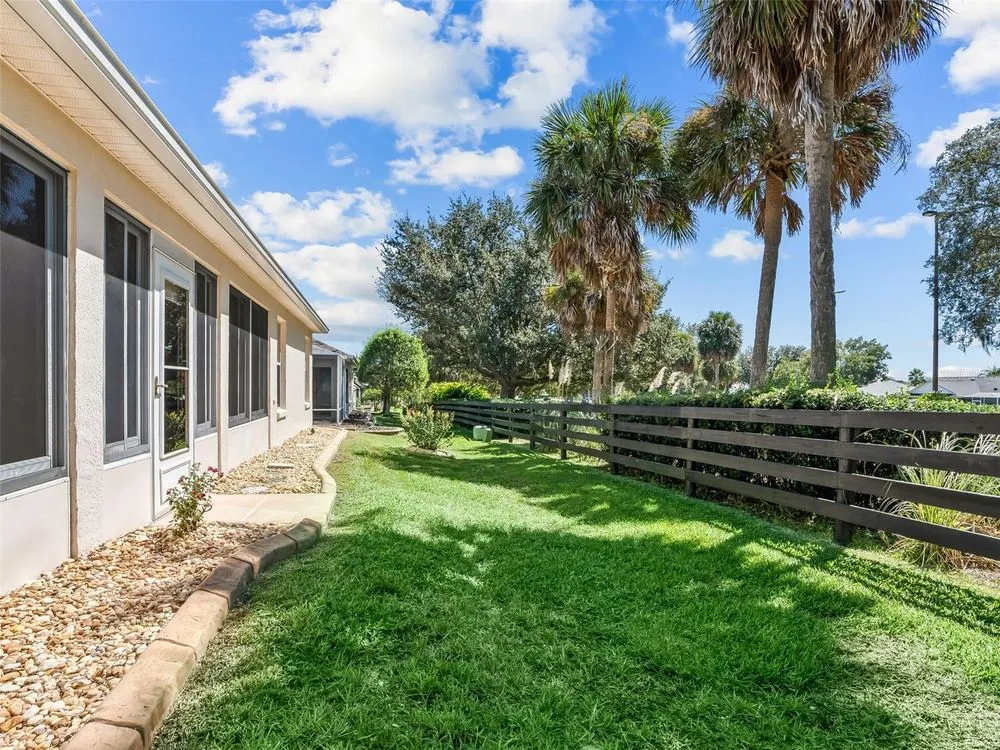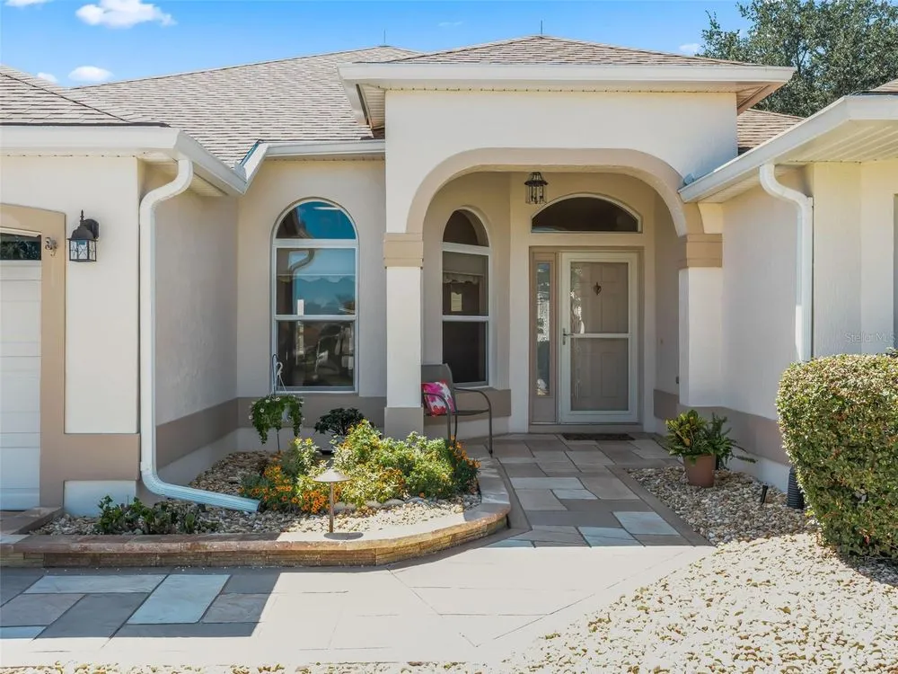 Beautiful One-Owner 3/2 Magnolia Model in the Village of Springdale! You’ll be impressed from the moment you arrive at this Block & Stucco Magnolia Designer Home, featuring stunning curb appeal with a Stamped Concrete Driveway and Walkway, professionally landscaped grounds, curbing-framed rock beds, palm tree, and shrubs for a true Florida feel. Inside, a welcoming foyer with tile flooring opens to a bright, open floor plan highlighted by Vaulted Ceilings and abundant natural light. The split floor plan offers ideal separation for family and guests. The Primary Ensuite includes Vaulted ceilings, his-and-hers walk-in closets, large linen closet, double vanities, and an updated step-in shower with seat. A sliding glass door leads directly to the lanai for your morning coffee retreat. The Guest Suite includes 2 bedrooms, a full bath with tub/shower combo-solar tube, and a hall linen closet. The front guest room (no closet) is furnished with a wall/Murphy bed, making it a flexible space for an office, den, or guest room. The Kitchen is a chef’s delight with Granite counters, Tile backsplash, Oak Cabinets with pull-outs, Stainless Appliances, French Door Refrigerator, Natural Gas Range, Recessed Lighting, Breakfast Bar, and sunny breakfast nook. The dining room is accented with architectural columns, while the living area opens to the enclosed lanai through sliding glass doors, extending your entertaining space. Enjoy the enclosed lanai with roll-up shades, ideal for year-round relaxation and a private backyard with no homes behind—perfect for peace and privacy. Additional features include: Inside laundry with Kenmore front-load washer/dryer, cabinets, solar tube and utility sink; Garage with pull-down attic stairs; 2014 Gas Yamaha Golf Cart INCLUDED. Roof (2020) HVAC (2014) Located just a short golf cart ride to the Springdale Pool, Dog Park, Mulberry Grove Regional Recreation Center, Nancy Lopez Country Club, First Responders Recreation Center, and Mulberry Grove Shopping Center with grocery, medical, VA clinic, dining, and more! Entertainment at Savannah Center and dining at Nancy Lopez Legacy and Glen View Country Clubs are just minutes away. This home is MOSTLY FURNISHED, move-in ready, available for a quick close, and waiting for you to start enjoying The Villages lifestyle today! Room Measurements and Square Footage are approximate and should be verified by buyer/buyer’s agent. All information is deemed reliable but not guaranteed.