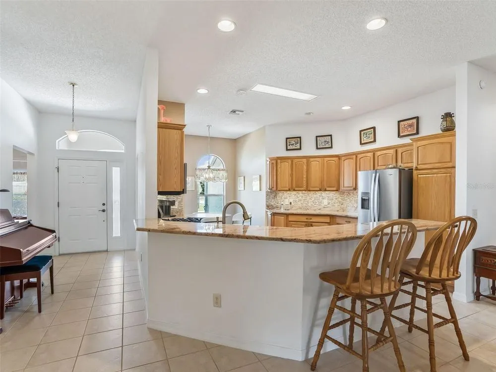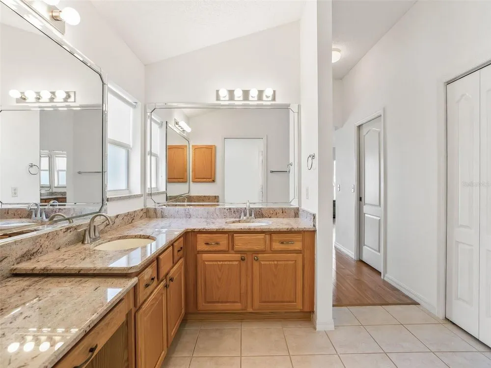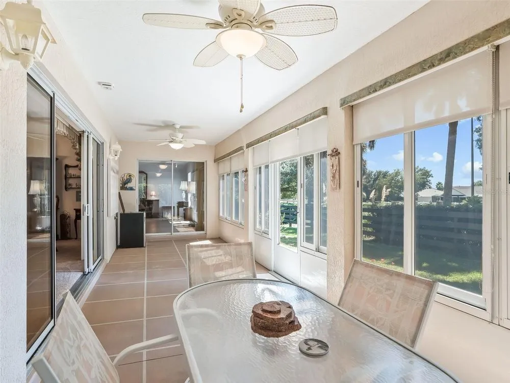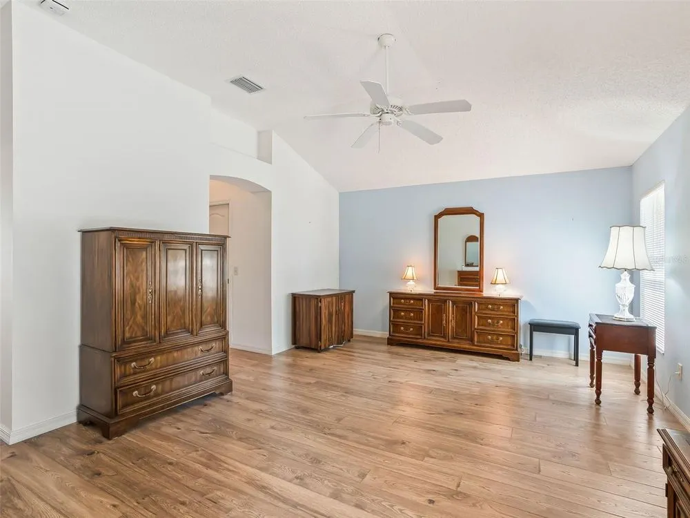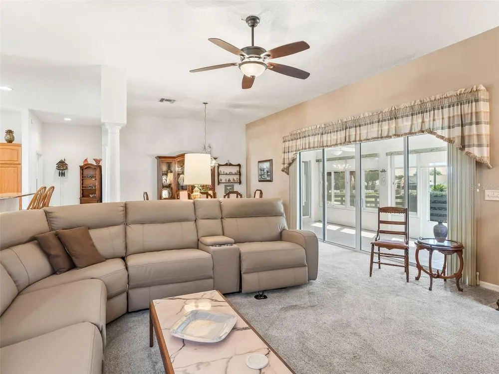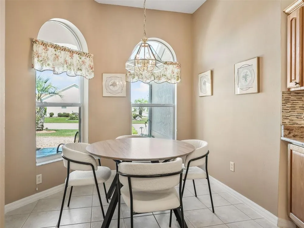 Beautiful One-Owner 3/2 Magnolia Model in the Village of Springdale! You’ll be impressed from the moment you arrive at this Block & Stucco Magnolia Designer Home, featuring stunning curb appeal with a Stamped Concrete Driveway and Walkway, professionally landscaped grounds, curbing-framed rock beds, palm tree, and shrubs for a true Florida feel. Inside, a welcoming foyer with tile flooring opens to a bright, open floor plan highlighted by Vaulted Ceilings and abundant natural light. The split floor plan offers ideal separation for family and guests. The Primary Ensuite includes Vaulted ceilings, his-and-hers walk-in closets, large linen closet, double vanities, and an updated step-in shower with seat. A sliding glass door leads directly to the lanai for your morning coffee retreat. The Guest Suite includes 2 bedrooms, a full bath with tub/shower combo-solar tube, and a hall linen closet. The front guest room (no closet) is furnished with a wall/Murphy bed, making it a flexible space for an office, den, or guest room. The Kitchen is a chef’s delight with Granite counters, Tile backsplash, Oak Cabinets with pull-outs, Stainless Appliances, French Door Refrigerator, Natural Gas Range, Recessed Lighting, Breakfast Bar, and sunny breakfast nook. The dining room is accented with architectural columns, while the living area opens to the enclosed lanai through sliding glass doors, extending your entertaining space. Enjoy the enclosed lanai with roll-up shades, ideal for year-round relaxation and a private backyard with no homes behind—perfect for peace and privacy. Additional features include: Inside laundry with Kenmore front-load washer/dryer, cabinets, solar tube and utility sink; Garage with pull-down attic stairs; 2014 Gas Yamaha Golf Cart INCLUDED. Roof (2020) HVAC (2014) Located just a short golf cart ride to the Springdale Pool, Dog Park, Mulberry Grove Regional Recreation Center, Nancy Lopez Country Club, First Responders Recreation Center, and Mulberry Grove Shopping Center with grocery, medical, VA clinic, dining, and more! Entertainment at Savannah Center and dining at Nancy Lopez Legacy and Glen View Country Clubs are just minutes away. This home is MOSTLY FURNISHED, move-in ready, available for a quick close, and waiting for you to start enjoying The Villages lifestyle today! Room Measurements and Square Footage are approximate and should be verified by buyer/buyer’s agent. All information is deemed reliable but not guaranteed.