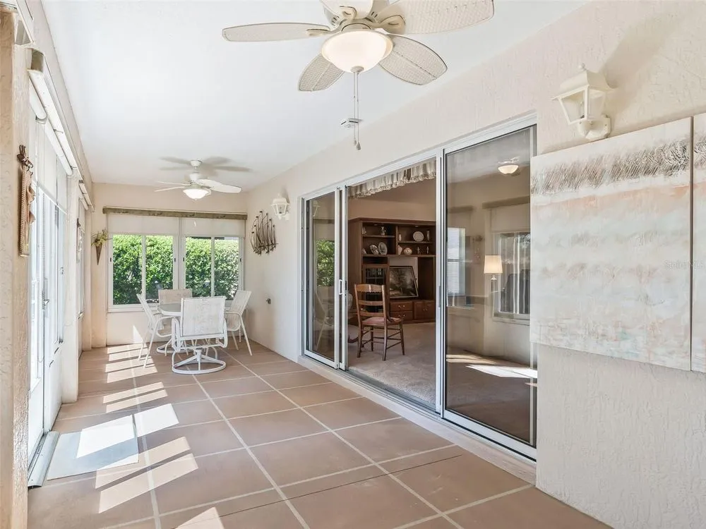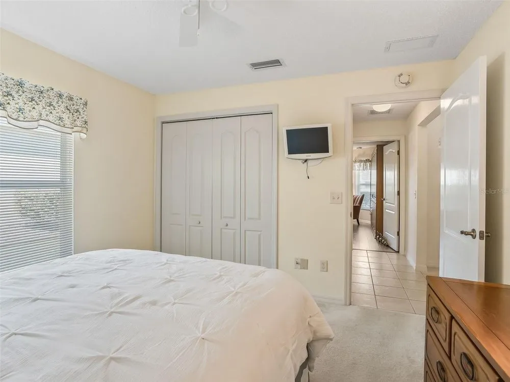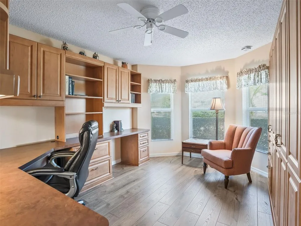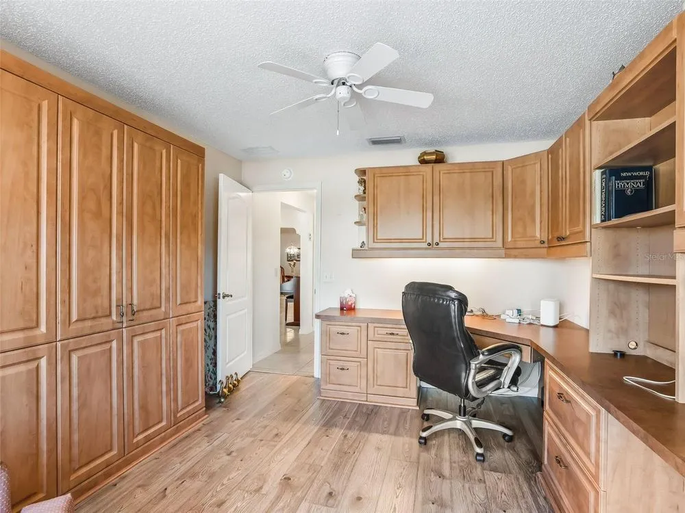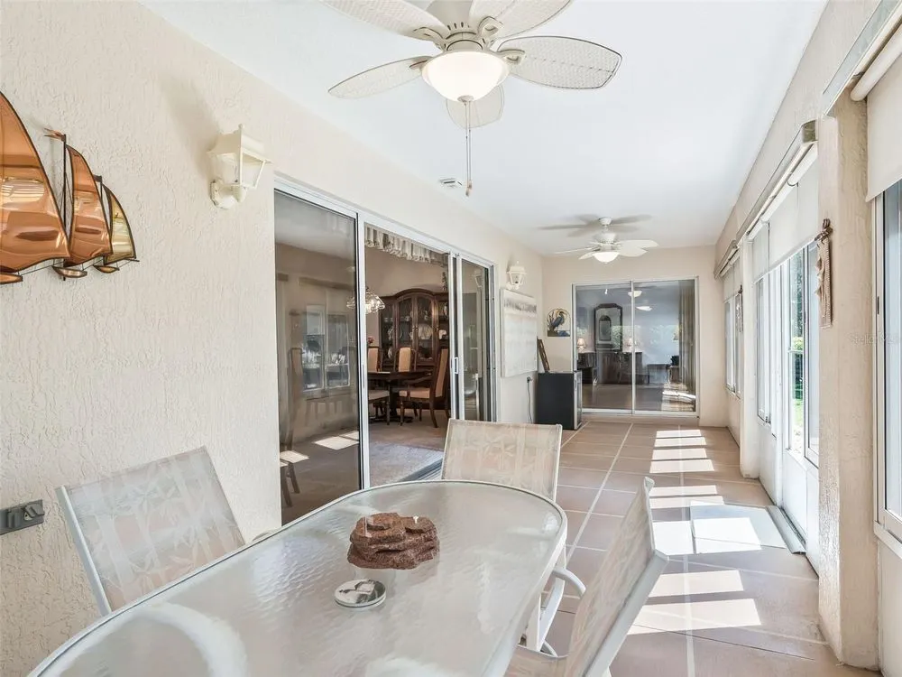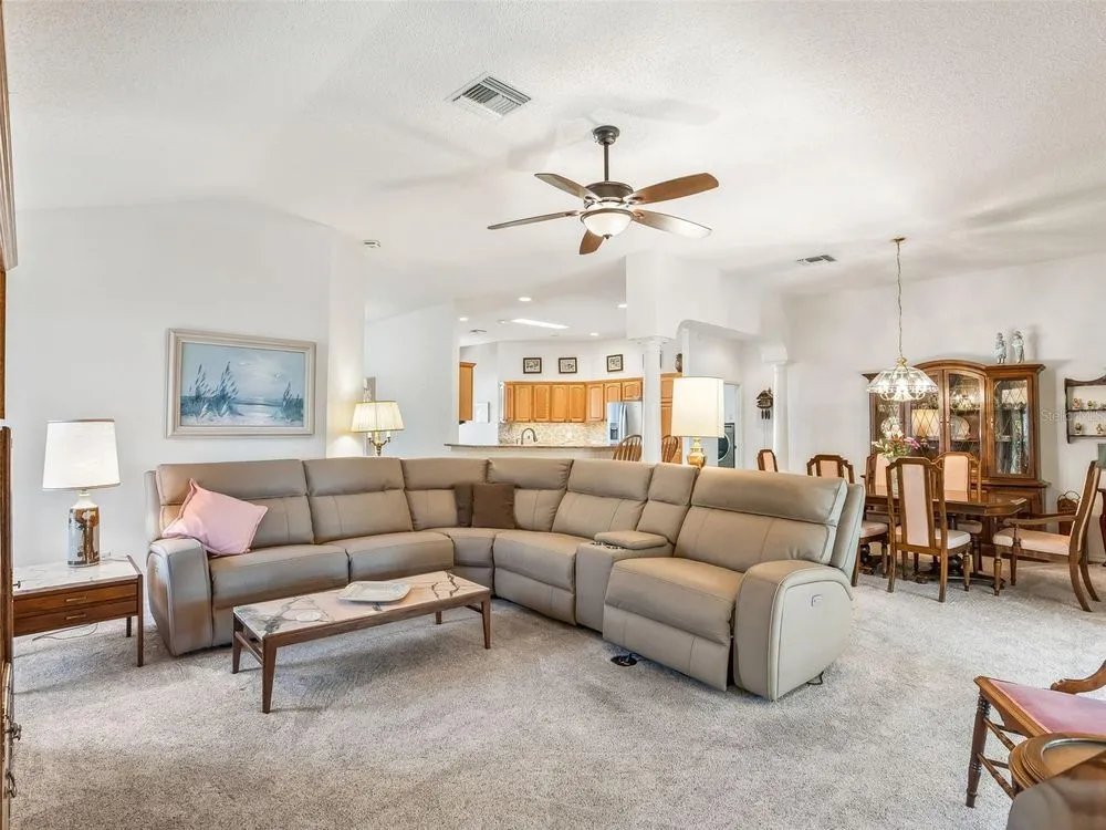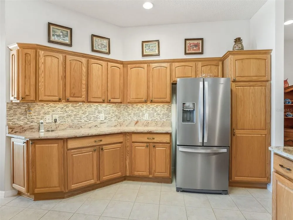 Beautiful One-Owner 3/2 Magnolia Model in the Village of Springdale! You’ll be impressed from the moment you arrive at this Block & Stucco Magnolia Designer Home, featuring stunning curb appeal with a Stamped Concrete Driveway and Walkway, professionally landscaped grounds, curbing-framed rock beds, palm tree, and shrubs for a true Florida feel. Inside, a welcoming foyer with tile flooring opens to a bright, open floor plan highlighted by Vaulted Ceilings and abundant natural light. The split floor plan offers ideal separation for family and guests. The Primary Ensuite includes Vaulted ceilings, his-and-hers walk-in closets, large linen closet, double vanities, and an updated step-in shower with seat. A sliding glass door leads directly to the lanai for your morning coffee retreat. The Guest Suite includes 2 bedrooms, a full bath with tub/shower combo-solar tube, and a hall linen closet. The front guest room (no closet) is furnished with a wall/Murphy bed, making it a flexible space for an office, den, or guest room. The Kitchen is a chef’s delight with Granite counters, Tile backsplash, Oak Cabinets with pull-outs, Stainless Appliances, French Door Refrigerator, Natural Gas Range, Recessed Lighting, Breakfast Bar, and sunny breakfast nook. The dining room is accented with architectural columns, while the living area opens to the enclosed lanai through sliding glass doors, extending your entertaining space. Enjoy the enclosed lanai with roll-up shades, ideal for year-round relaxation and a private backyard with no homes behind—perfect for peace and privacy. Additional features include: Inside laundry with Kenmore front-load washer/dryer, cabinets, solar tube and utility sink; Garage with pull-down attic stairs; 2014 Gas Yamaha Golf Cart INCLUDED. Roof (2020) HVAC (2014) Located just a short golf cart ride to the Springdale Pool, Dog Park, Mulberry Grove Regional Recreation Center, Nancy Lopez Country Club, First Responders Recreation Center, and Mulberry Grove Shopping Center with grocery, medical, VA clinic, dining, and more! Entertainment at Savannah Center and dining at Nancy Lopez Legacy and Glen View Country Clubs are just minutes away. This home is MOSTLY FURNISHED, move-in ready, available for a quick close, and waiting for you to start enjoying The Villages lifestyle today! Room Measurements and Square Footage are approximate and should be verified by buyer/buyer’s agent. All information is deemed reliable but not guaranteed.