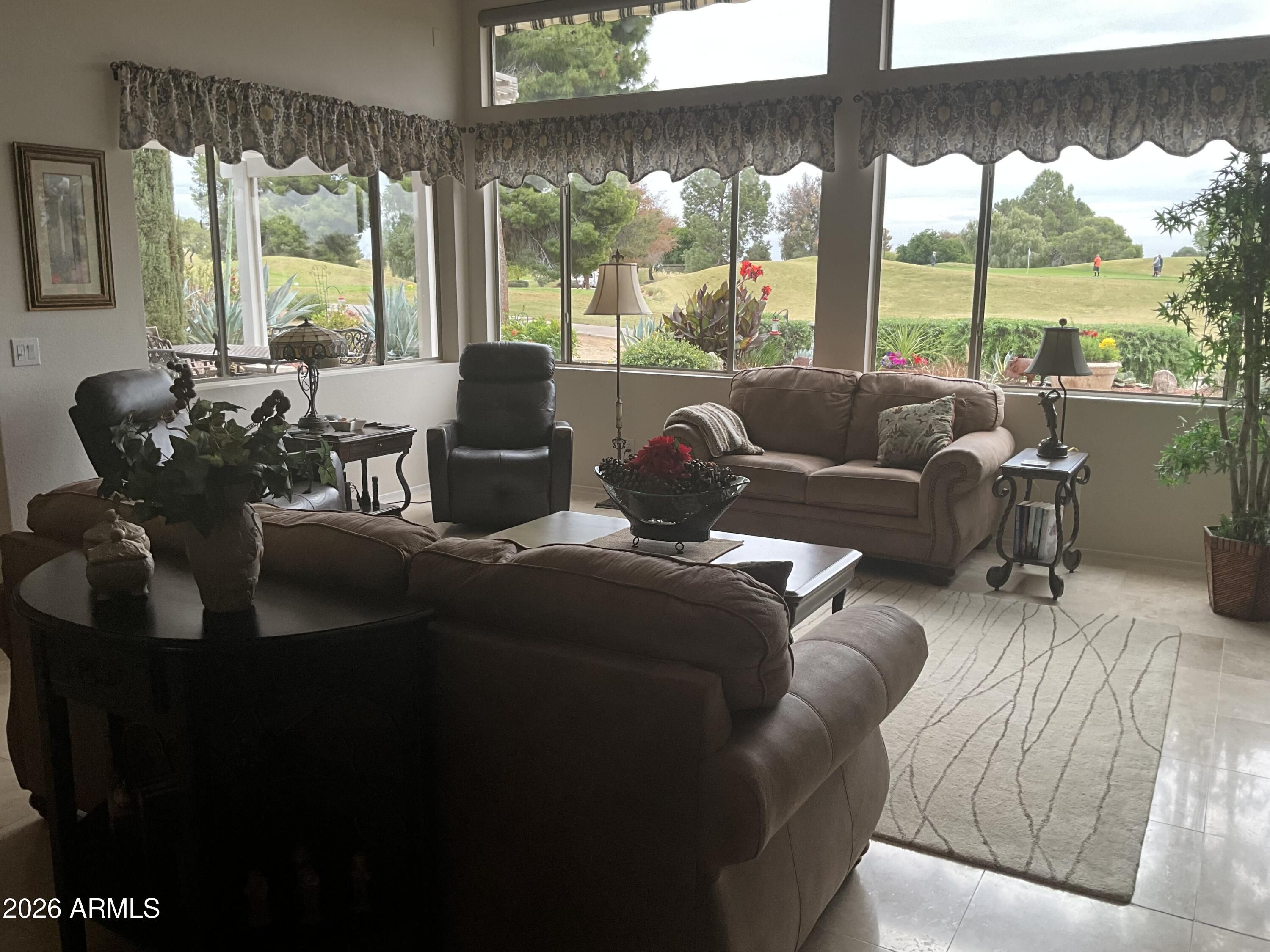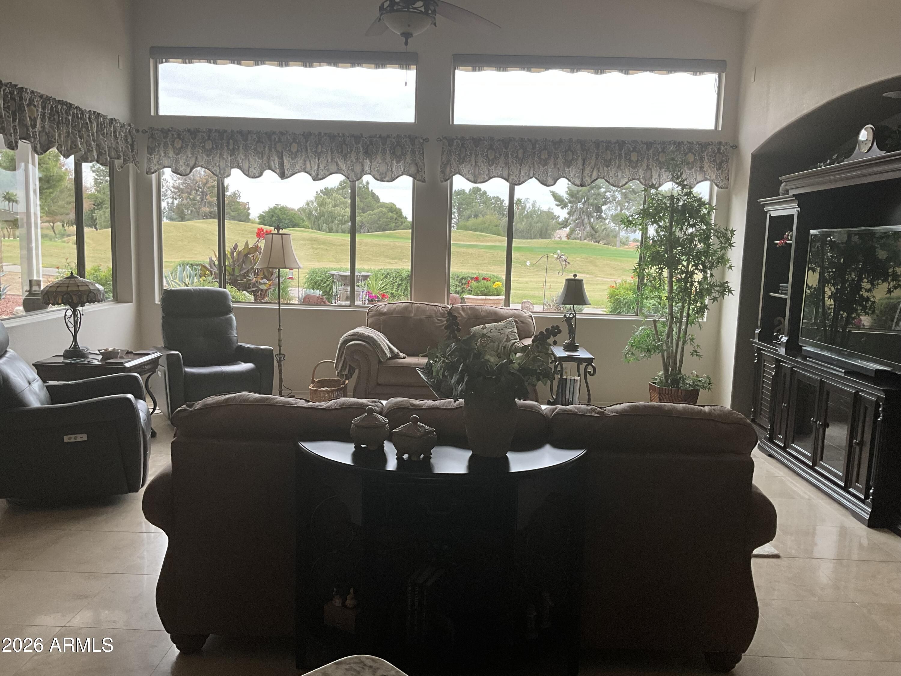 Location, Location, Location! This beautifully situated home rests on a premier golf course lot within a 55+ community offering sweeping views across multiple fairways and the majestic White Tank Mountains. Mature, attractive landscaping surrounds the home, creating a peaceful retreat while still being close to shopping, dining, and conveniences in the desirable Northwest Valley. Inside, soaring 15-foot vaulted ceilings and nearly an entire wall of viewing windows fill the home with natural light and perfectly frame the stunning outdoor scenery. The open design creates an inviting atmosphere for everyday living and entertaining. Enjoy Arizona living at its best with granite tile patios in both the front and rear,