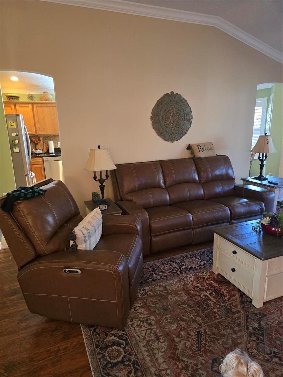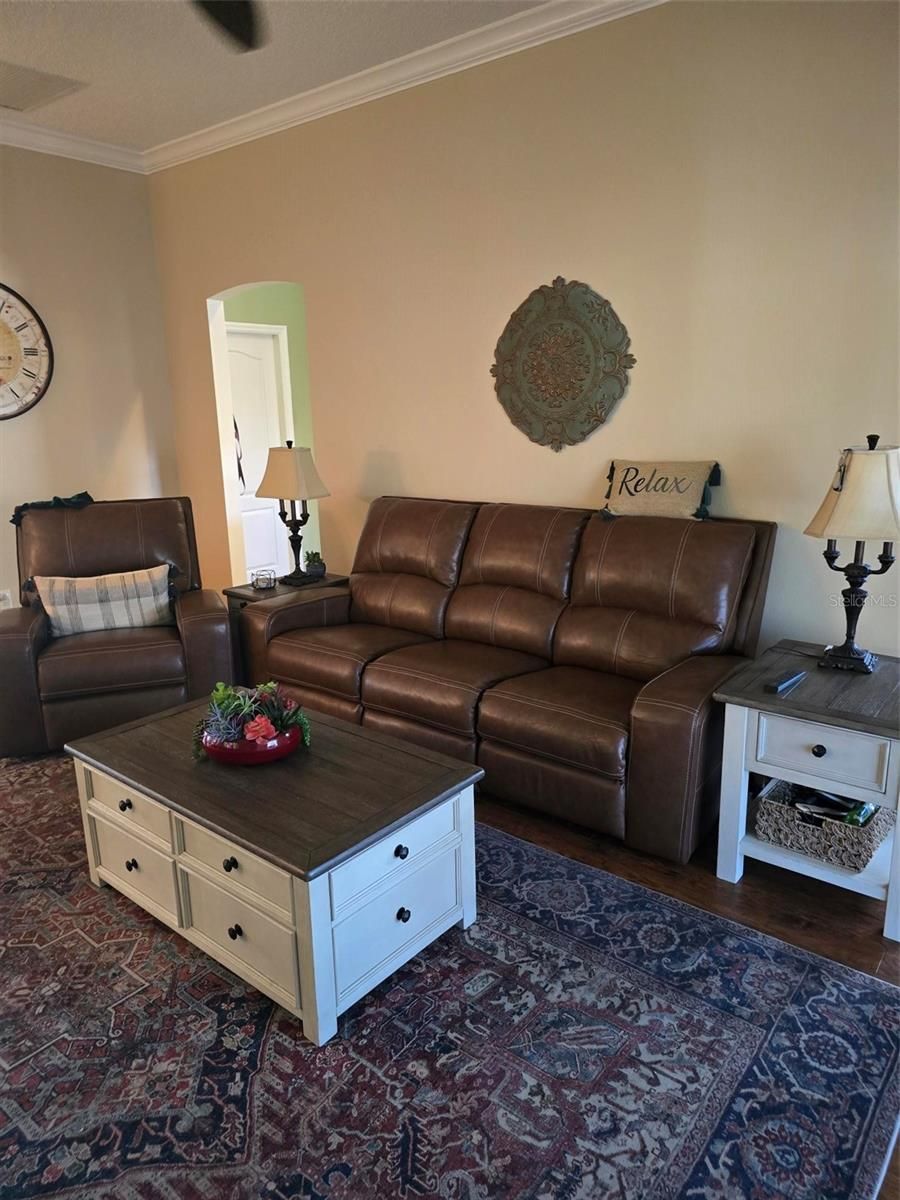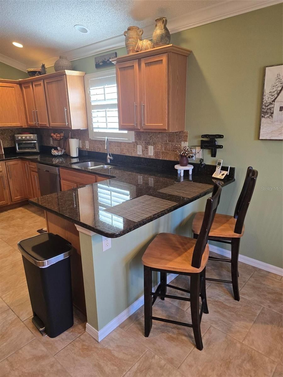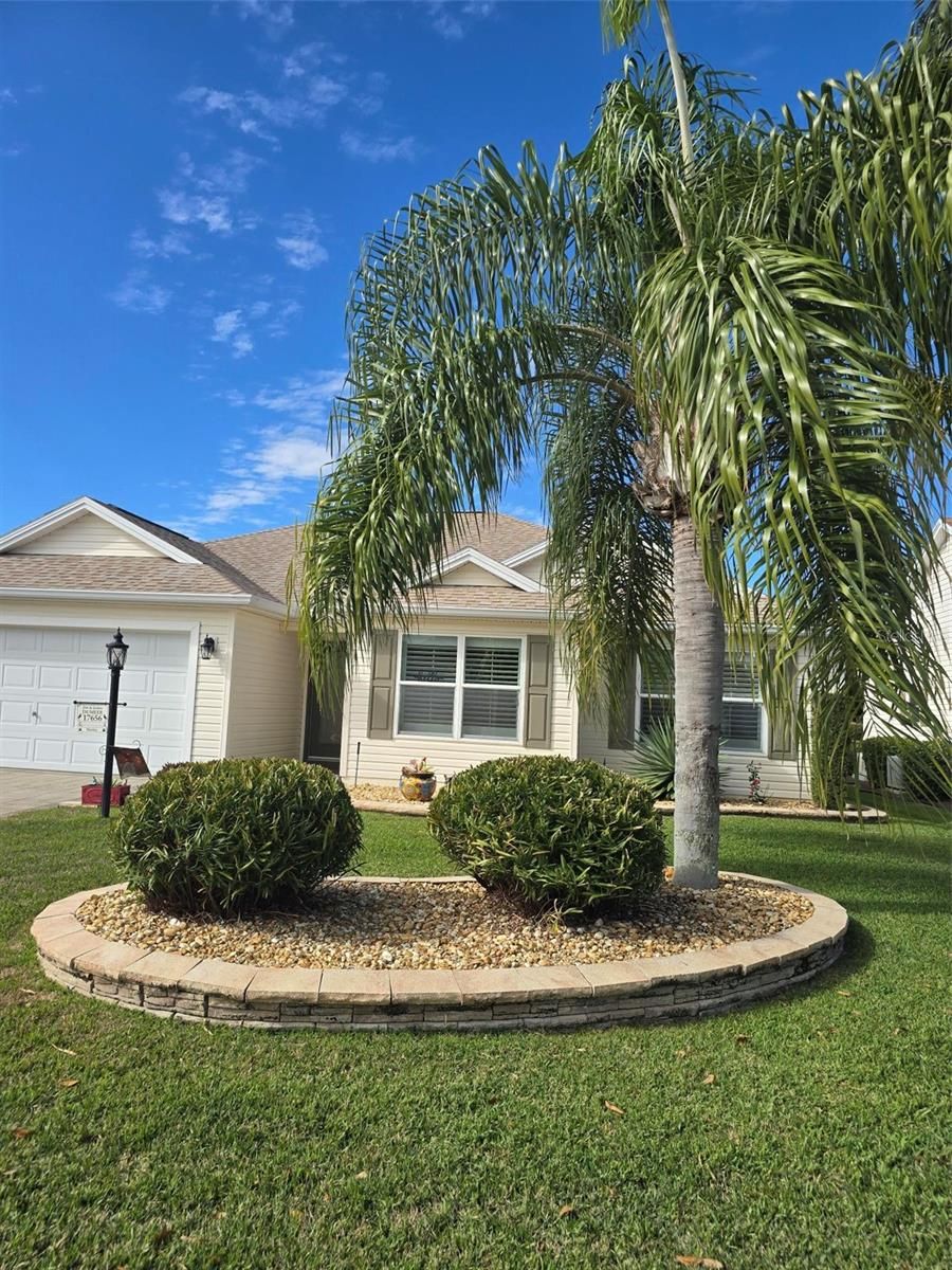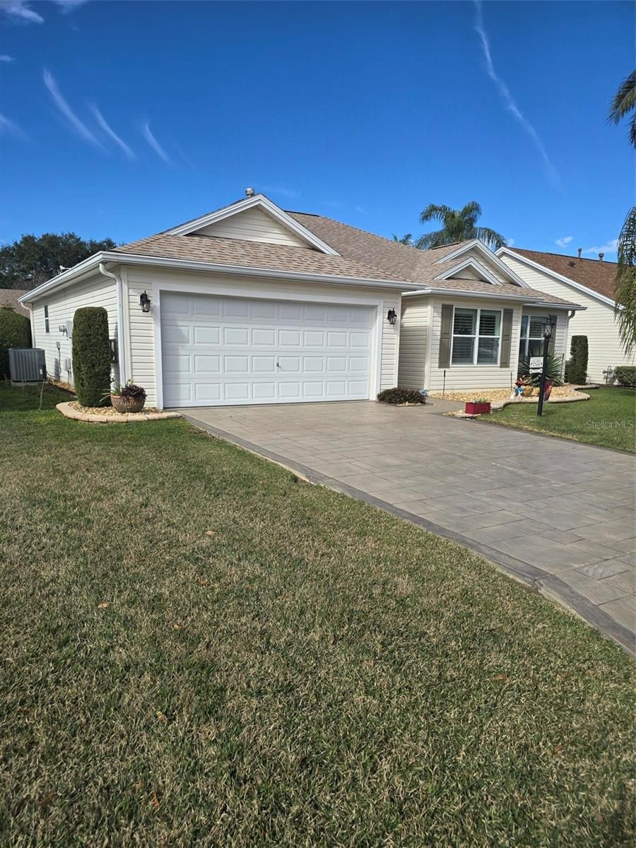 CHARMING 3/2 WHISPERING PINE DESIGNER in the VILLAGE OF PIEDMONT - convenient to Mulberry Grove shopping area and Nancy Lopez Country Club. LOVELY entrance with a stamped driveway and wonderful curb appeal with STACK ROCK walls, palms and shrubs. LAMINATE flooring (NO CARPET in this home) and CROWN MOLDING throughout. The spacious kitchen has HONEY OAK cabinets w/crown molding, hardware & pull-out drawers, GRANITE counter tops, TILE back splash, breakfast bar, large TILE flooring and a convenient casual dining area with lovely bay window. The updated STAINLESS appliances include a FRENCH DOOR refrigerator with bottom freezer, beautiful 5 burner GAS range, dishwasher and mounted microwave. The spacious living room has PLANTATION SHUTTERS covering the sliding glass doors that lead to your ENCLOSED lanai with TINTED Windows and TILED flooring, a great place to sit and enjoy your morning coffee with privacy landscaping. A nice patio off the lanai is great for your grill. The master bedroom features a walk-in closet, vaulted ceiling, PLANTATION SHUTTERS and en-suite bath with GRANITE countertop w/DUAL SINKS and updated shower with FRAME-LESS GLASS DOORS. In the front of the home is your guest bedroom and guest bath with GRANITE countertop and tub/shower. Double French doors open to the 3rd bedroom/den (no closet). A NEW ROOF was installed in October 2019; NEW HVAC 2017 and NEWER LG WASHER & DRYER! Other GREAT FEATURES: vaulted ceilings, décor colors, CROWN MOLDING THROUGHOUT, PLANTATION SHUTTERS on the windows and sliding glass doors, NO BOND and more!!. Great location to shopping, restaurants, pools and golf courses … all the amenities of The Villages! GOLF CART is Negotiable.
