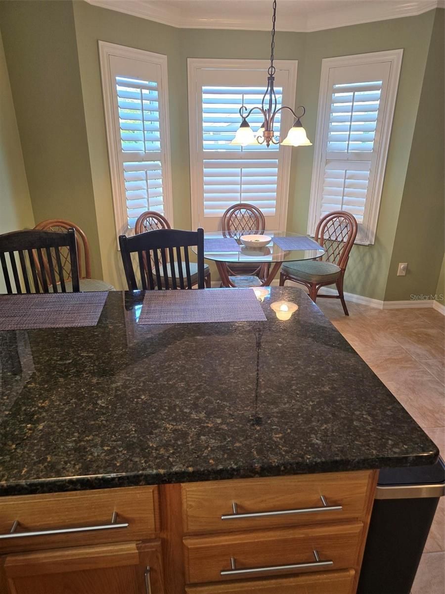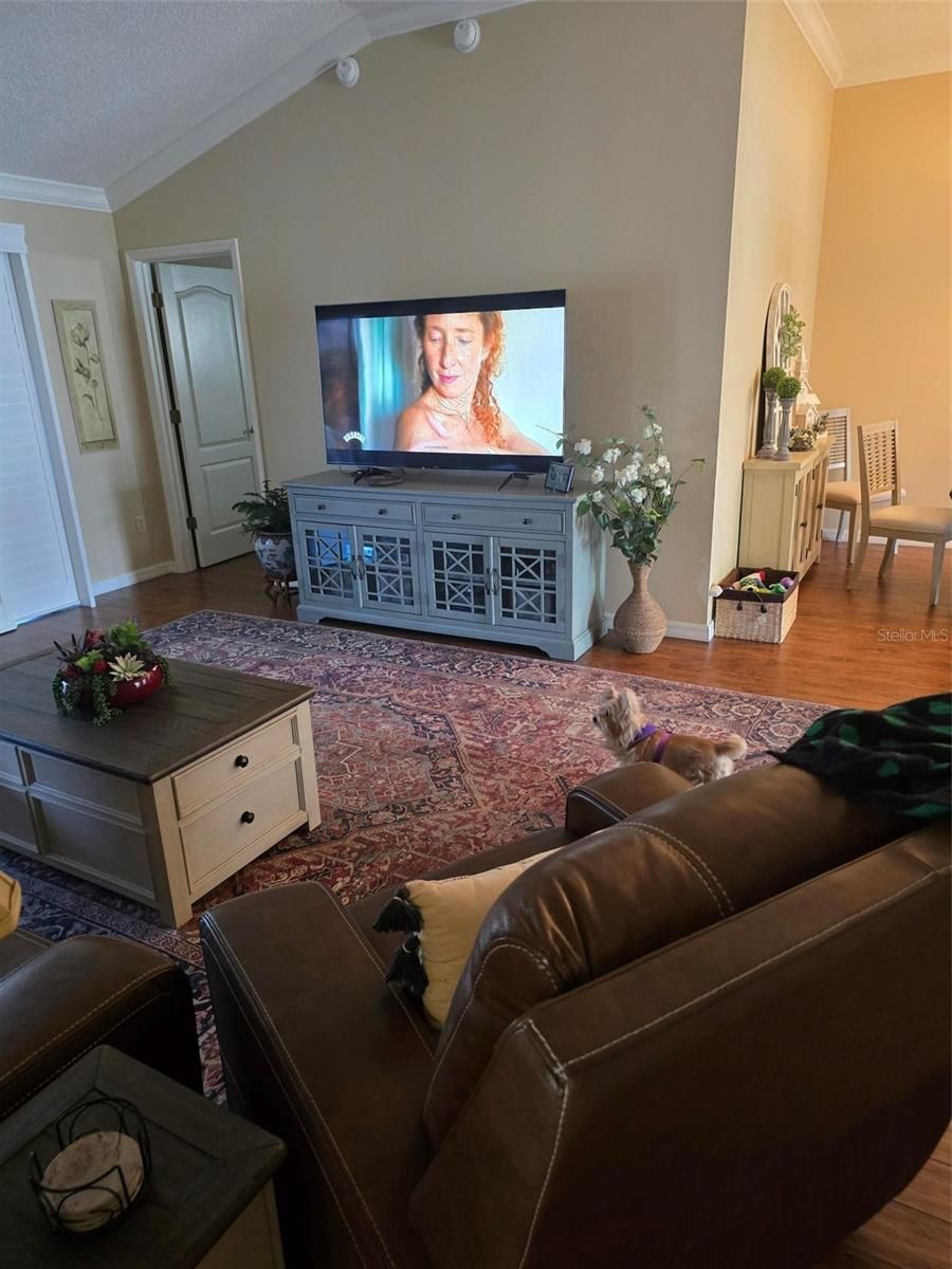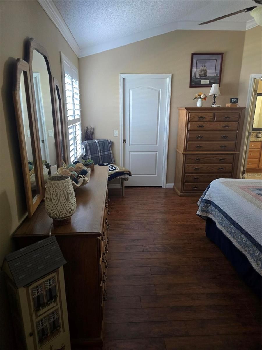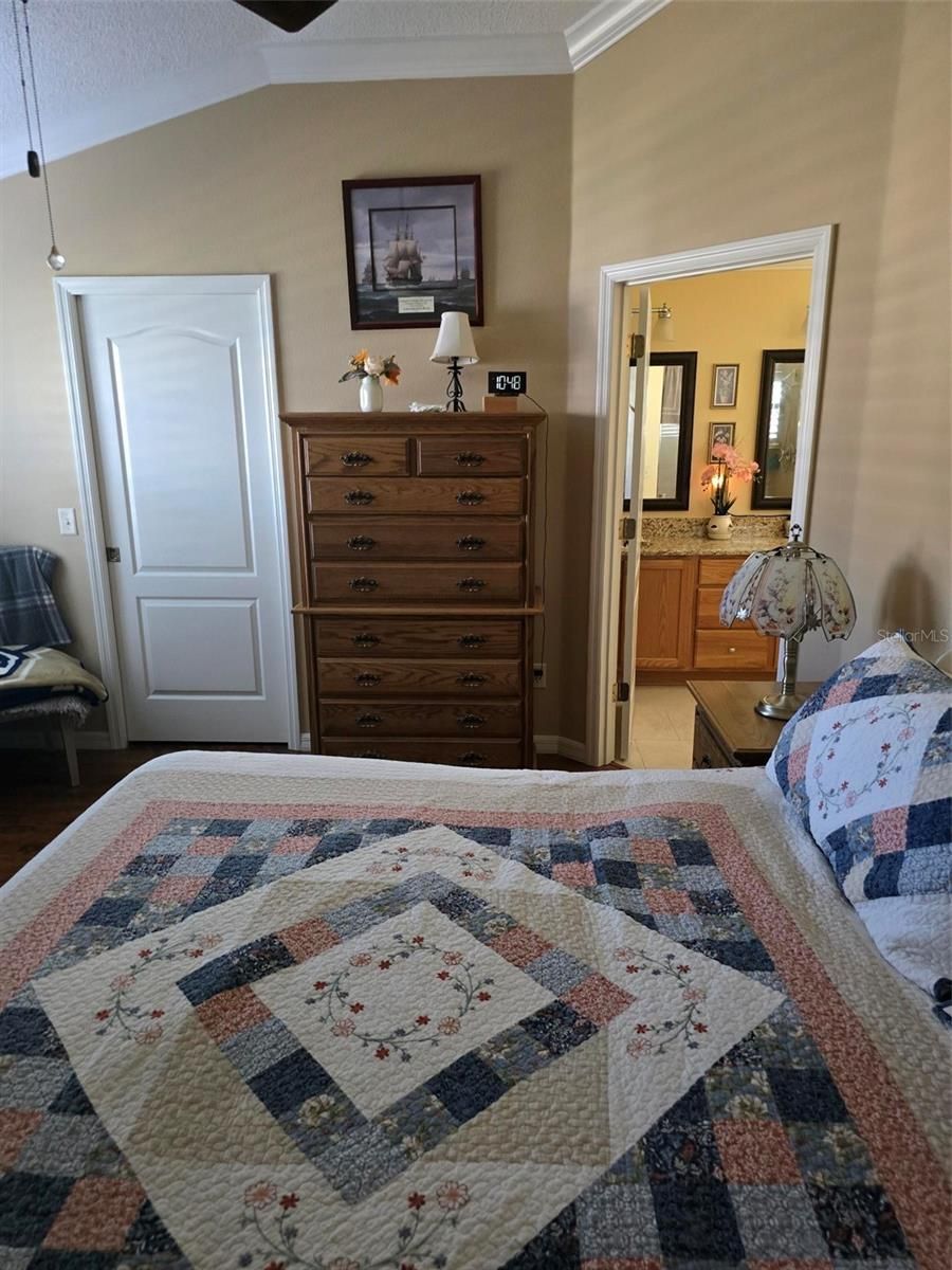 - Ceiling Fan(s), Eat-in Kitchen, High Ceilings, Living/Dining Room, Main Level Primary, Solid-Wood Cabinets, Stone Counters, Vaulted Ceiling(s), Walk-In Closet(s), Window Treatments