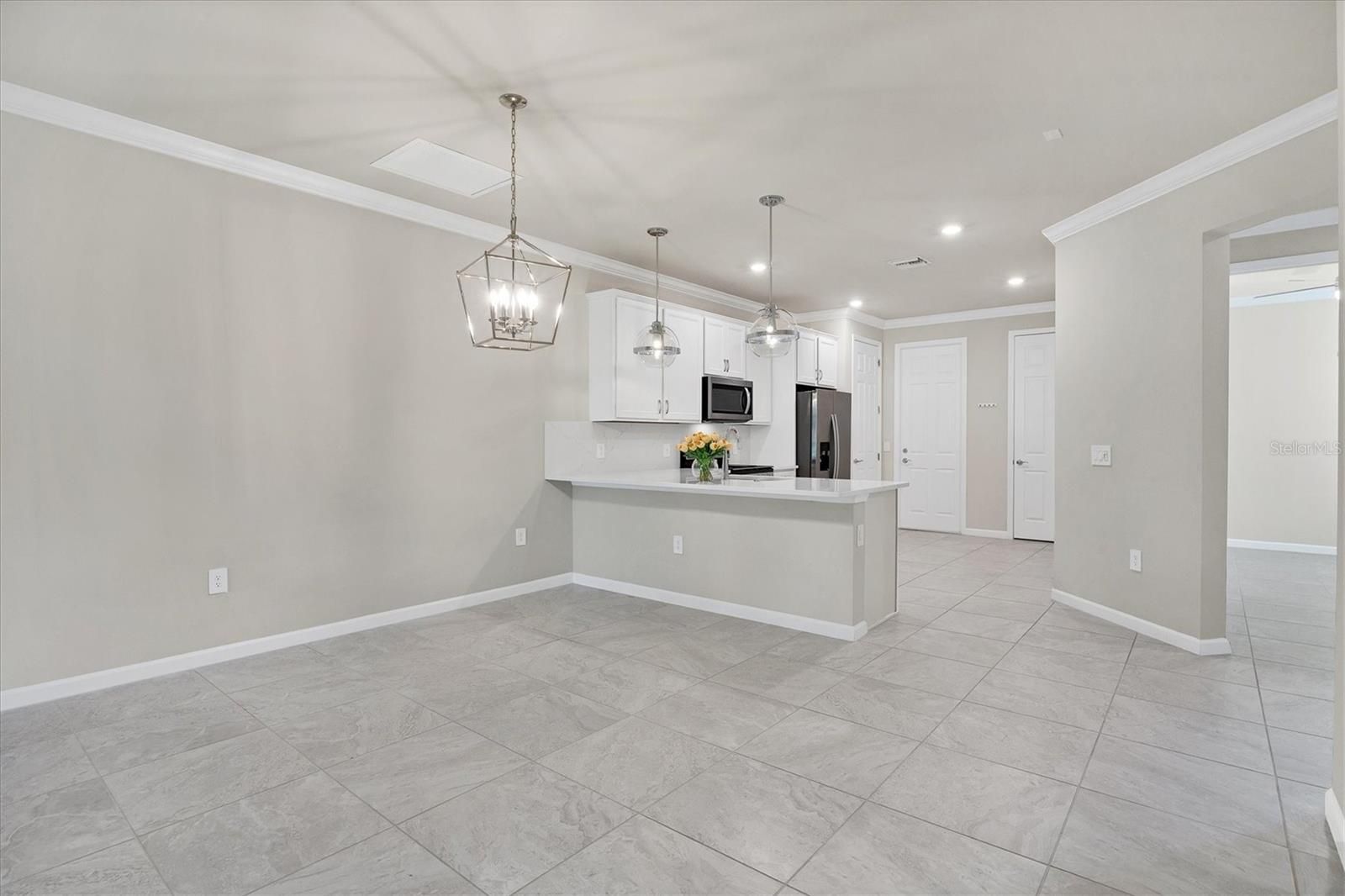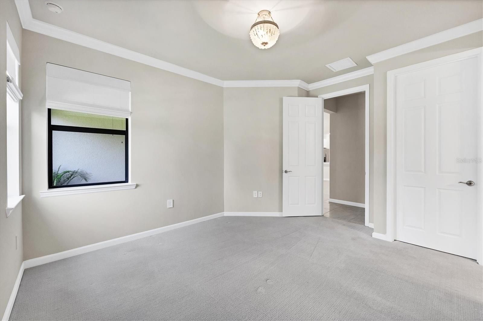 - Ceiling Fan(s), Crown Molding, Kitchen/Family Room Combo, Living/Dining Room, Open Floorplan, Main Level Primary, Solid Surface Counters, Solid-Wood Cabinets, Thermostat, Walk-In Closet(s), Window Treatments