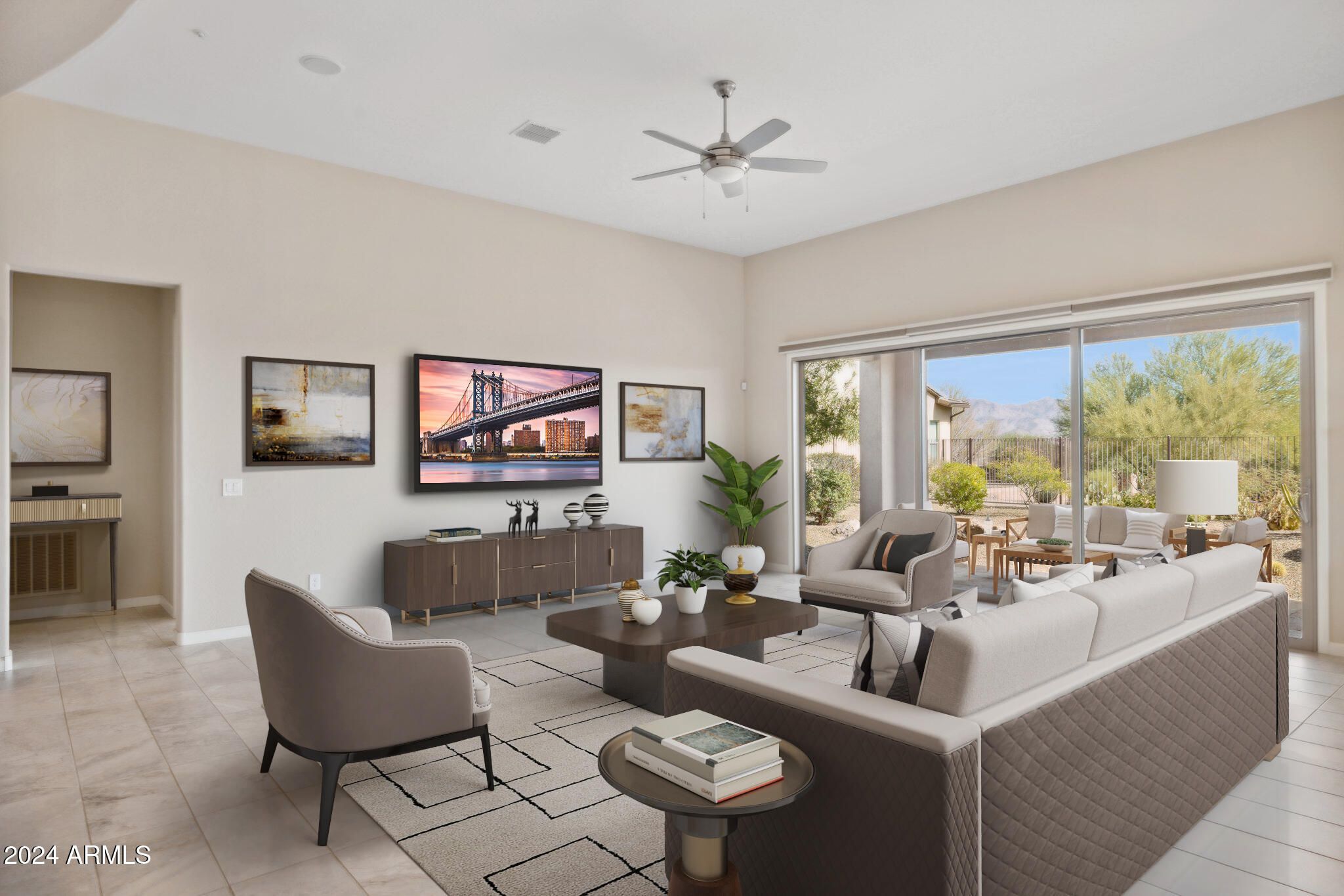 Welcome to your desert oasis in the heart of Trilogy at Verde River! This stunning 3-bedroom, 3.5-bathroom home is a true gem, boasting the popular Orion floor plan that's perfect for both relaxation and entertainment. As you step inside, you'll be greeted by neutral porcelain tile that flows seamlessly throughout the home, creating a cool and inviting atmosphere. Perched on a corner lot, this property offers mountain views, providing a picturesque backdrop for your daily life. The chef's kitchen is a culinary enthusiast's dream, featuring a huge center island and an abundance of cabinets with convenient pull-out drawers. Whip up gourmet meals while your guests mingle in the open-concept living area, or take the party outside to the built-in BBQ on the generous covered patio. The