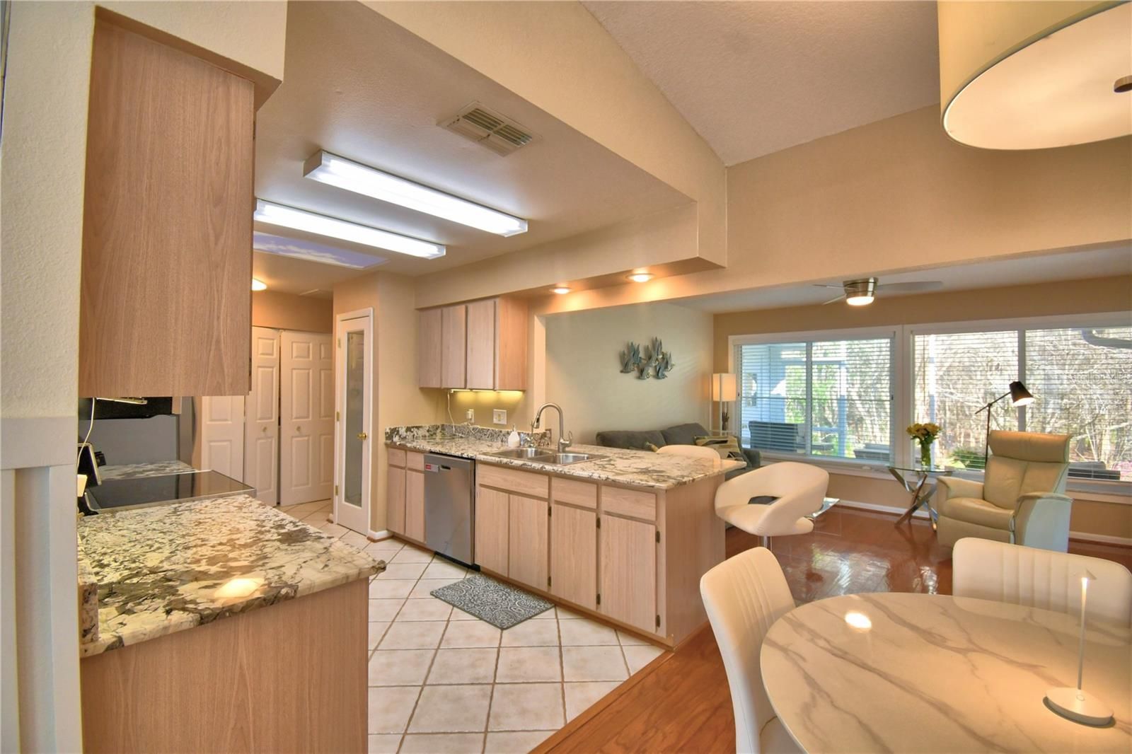 - Ceiling Fan(s), L-Shaped Dining Room, Open Floorplan, Solid Surface Counters, Split Bedrooms, Stone Counters, Thermostat, Vaulted Ceiling(s), Walk-In Closet(s), Window Treatments