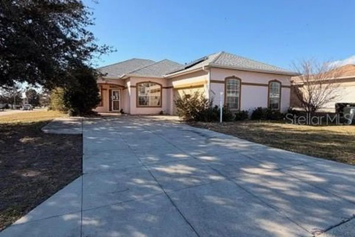 Bring your personal touch and make this the home of your dreams, located in a 55+ gated golf community with a community pool, pickleball courts and many, many other amenities! This 2 bedroom 2 bath home with an office boasts an open floor plan with large living room/dining area. Glass sliders off the living area open to an outside screened/covered lanai with an in-ground pool great for entertaining! The large master suite includes a walk in closet, soaking tub and walk in shower. This large corner lot is minutes away from The Villages and Highway 441, offering many nearby amenities. New roof, HVAC, and solar panels in 2020!!!