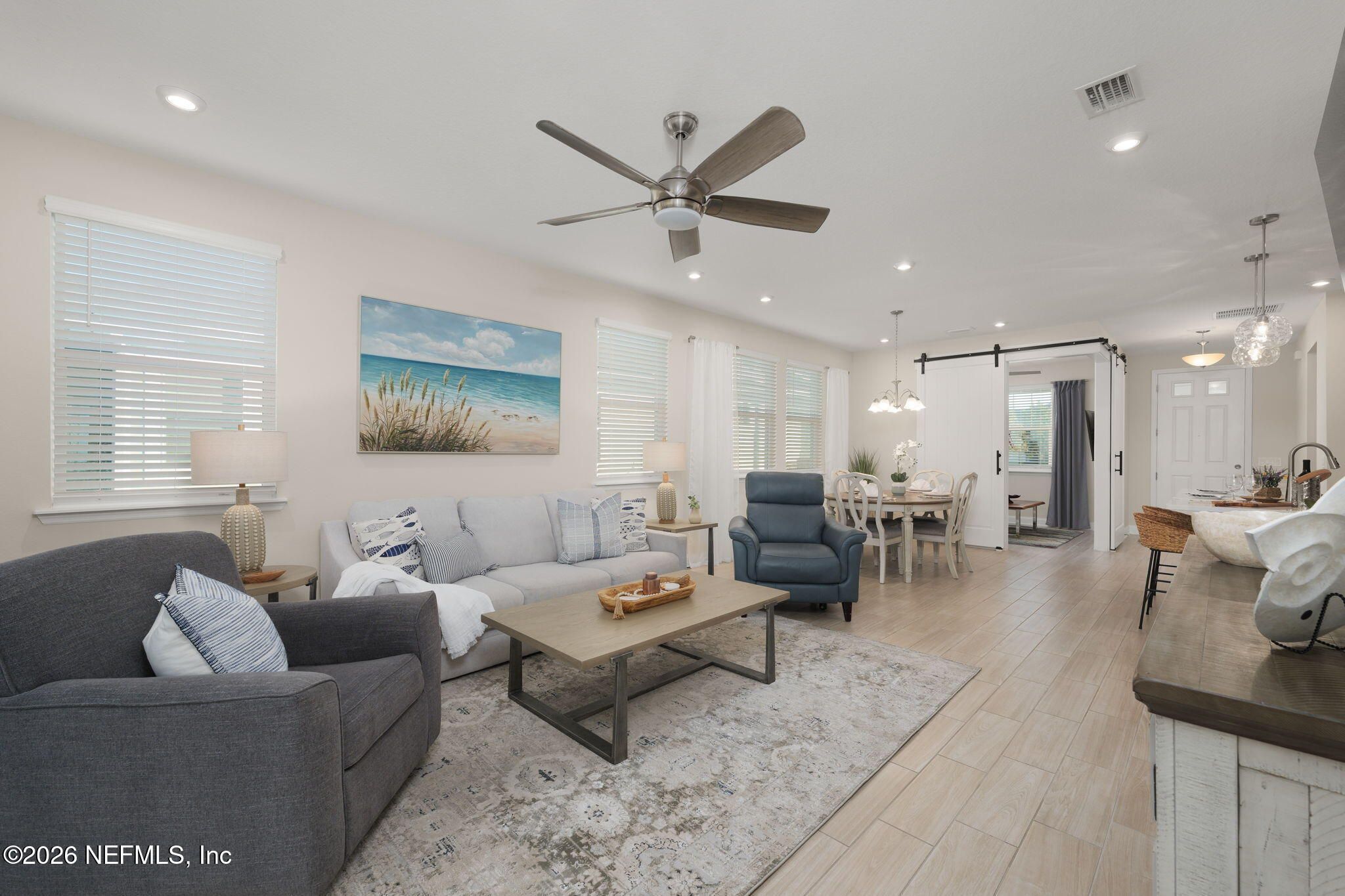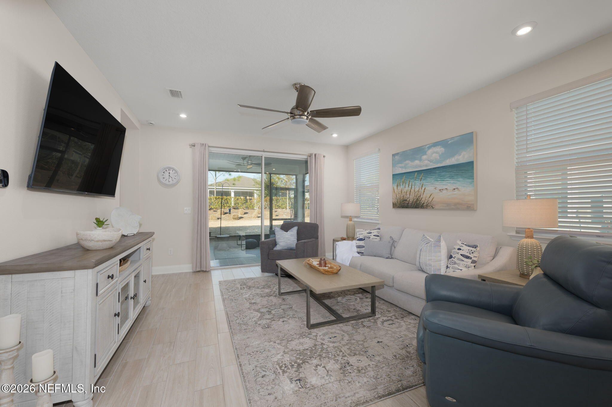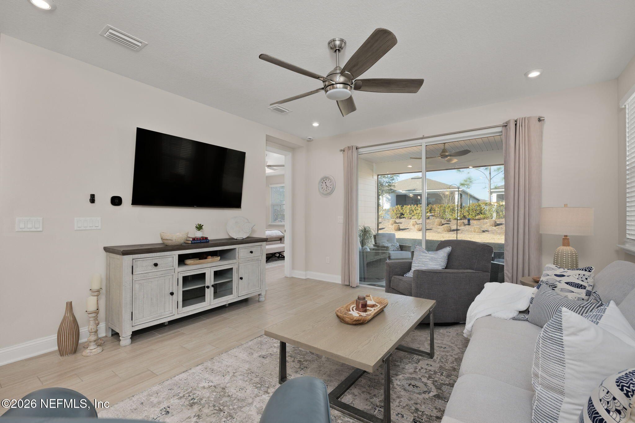 Step into effortless Florida living at 177 Fly Line Drive in WaterSong at Rivertown, where style, comfort, and convenience come together in one beautifully finished villa. Designed as a true lock and go home, this is the perfect fit for snowbirds, part time residents, or anyone who wants low maintenance living without sacrificing design and lifestyle. Inside, the light and bright open layout features 2 bedrooms, a den flex room with corner barn doors, and 2 baths, with natural sunlight pouring through the main living spaces to create a warm and inviting feel all day long. You will love the cohesive, upscale look of wood plank tile flooring throughout with no carpet, giving the home both durability and easy upkeep. Stylish custom touches elevate the interior, including a custom board and batten accent wall and shiplap at the tray ceiling in the primary bedroom, adding warmth, texture, and designer character. The kitchen is fresh and modern with a stylish subway tile backsplash, white quartz countertops, gas range, soft gray cabinetry with linear brushed nickel hardware, and a dining bar with seeded glass globe pendant lighting, ideal for everyday living and entertaining alike. This home is also thoughtfully upgraded with a whole house water filtration and water softener system, adding comfort and peace of mind to your daily routine. Outside, a screened lanai is perfect for enjoying morning coffee or relaxing evenings. Beyond your front door, WaterSong offers a welcoming lifestyle with amenities and social opportunities that make it easy to stay active, meet neighbors, and enjoy every season, including a pool, clubhouse, pickleball, dog park, miles of trails, golf cart paths, and biergarten. Close to shopping, dining, and world renowned medical facilities.