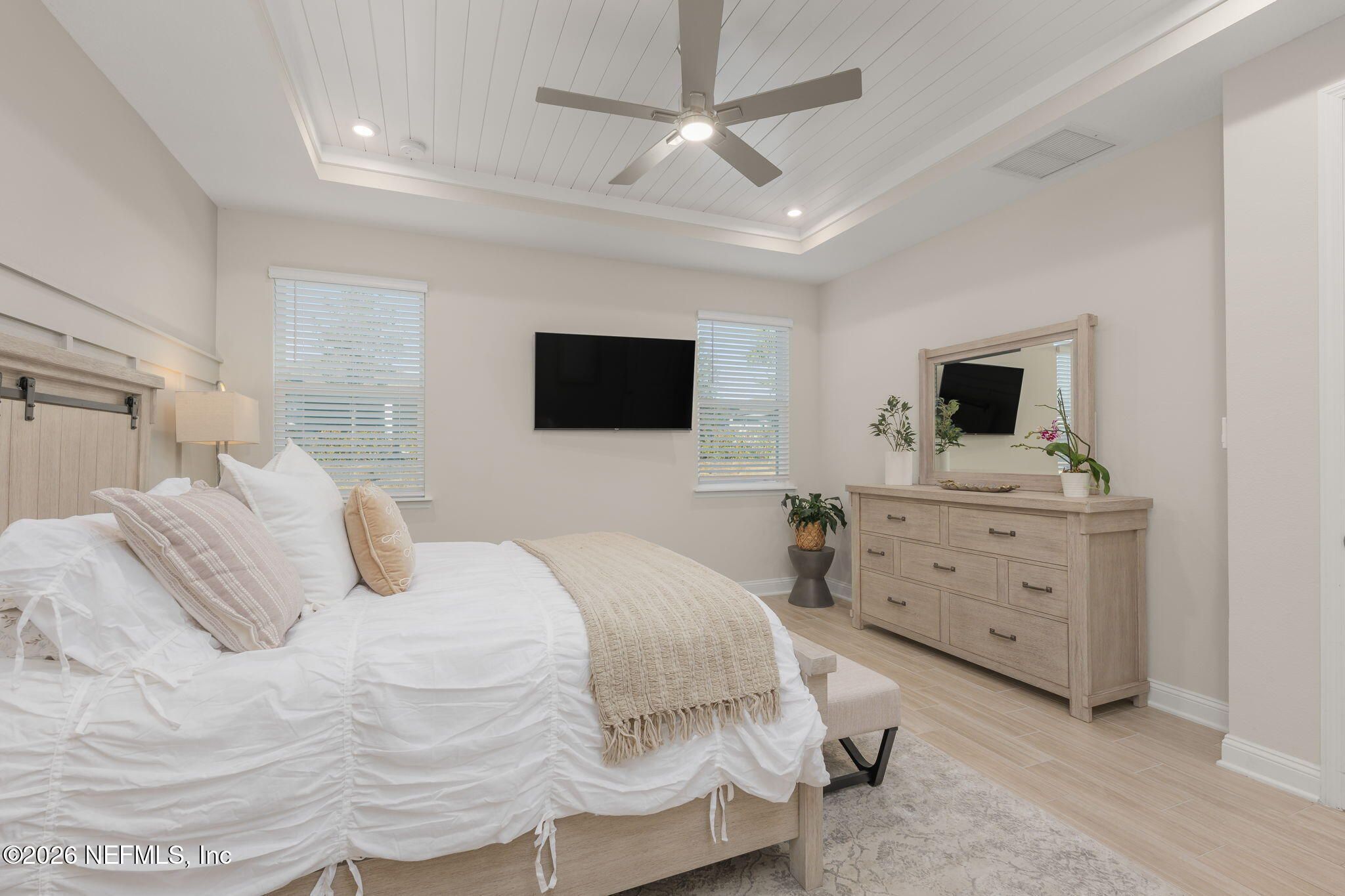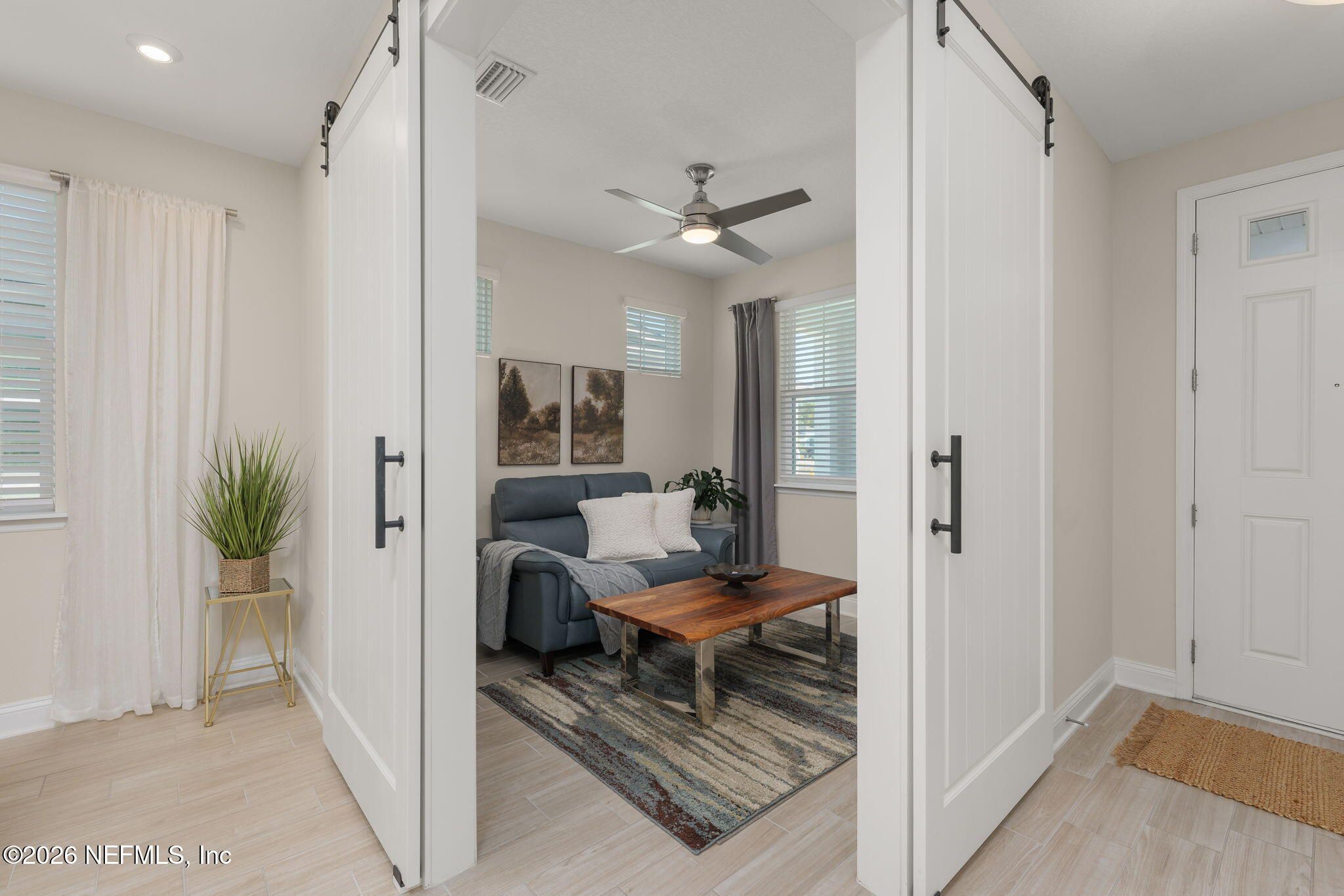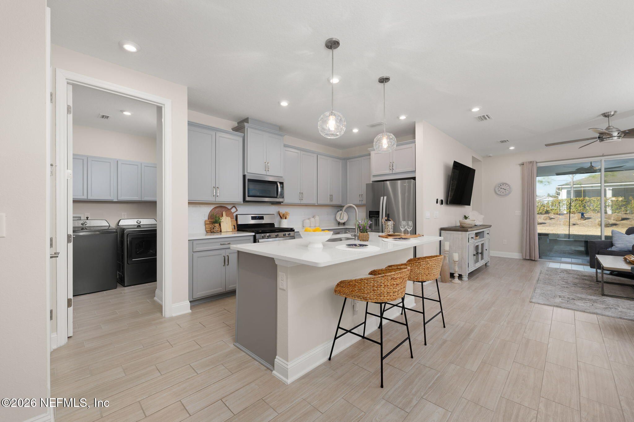 Step into effortless Florida living at 177 Fly Line Drive in WaterSong at Rivertown, where style, comfort, and convenience come together in one beautifully finished villa. Designed as a true lock and go home, this is the perfect fit for snowbirds, part time residents, or anyone who wants low maintenance living without sacrificing design and lifestyle. Inside, the light and bright open layout features 2 bedrooms, a den flex room with corner barn doors, and 2 baths, with natural sunlight pouring through the main living spaces to create a warm and inviting feel all day long. You will love the cohesive, upscale look of wood plank tile flooring throughout with no carpet, giving the home both durability and easy upkeep. Stylish custom touches elevate the interior, including a custom board and batten accent wall and shiplap at the tray ceiling in the primary bedroom, adding warmth, texture, and designer character. The kitchen is fresh and modern with a stylish subway tile backsplash, white quartz countertops, gas range, soft gray cabinetry with linear brushed nickel hardware, and a dining bar with seeded glass globe pendant lighting, ideal for everyday living and entertaining alike. This home is also thoughtfully upgraded with a whole house water filtration and water softener system, adding comfort and peace of mind to your daily routine. Outside, a screened lanai is perfect for enjoying morning coffee or relaxing evenings. Beyond your front door, WaterSong offers a welcoming lifestyle with amenities and social opportunities that make it easy to stay active, meet neighbors, and enjoy every season, including a pool, clubhouse, pickleball, dog park, miles of trails, golf cart paths, and biergarten. Close to shopping, dining, and world renowned medical facilities.