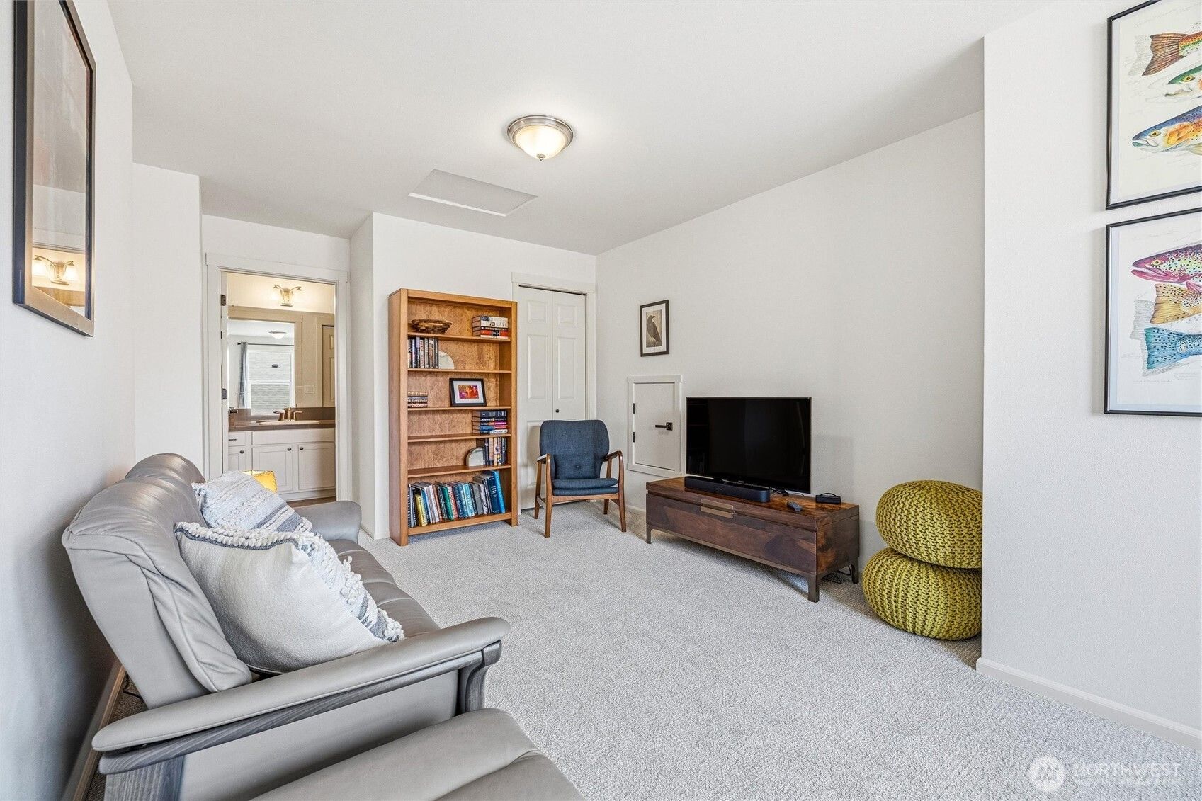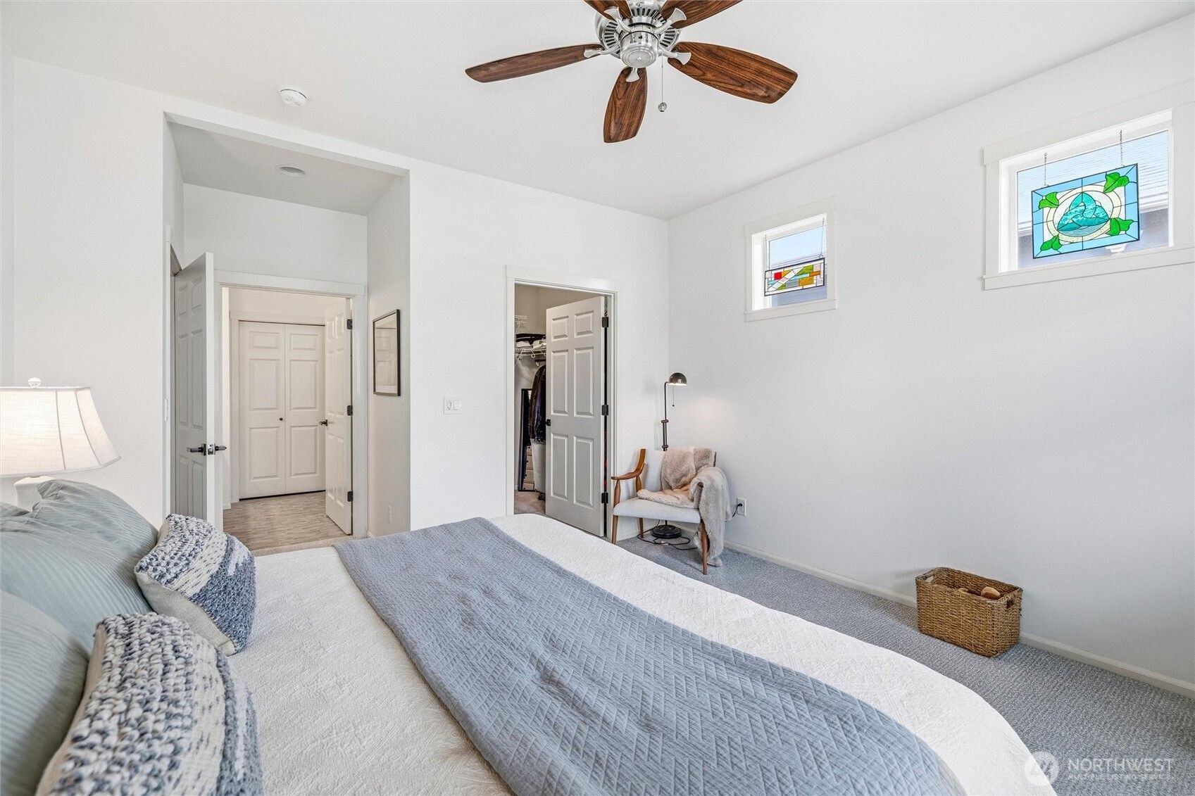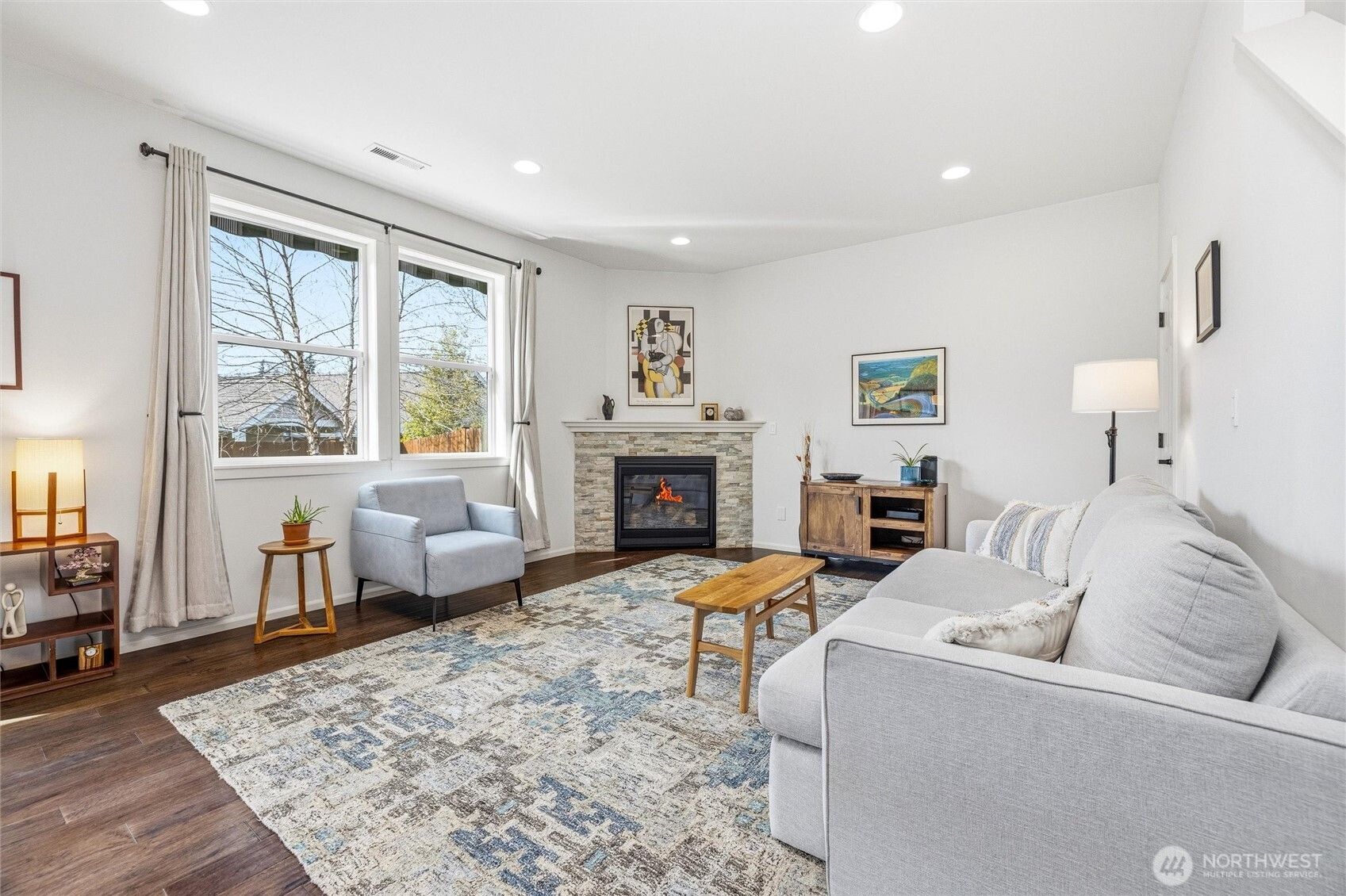 Welcome to this move-in-ready home with main-level living in Woodside, a vibrant and active 55+ community. Entering into the inviting foyer there's a powder room, coat storage, dedicated laundry room and a wide hallway leading to the open concept kitchen, living, and dining rooms. The well-equipped kitchen features stainless appliances, quartz countertops, abundant high-quality cabinetry and an upgraded full-height stone backsplash that adds depth and texture to the welcoming space. The spacious living room features a gas fireplace and large windows overlooking your private fenced backyard and patio. Also on the main floor you'll find the large primary en-suite bedroom with walk in closet and well-appointed bathroom featuring dual vanities and extra storage, as well as an additional bedroom/office/den through the french doors off the dining room. Upstairs is an additional bedroom, bathroom, and comfortable family/great room for extra space to spread out. With hardwood floors in common areas and high-quality carpet in the bedrooms and upstairs, new paint inside, wood-wrapped windows and many upgrades throughout, this home is ready for its next owner to move right in. The large 2-car garage has extra room for storage or a workshop area and the fully fenced backyard has an expanded concrete patio with multiple places for dining, seating, or entertaining. Situated next to a manicured community park with easy access to shopping, medical facilities, walking trails, and more!