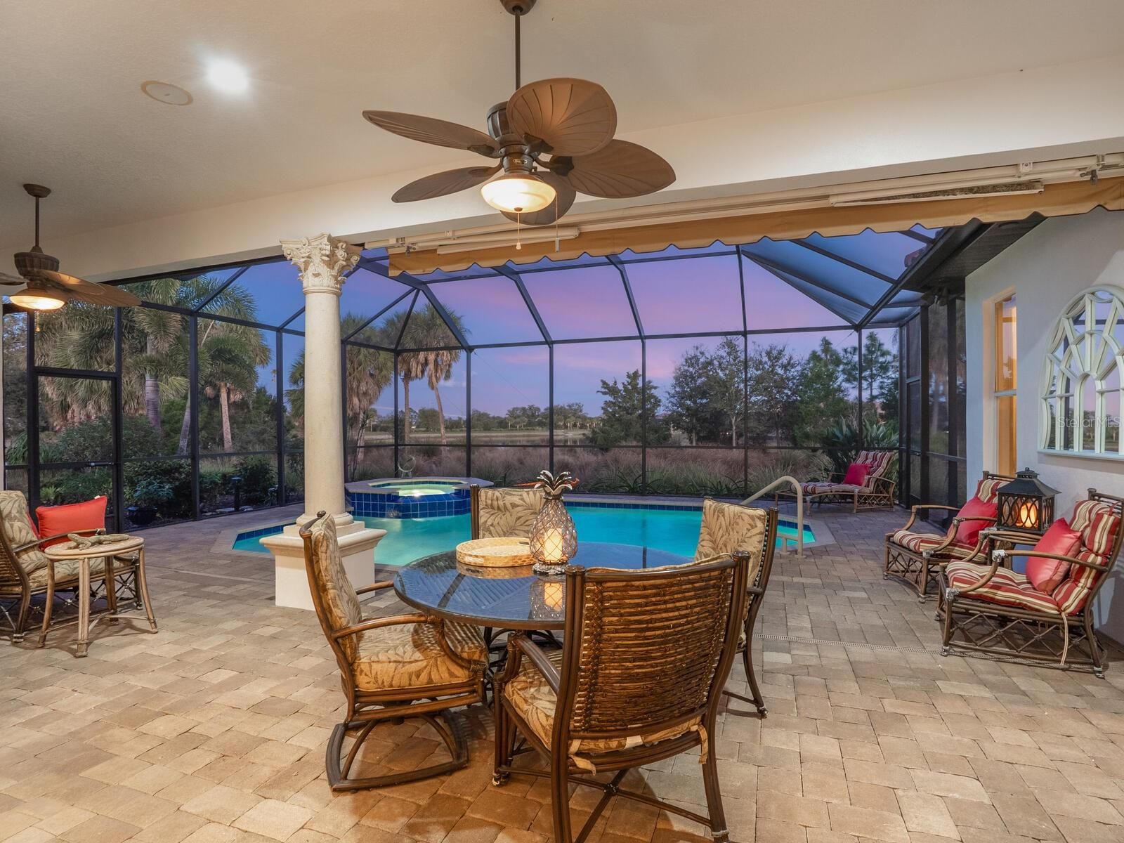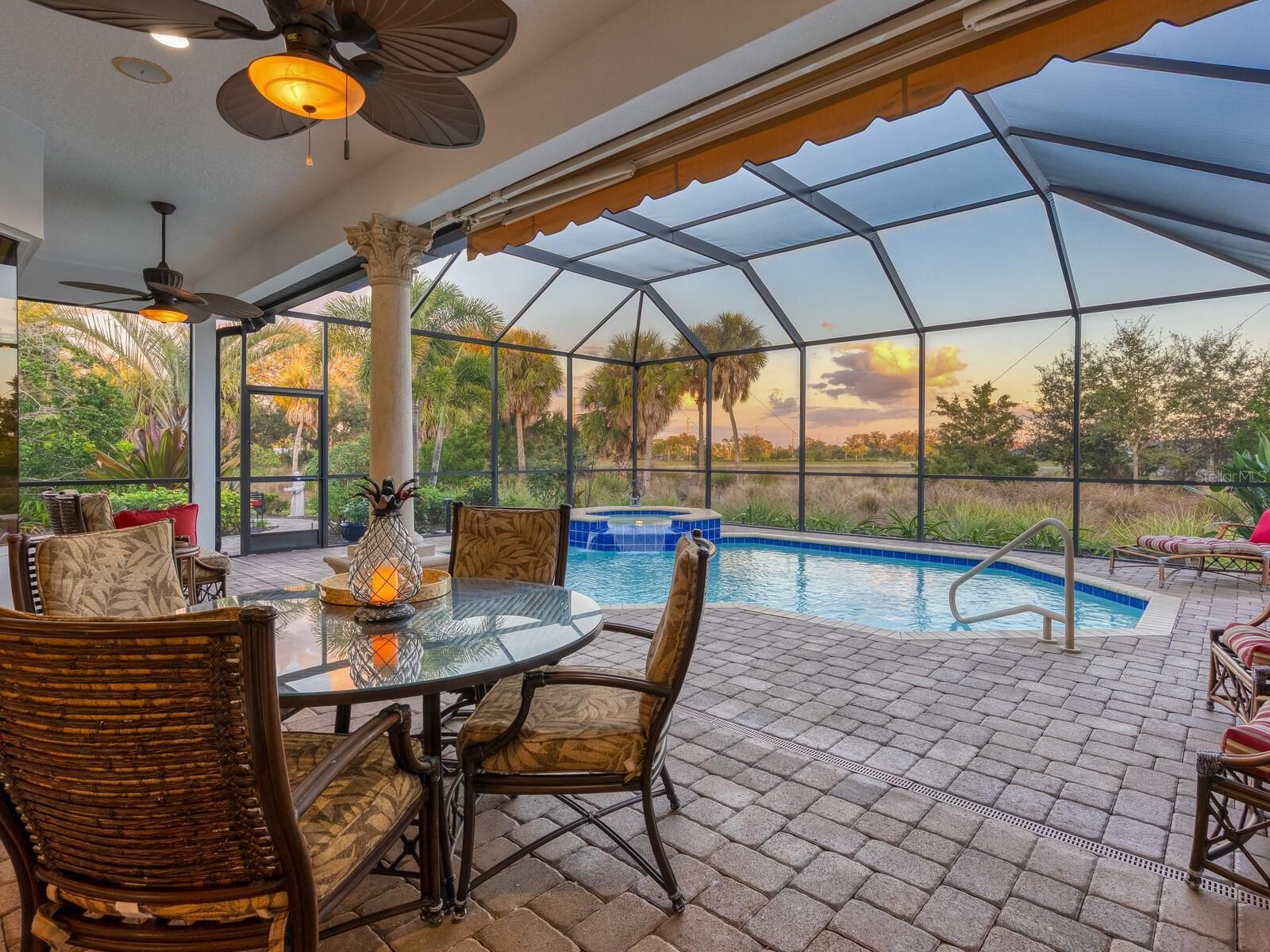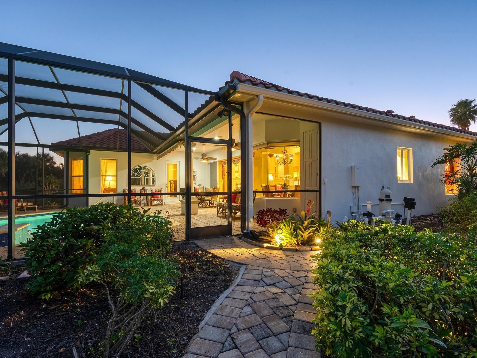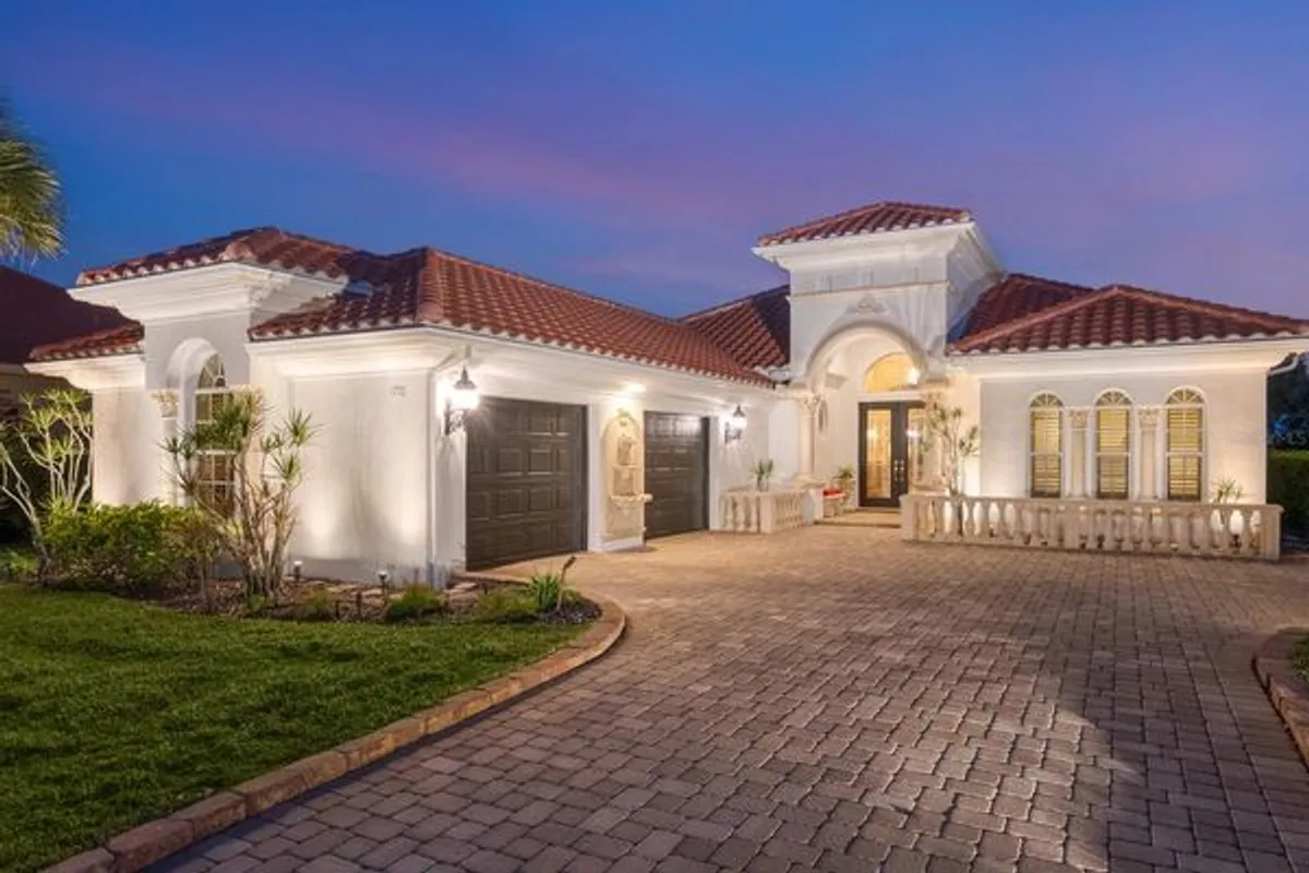 This custom Arthur Rutenberg Bardmoor II is in pristine condition and maintenance free! The dramatic Tuscan exterior has actual stone appointments. As you enter through the double leaded glass doors, you are greeted by grand archways, tray and waffle ceilings and detailed built-ins. An ideally sized home with great room, formal dining room, three bedrooms and three baths (den or fourth bedroom). The gourmet kitchen with stainless appliances, quartz, custom cabinetry and a pass-thru wet bar open to grand views through aquarium windows in the breakfast nook. The den/library boasts hardwood flooring and detailed moldings. The large primary bedroom has a double tray ceiling, expansive bay window and private entry to the pool. The spacious paver outdoor living area has a Jacuzzi and pool overlooking a private preserve with grand lake views. The oversized garage has a separate door for your golf cart. Feel secure with the new barrel tile roof. The Country Club offers golf, tennis, pickleball, restaurant, bar and many activities, phenomenal dog park and close to the beach! Soon, Boca Royale’s gates will open in Wellen Park for dining, shopping and the ballpark.