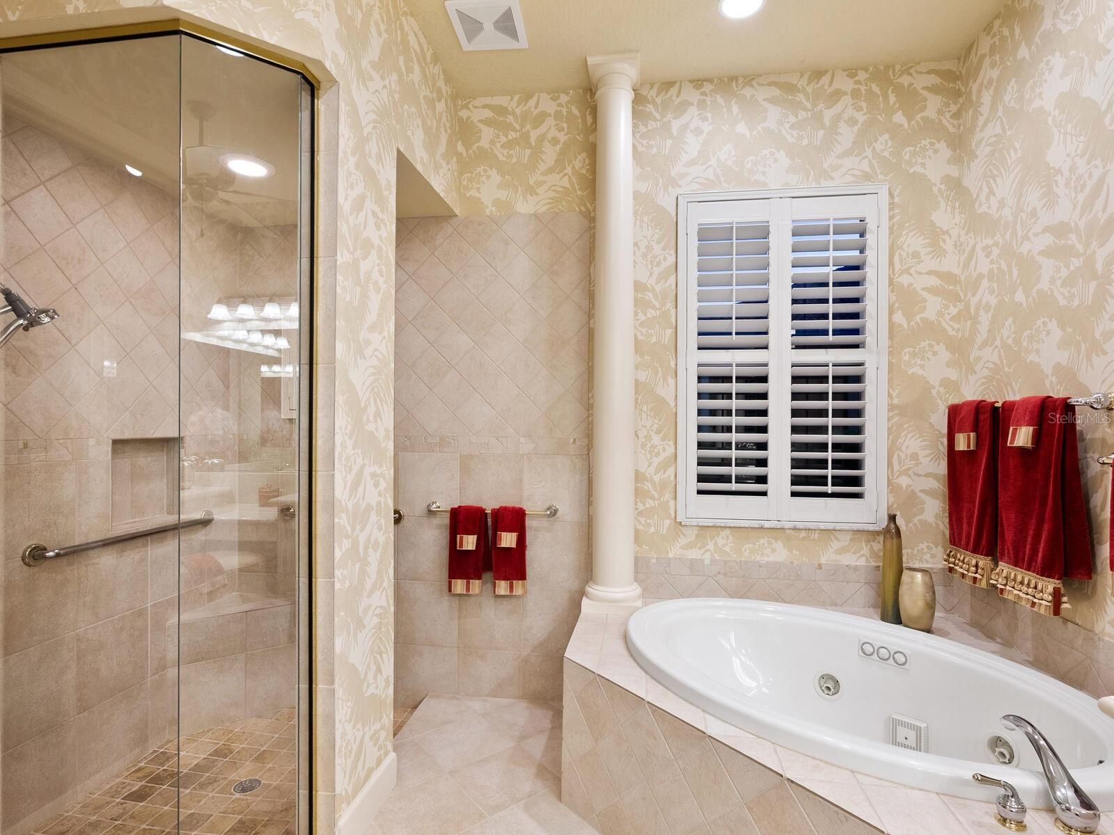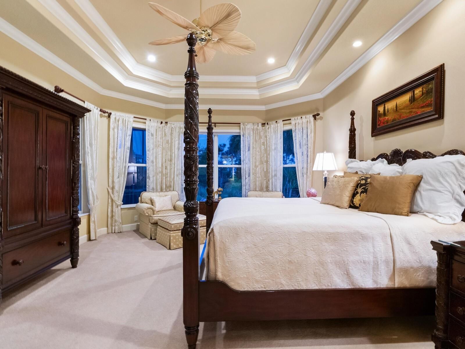 - Built-in Features, Ceiling Fan(s), Chair Rail, Coffered Ceiling(s), Crown Molding, Dry Bar, Eat-in Kitchen, High Ceilings, Main Level Primary, Solid-Wood Cabinets, Split Bedrooms, Stone Counters, Tray Ceiling(s), Walk-In Closet(s), Window Treatments