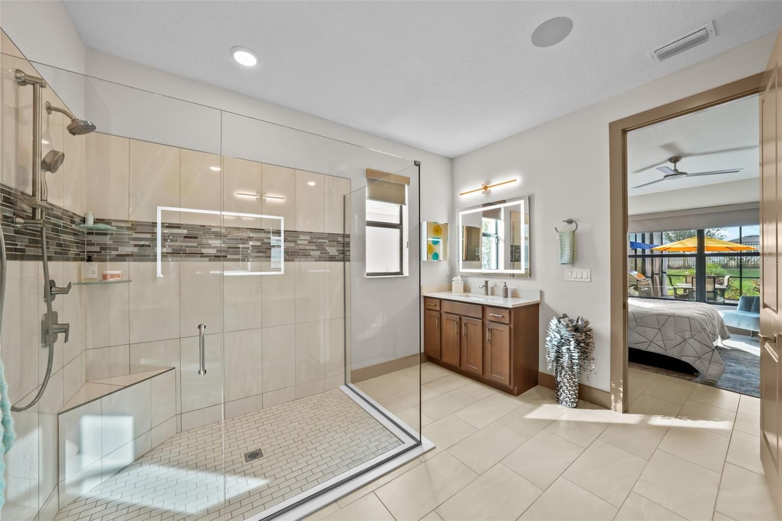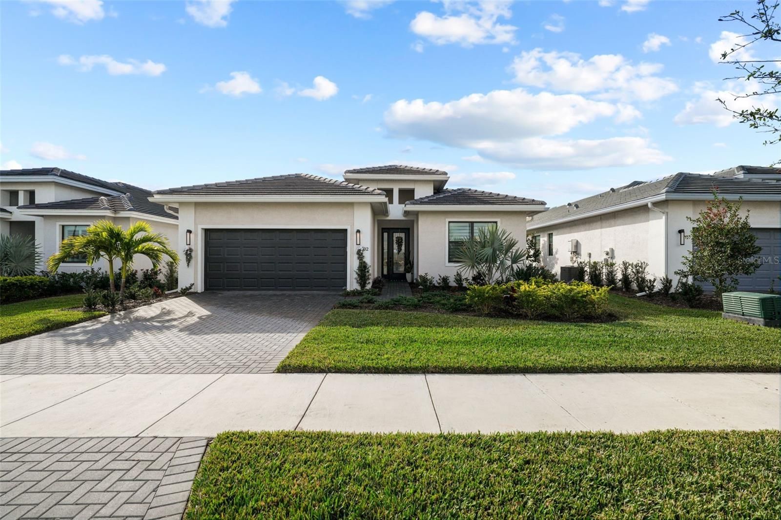 This stunning home, located in a vibrant 55+ community, boasts upgrades at every turn. Step outside to discover an expansive outdoor kitchen, perfect for entertaining, overlooking a luxurious pool and an extended caged lanai, offering the ultimate in outdoor living. The home features a bright and airy open floor plan, with a thoughtfully designed split layout that provides both privacy and spaciousness. Inside, the gourmet kitchen will inspire the chef in you with soft-close cabinetry, gas cooktop, stainless appliances, while the oversized island with a waterfall edge serves a stunning centerpiece, all open to the casual dining area and family room. The whole house has porcelain tile, 8’ solid core doors, custom trim package, upgraded lighting with dimmer switches, custom closets and window treatments. The owner’s suite features double vanities, frameless shower with seat, designer cabinetry and upgraded plumbing fixtures. You also enjoy access to a resident-exclusive clubhouse that features outdoor amenities including pickleball & tennis courts; a dog park with large & small breed sections; wide, lit walkways; resort-style pool and spa; resistance pool; event plaza with food court truck; bocce courts and outdoor social areas. The Cresswind SmartFIT Training Center is powered by EGYM and uses state-of-the-art fitness technology. The full-time Lifestyle Director keeps the social and event calendar full of activities designed for the 55 + lifestyle. This home is the epitome of modern comfort and style, with every detail meticulously designed to create a serene and inviting atmosphere.