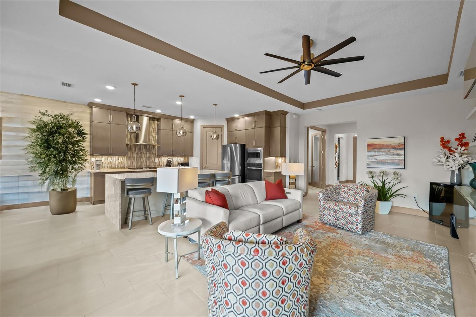 - Built-in Features, Ceiling Fan(s), High Ceilings, Kitchen/Family Room Combo, Open Floorplan, In-Wall Pest Control, Main Level Primary, Split Bedrooms, Stone Counters, Thermostat, Tray Ceiling(s), Walk-In Closet(s)