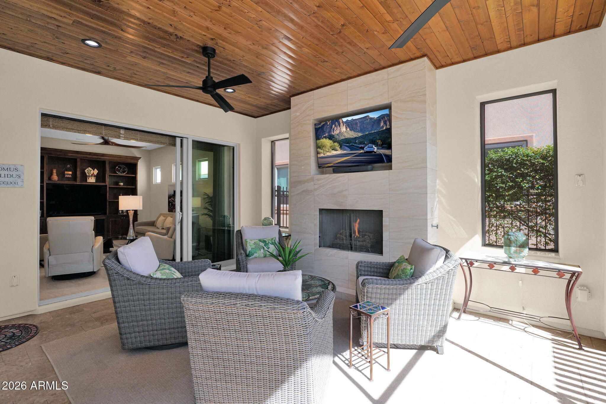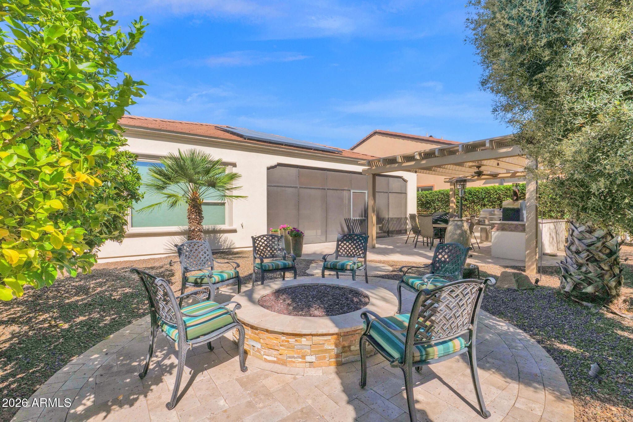 Discover an exceptional Genova residence in the prestigious Encanterra Country Club, where thoughtful design, upgraded finishes, and a private setting combine to create a truly special home. Seldom do we see a property that blends architectural detail, indoor-outdoor living, and privacy as seamlessly as this one. Offering 3 bedrooms, 2.5 bathrooms, and a 3-car garage, the home welcomes you with warm, tasteful finishes that feel refined and inviting--clean and elegant without ever feeling sterile. The open great-room design flows effortlessly into a gourmet kitchen featuring rich cabinetry, expansive granite countertops, stainless appliances, and multiple ovens, creating the perfect setting for both everyday living and entertaining. A signature highlight of this residence is the dual sliding walls of glass that open to a stunning screened and covered Arizona room. Here, a dramatic floor-to-ceiling fireplace and beautiful wood slat ceiling create an inviting retreat that blurs the line between indoor comfort and outdoor living. Beyond the Arizona room, the extended patio under a pergola expands the entertainment possibilities even further. The space features a built-in outdoor kitchen and authentic pizza oven, making it an ideal setting for hosting friends or enjoying relaxed evenings in the Arizona air. The home sits on a private lot overlooking a green space, offering a sense of openness and privacy rarely found. Whether enjoying morning coffee, hosting dinner with friends, or simply relaxing outdoors, the setting provides a peaceful backdrop for daily life. Additional conveniences include a central vacuum system, ample storage, and the highly desirable side-load garage--perfect for small vehicles, golf carts, or hobby space. Beautifully designed and thoughtfully upgraded, this residence represents a rare opportunity to enjoy luxury living in one of Arizona's premier resort communities.
