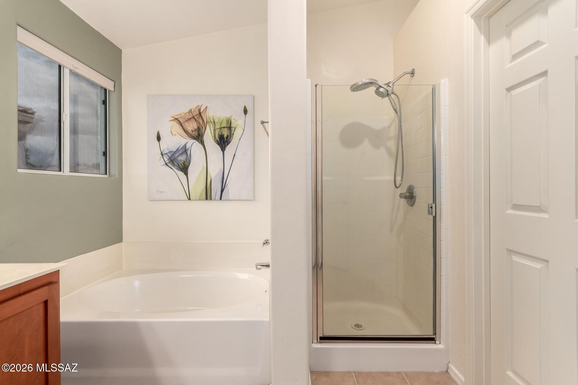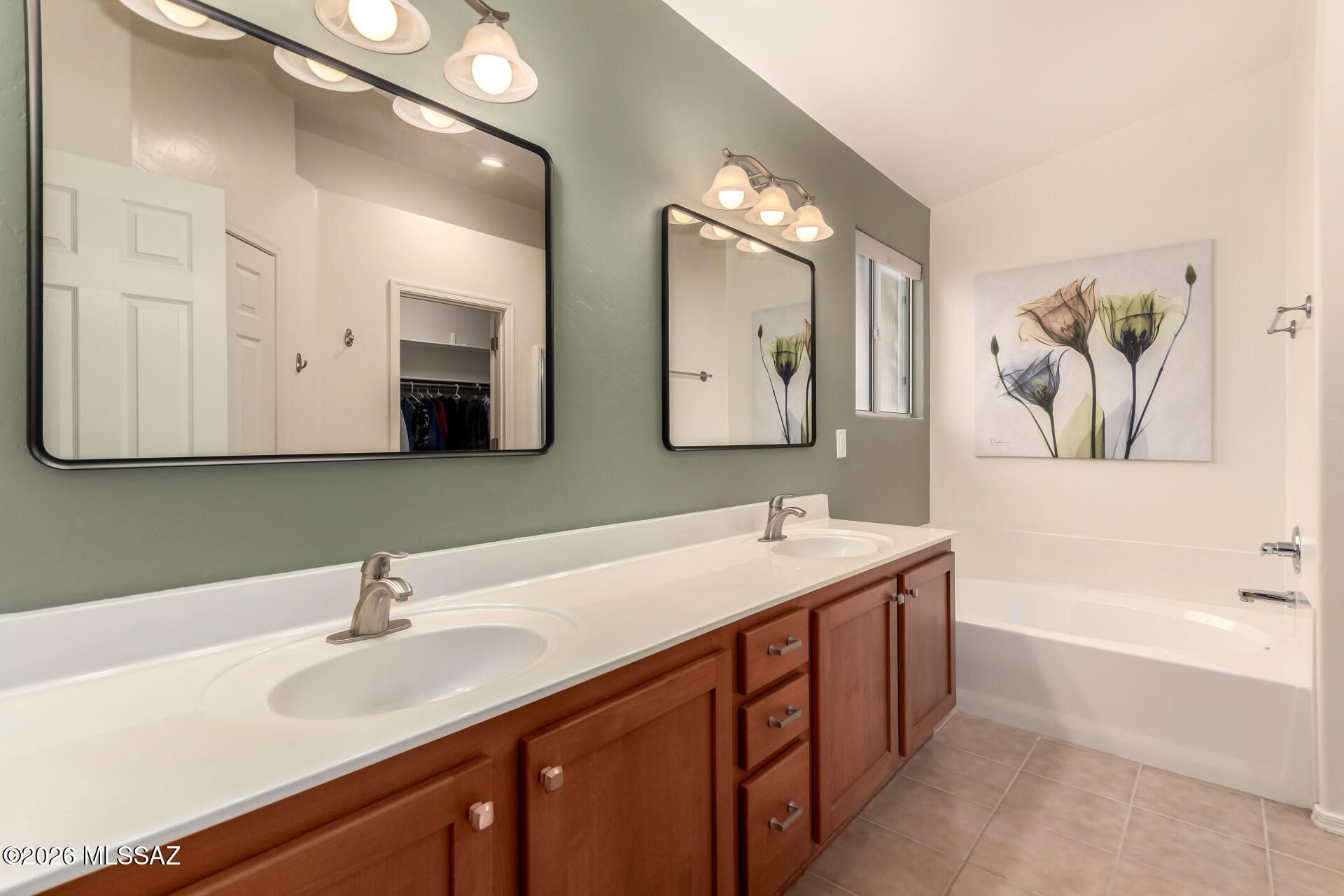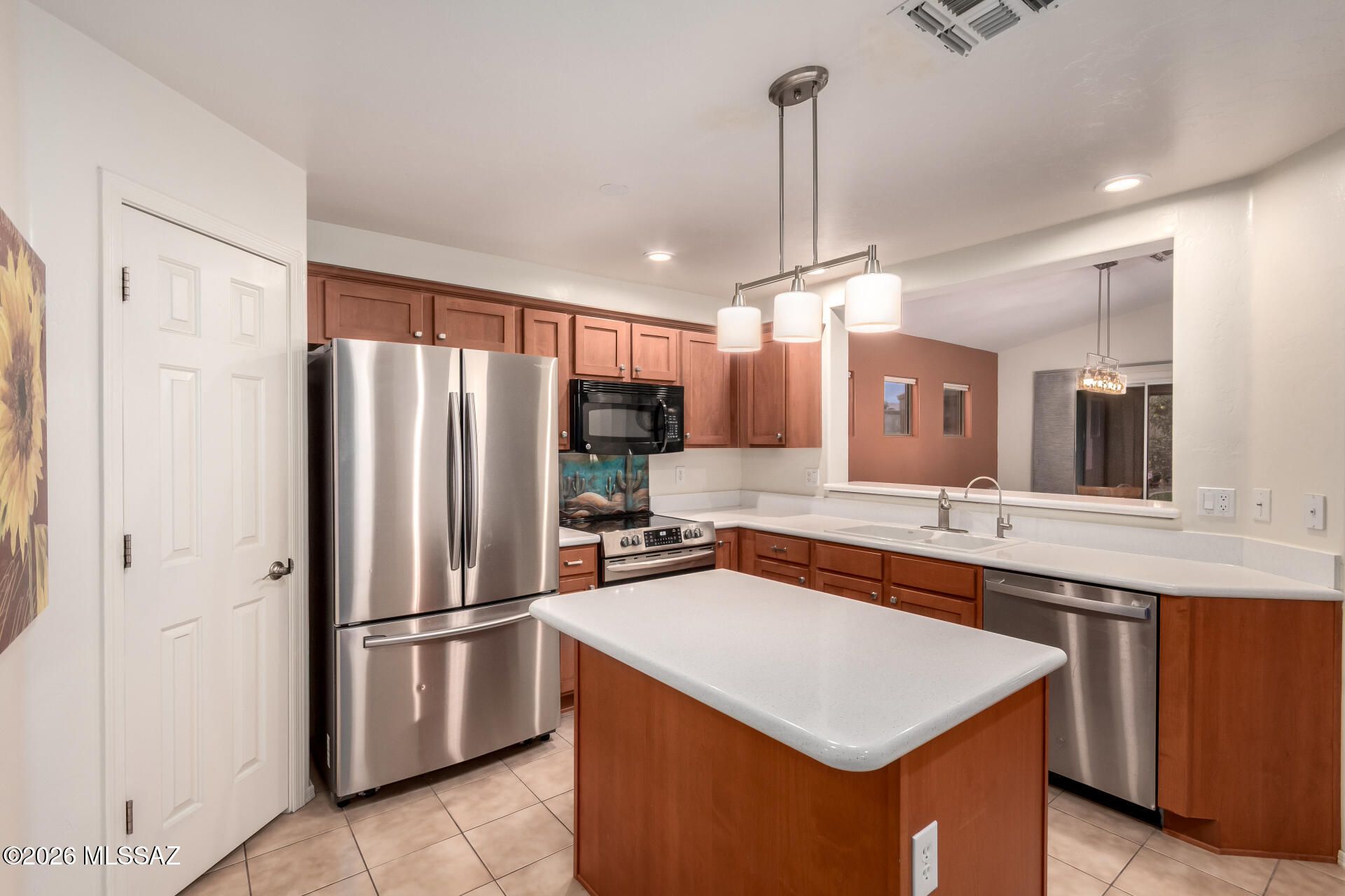 Beautifully designed and meticulously maintained, this stunning home in the coveted Desert Creek neighborhood of Green Valley offers the perfect blend of comfort and style! Featuring 1,645 sq. ft., 2 bedrooms, 2 bathrooms PLUS a den and screened patio, this residence is sure to impress. Enter through a custom security door into a charming exterior entry and step inside to a bright, open great room with soaring vaulted ceilings and abundant natural light. The gorgeous kitchen is thoughtfully appointed with quartz countertops, stainless steel appliances, a spacious island, and a pantry--ideal for both everyday living and entertaining. The spacious primary suite boasts an en suite bath with dual vanities, a separate soaking tub and shower, and a generous walk-in closet.