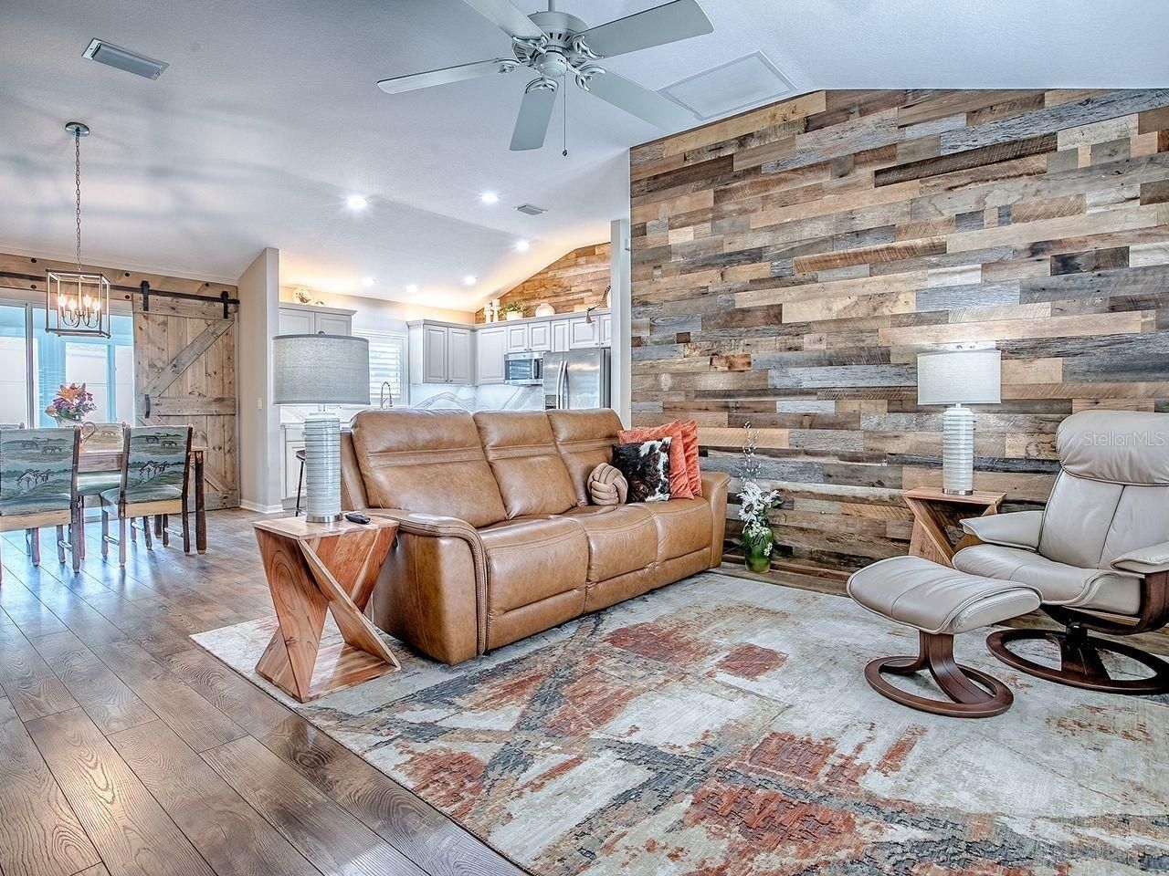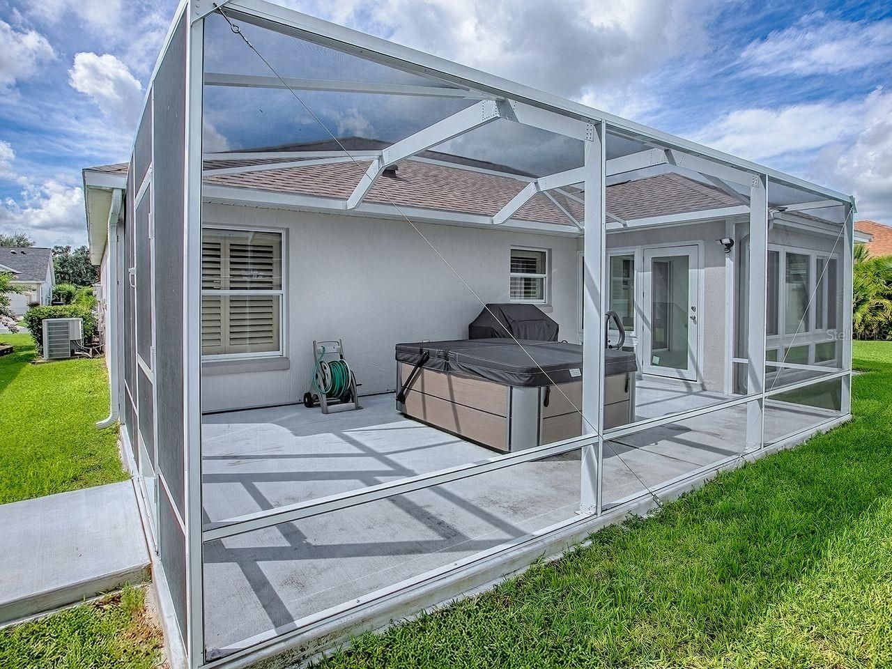Beautifully Renovated 3/2 Azalea Model in the Highly Desirable Village of Winifred. This block-and-stucco 3-bedroom, 2-bath Azalea model has been thoughtfully renovated, offering a blend of modern finishes and timeless charm. Step inside to find all-new luxury vinyl plank flooring, stylish wood accent walls, and barn doors leading to the recently enclosed lanai. From there, enjoy the expansive birdcage with a brand-new hot tub—perfect for relaxing or entertaining. The kitchen features elegant quartz countertops and backsplash, while the bathrooms showcase granite counters, adding a touch of luxury throughout. There are plantation shutters throughout as well. This home is move-in ready, with upgrades designed for both comfort and style. Freshly painted both inside and out last year. ROOF replaced in 2022, HVAC replaced in 2018, HOT WATER HEATER replaced in 2015. There is NO KISSING LANAI due to a wall behind the property, so you have total privacy! The Village of Winifred is one of the most sought-after neighborhoods in The Villages, offering three golf cart entrances/exits for maximum convenience: Direct access to Arnold Palmer Country Club; a path to Laurel Manor Recreation Center, with nearby medical services and a veterinarian; easy connection to Buena Vista Boulevard, leading to Southern Trace Shopping Center and numerous restaurants, banks and other amenities. Also, There is only one entrance/exit by car for added security. You’ll also enjoy being just a short golf cart ride to Lake Sumter Landing Square, with Spanish Springs Square only about 15 minutes away. This home offers not only a prime location but also a host of updates and lifestyle conveniences that make it truly special and the BOND IS PAID!