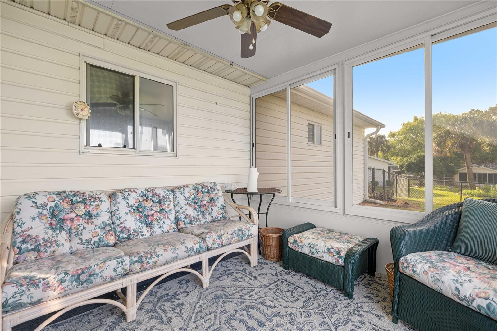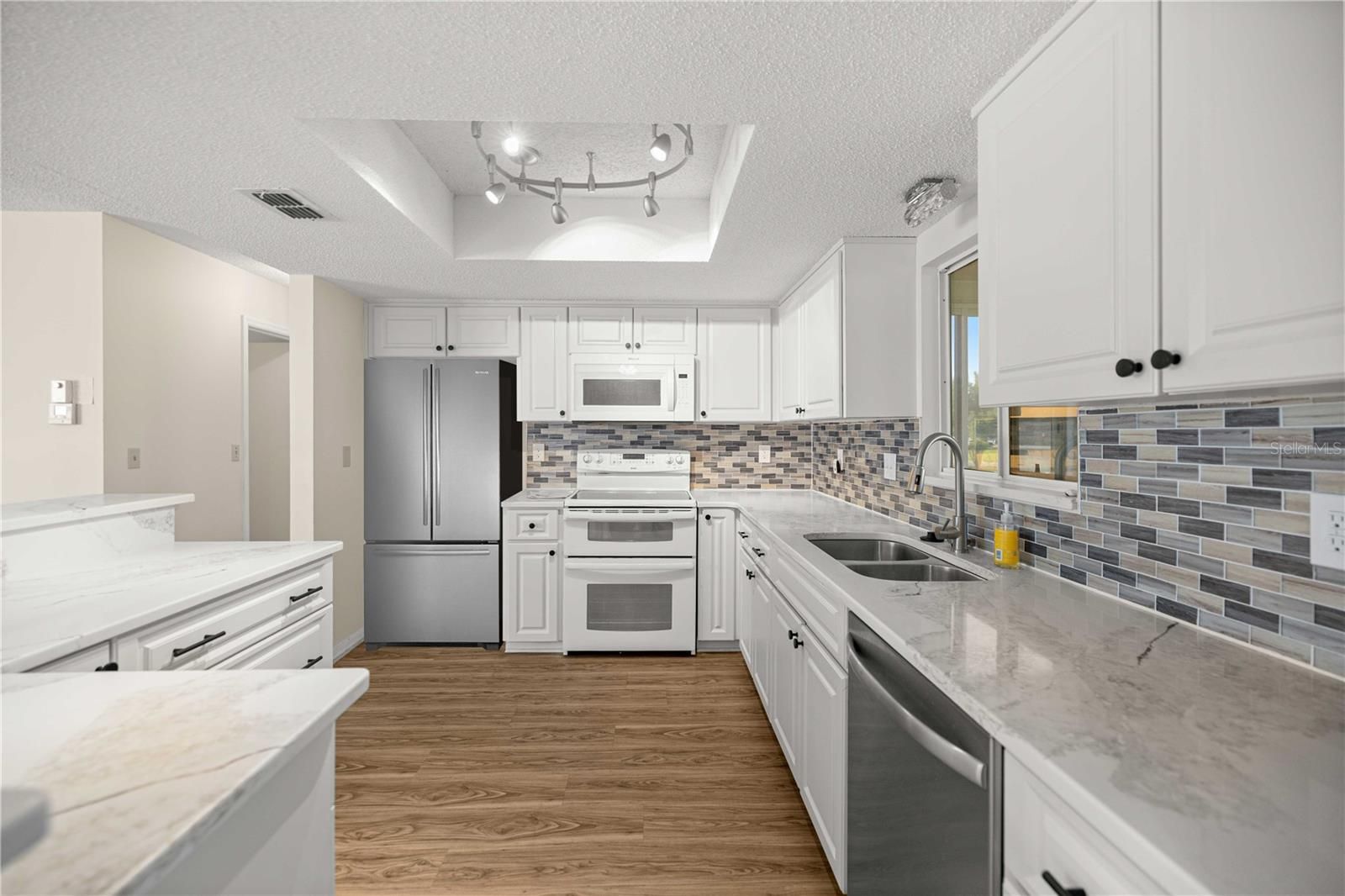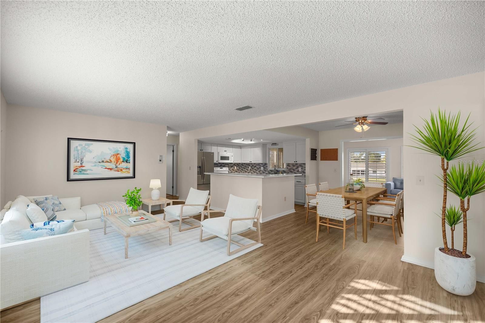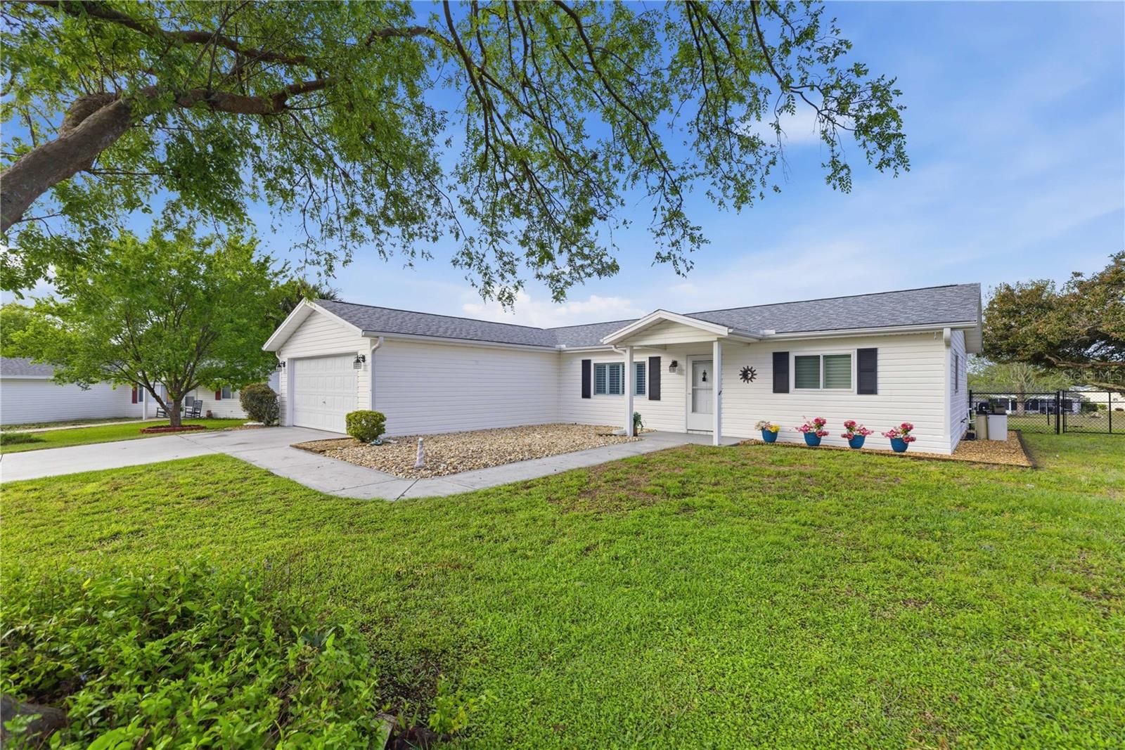 One or more photo(s) has been virtually staged. Some rooms are Virtually Stage... There are LOTS OF UPGRADES ON THIS BEAUTIFUL CHESNUT II DESIRABLE MODEL. Welcome to your NEW home in the beautiful 55+ gated golf community of Spruce Creek South, ideally located just off Hwy 441/US-27 and only minutes from The Villages! This remodeled CHESTNUT II floor plan offers 2 bedrooms, 2 bathrooms, a Florida room, and a RESIDENTIAL enclosed lanai UNDER HEAT AND AC, both have sliding windows offers more living space—perfect for enjoying the Florida lifestyle year-round. Step inside to find vinyl plank flooring throughout, with no carpet, bedrooms were recently upgraded with LVP floors. Major updates provide peace of mind, including a NEWER roof (2022), NEWER HVAC (2022), NEWER HOT WATER HEATER (2022), NEW REFRIGERATOR JUST PUT IN THIS MONTH 4/09/2026! and UPGRADED windows (2017). Both bathrooms have been completely renovated, featuring tiled shower surrounds, new vanities with soft-close cabinetry, and updated toilets. Throughout the home, you’ll appreciate the elegance of plantation shutters in front of all of the windows. The kitchen has been tastefully updated with refaced cabinets, a newly added breakfast bar with soft-close doors and drawers, and high-definition QUARTZ countertops. The dining area features a custom built-in buffet offering abundant storage, pull-outs, and soft-close features ALSO WITH QUARTZ countertop —perfect for both everyday living and entertaining. Relax with your morning coffee or unwind in the evening in the Florida room or enclosed residential lanai with acrylic windows and screens, all overlooking a well-maintained retention pond. Enjoy added privacy with no rear neighbors. Additional features include a sliding screen privacy door on the garage and thoughtful upgrades throughout. This is an exceptional opportunity you don’t want to miss—schedule your private showing today! some furniture conveys; a list is available. START FLORIDA LIVING TODAY!