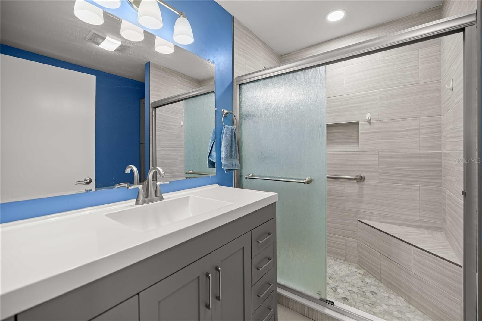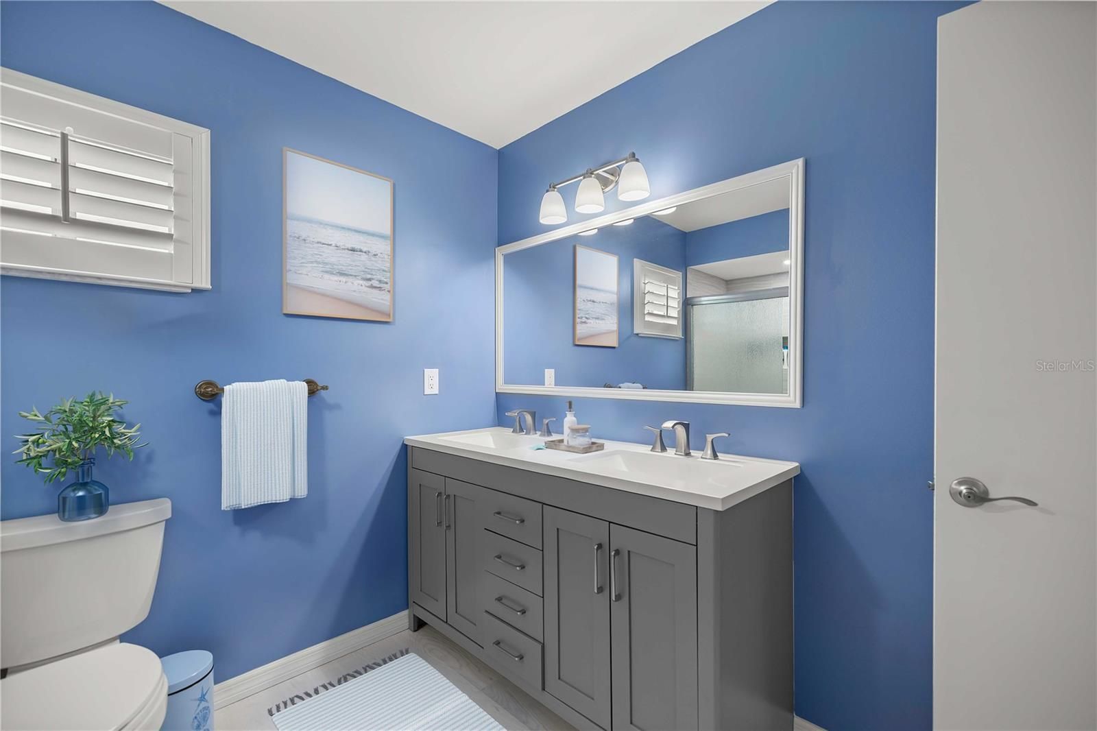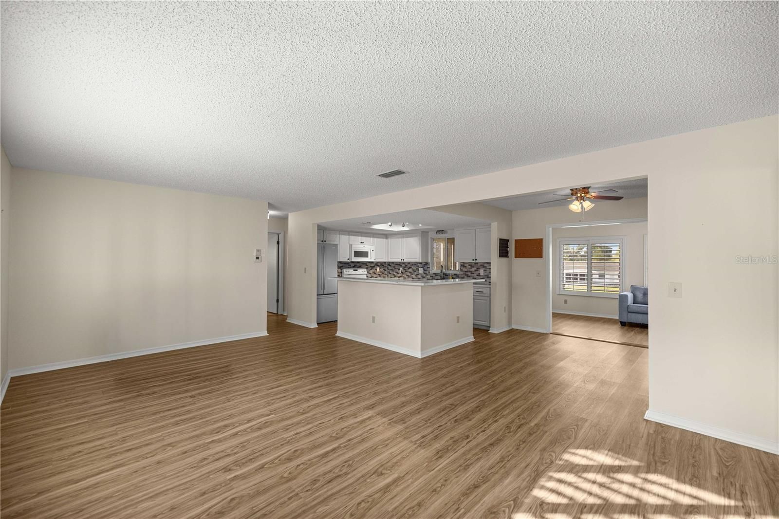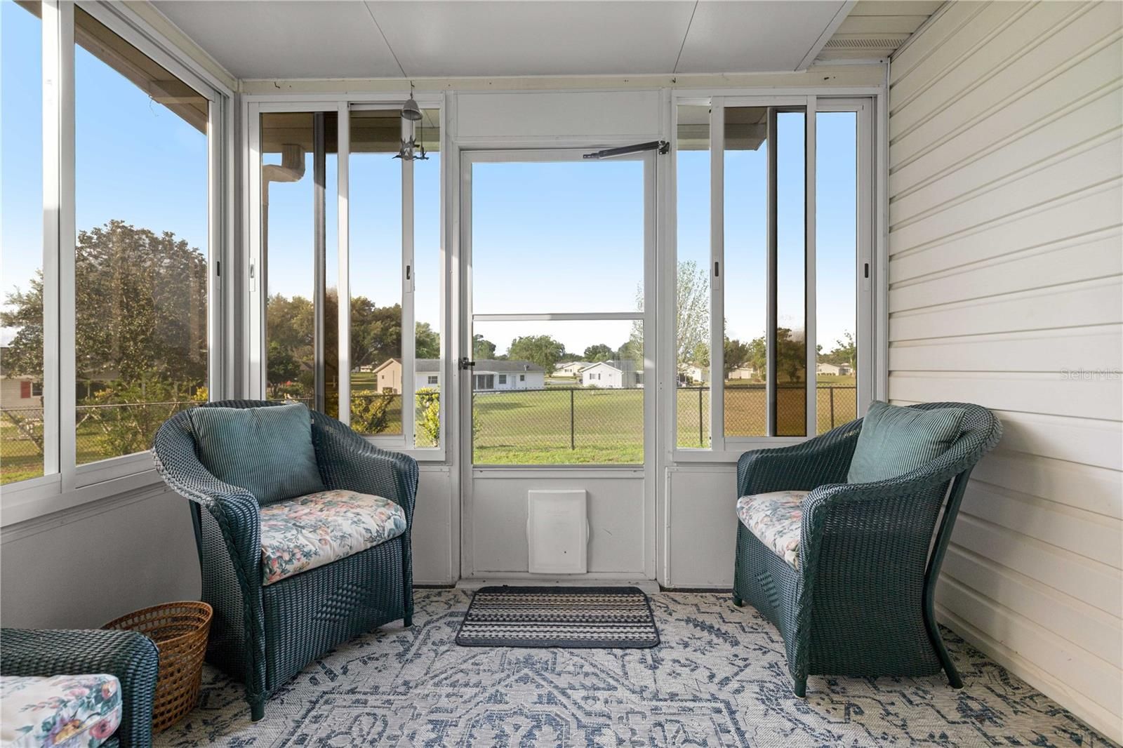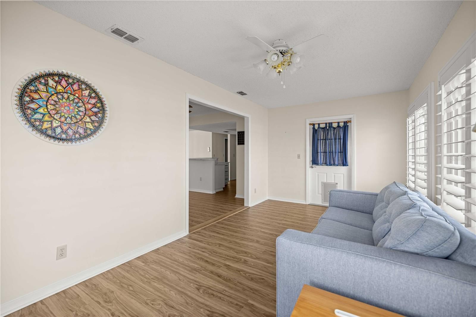 One or more photo(s) has been virtually staged. Some rooms are Virtually Stage... There are LOTS OF UPGRADES ON THIS BEAUTIFUL CHESNUT II DESIRABLE MODEL. Welcome to your NEW home in the beautiful 55+ gated golf community of Spruce Creek South, ideally located just off Hwy 441/US-27 and only minutes from The Villages! This remodeled CHESTNUT II floor plan offers 2 bedrooms, 2 bathrooms, a Florida room, and a RESIDENTIAL enclosed lanai UNDER HEAT AND AC, both have sliding windows offers more living space—perfect for enjoying the Florida lifestyle year-round. Step inside to find vinyl plank flooring throughout, with no carpet, bedrooms were recently upgraded with LVP floors. Major updates provide peace of mind, including a NEWER roof (2022), NEWER HVAC (2022), NEWER HOT WATER HEATER (2022), NEW REFRIGERATOR JUST PUT IN THIS MONTH 4/09/2026! and UPGRADED windows (2017). Both bathrooms have been completely renovated, featuring tiled shower surrounds, new vanities with soft-close cabinetry, and updated toilets. Throughout the home, you’ll appreciate the elegance of plantation shutters in front of all of the windows. The kitchen has been tastefully updated with refaced cabinets, a newly added breakfast bar with soft-close doors and drawers, and high-definition QUARTZ countertops. The dining area features a custom built-in buffet offering abundant storage, pull-outs, and soft-close features ALSO WITH QUARTZ countertop —perfect for both everyday living and entertaining. Relax with your morning coffee or unwind in the evening in the Florida room or enclosed residential lanai with acrylic windows and screens, all overlooking a well-maintained retention pond. Enjoy added privacy with no rear neighbors. Additional features include a sliding screen privacy door on the garage and thoughtful upgrades throughout. This is an exceptional opportunity you don’t want to miss—schedule your private showing today! some furniture conveys; a list is available. START FLORIDA LIVING TODAY!
