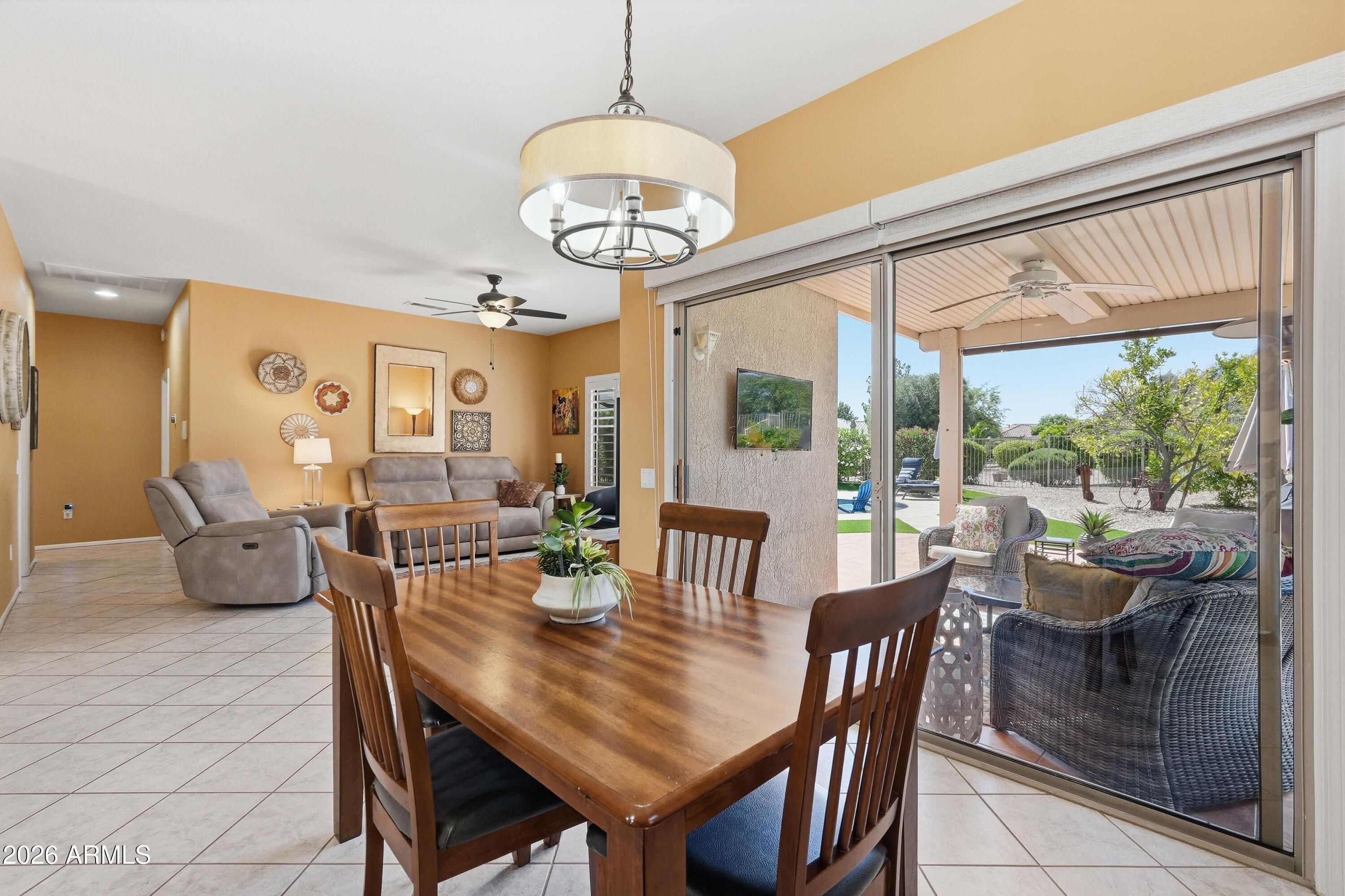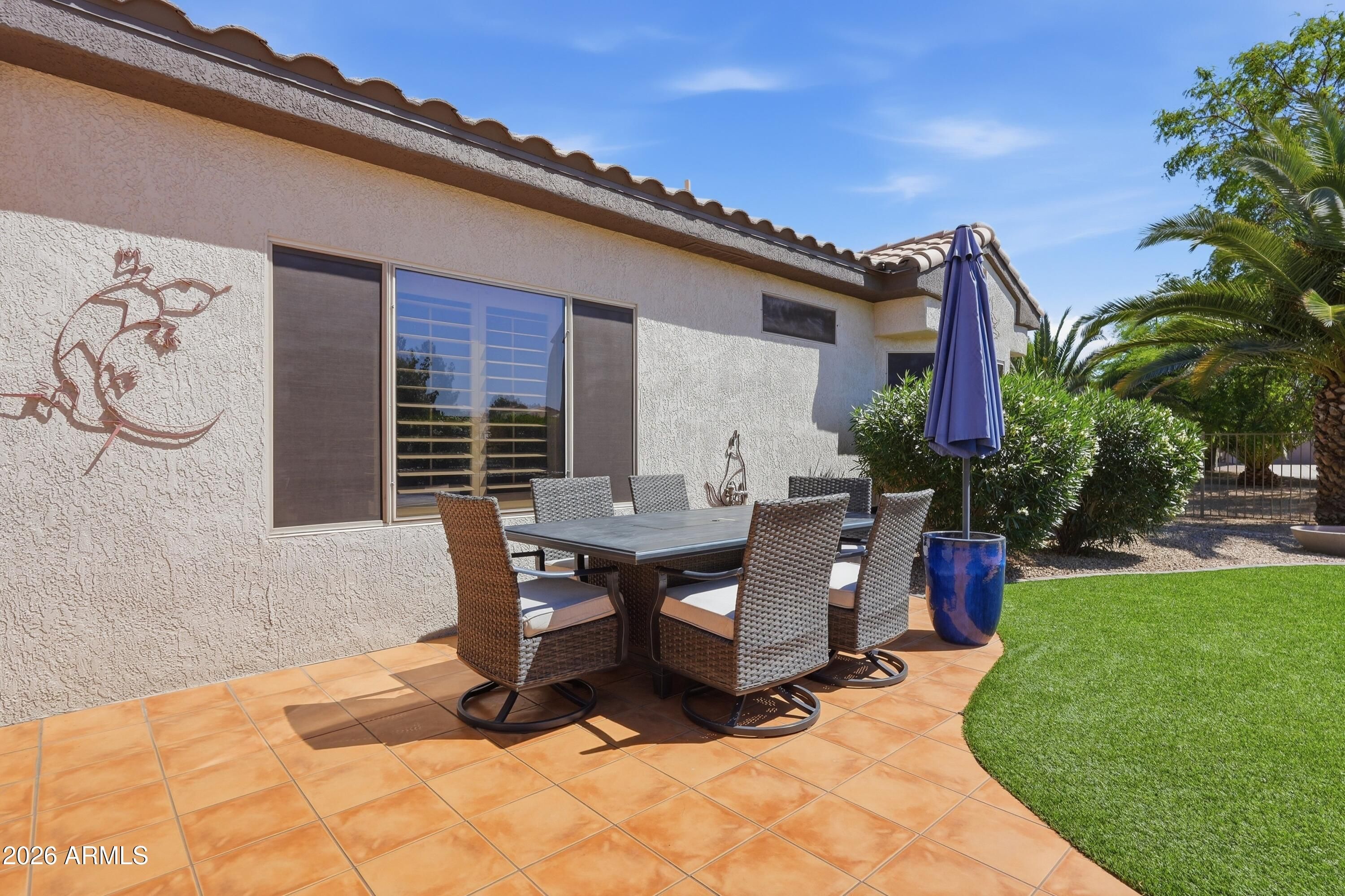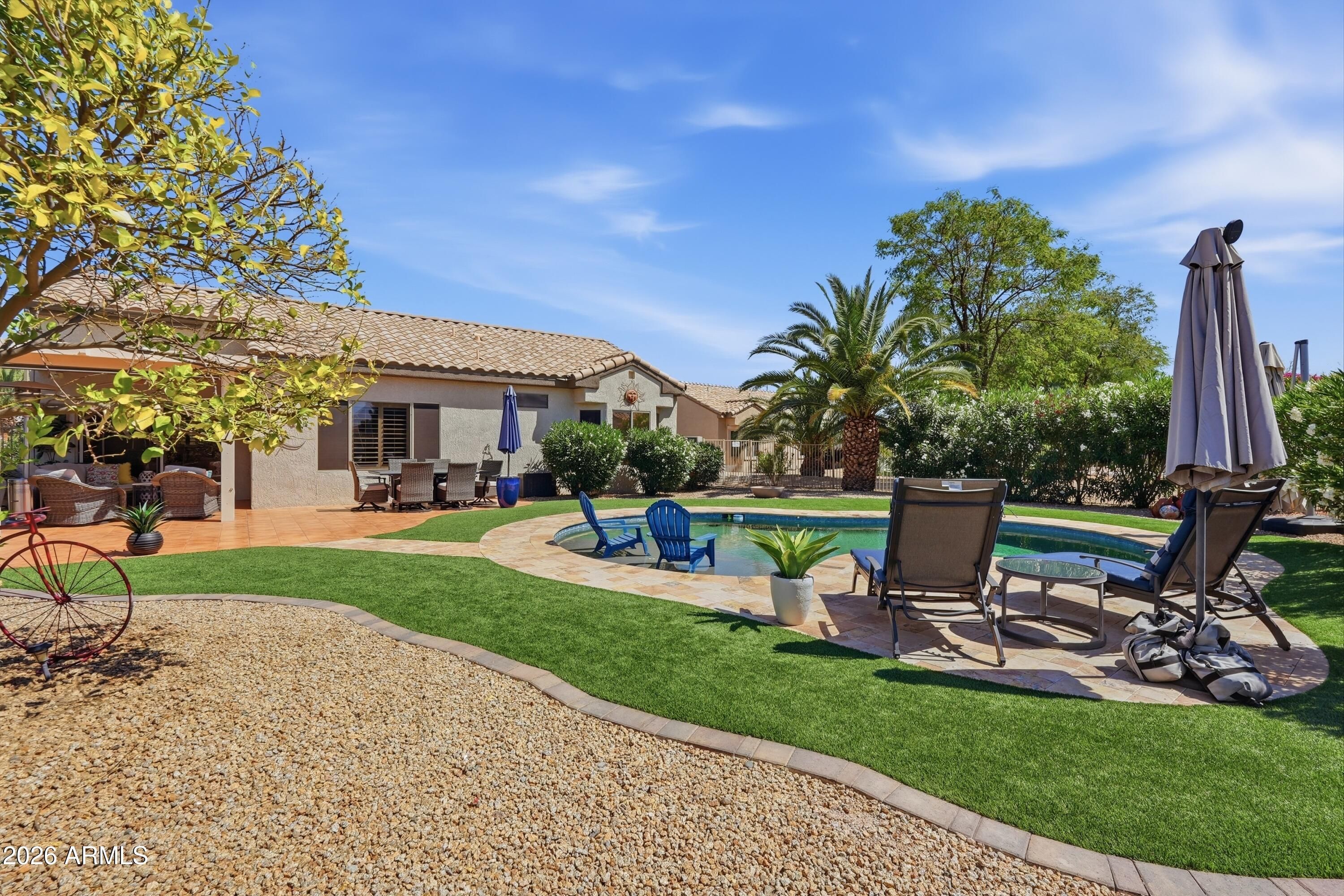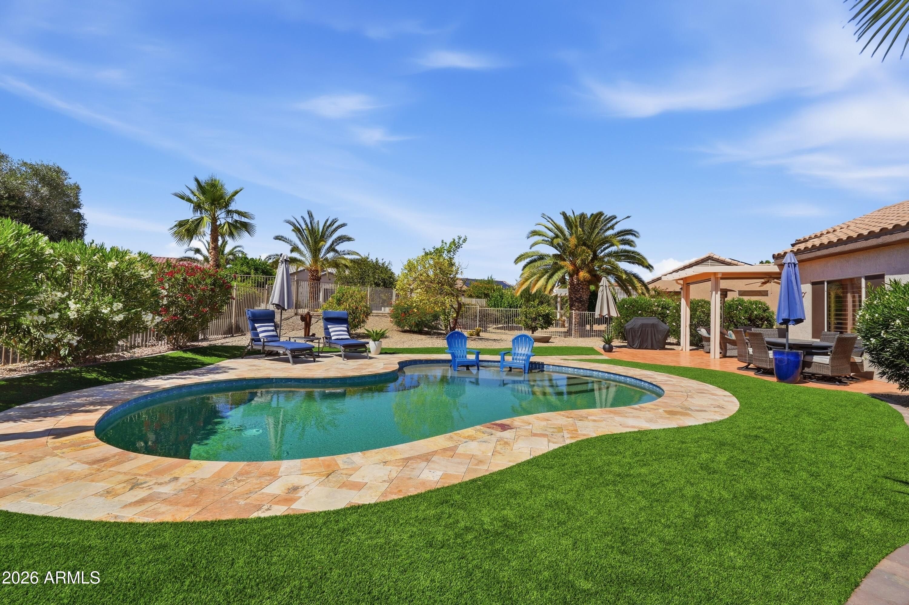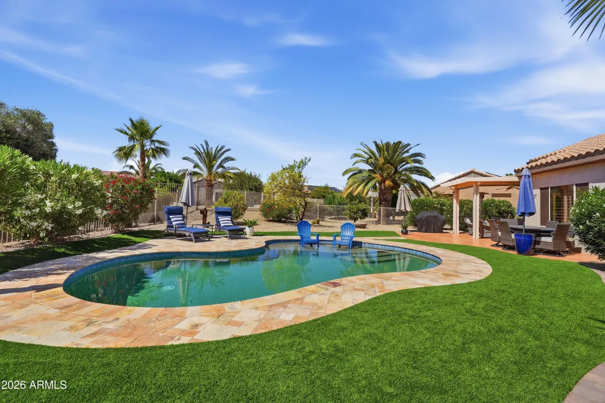 Backyard resort-style living awaits with a stunning pool installed in January 2023, complete with a relaxing sunshelf, extended covered patio with tile flooring, fragrant lemon tree, and lush greenery--perfect for entertaining or enjoying peaceful Arizona evenings. This beautifully maintained home sits on a quiet cul-de-sac and offers outstanding curb appeal with low-maintenance landscaping, charming front patio, and a 2-car garage with built-in storage. Inside, you'll find tile flooring, custom paint, plantation shutters, recessed lighting, and a bright living room that flows seamlessly into the dining area, creating a comfortable and inviting atmosphere. The kitchen features ample white cabinetry, tile backsplash, and a cozy breakfast nook ideal for casual dining. The spacious primary suite includes a bay window, walk-in closet, and private bathroom. Located in a prestigious 55+ community offering golf, clubhouse, fitness center, pool, sports courts, restaurants, and close proximity to shopping and everyday conveniences. This is Arizona living at its finest -- don't miss this exceptional opportunity.