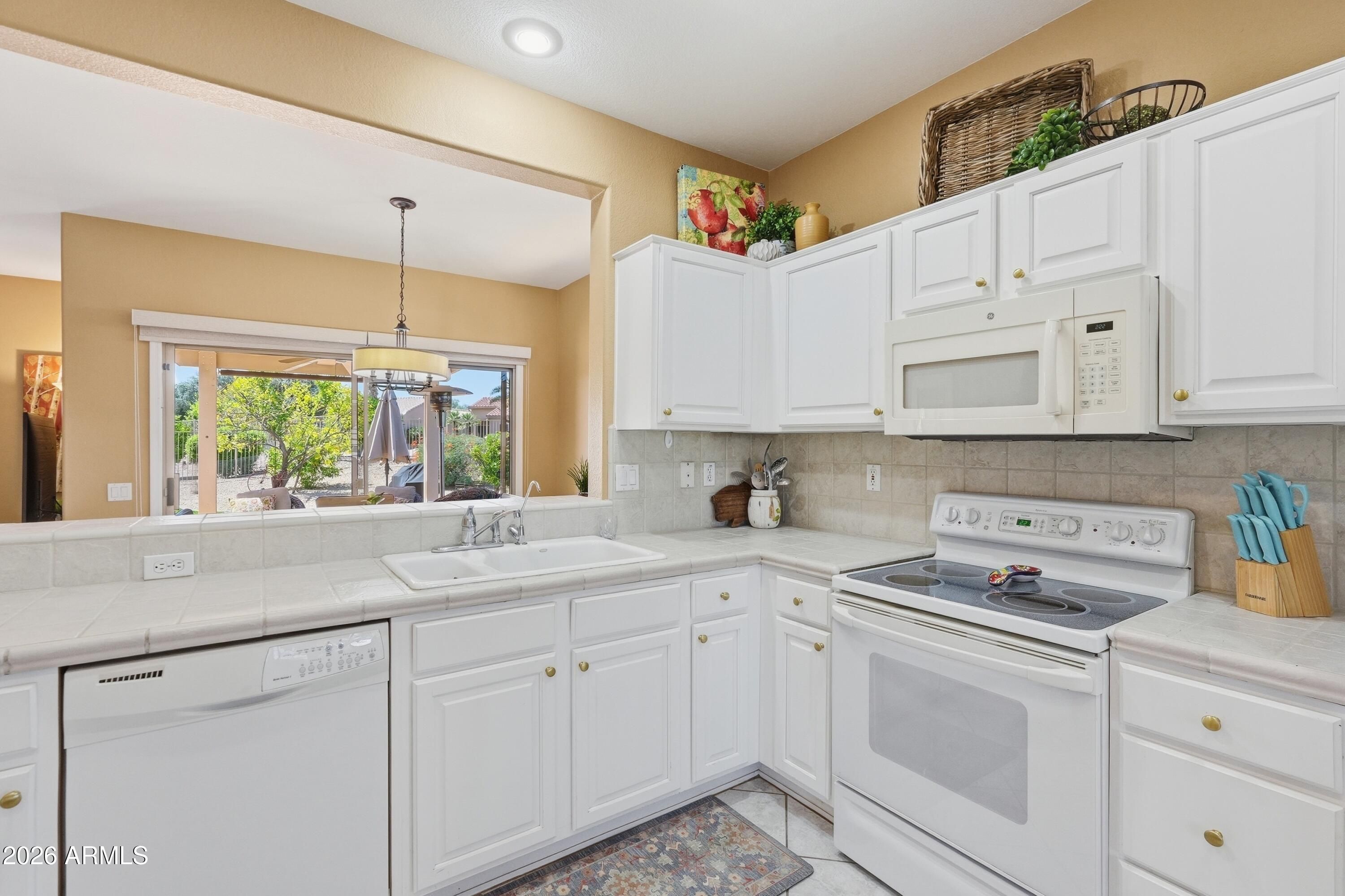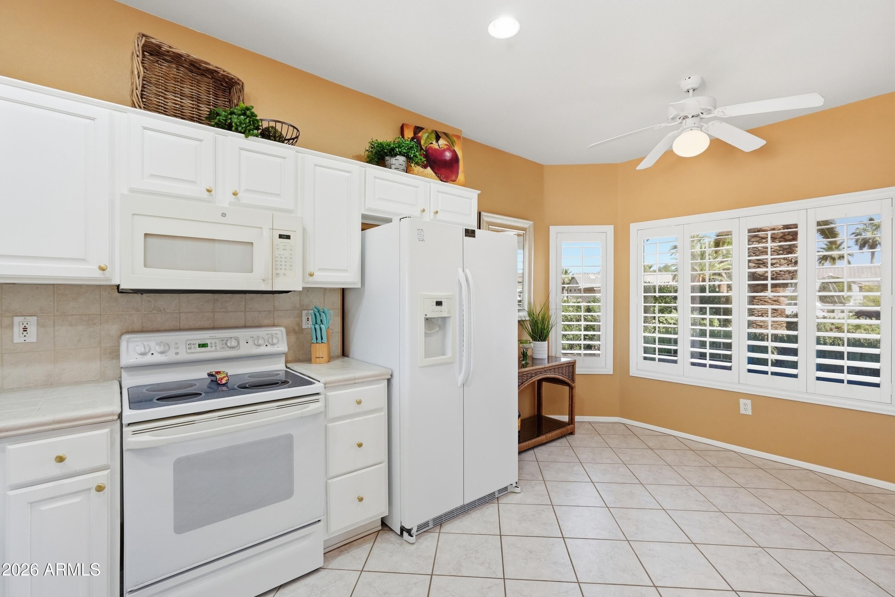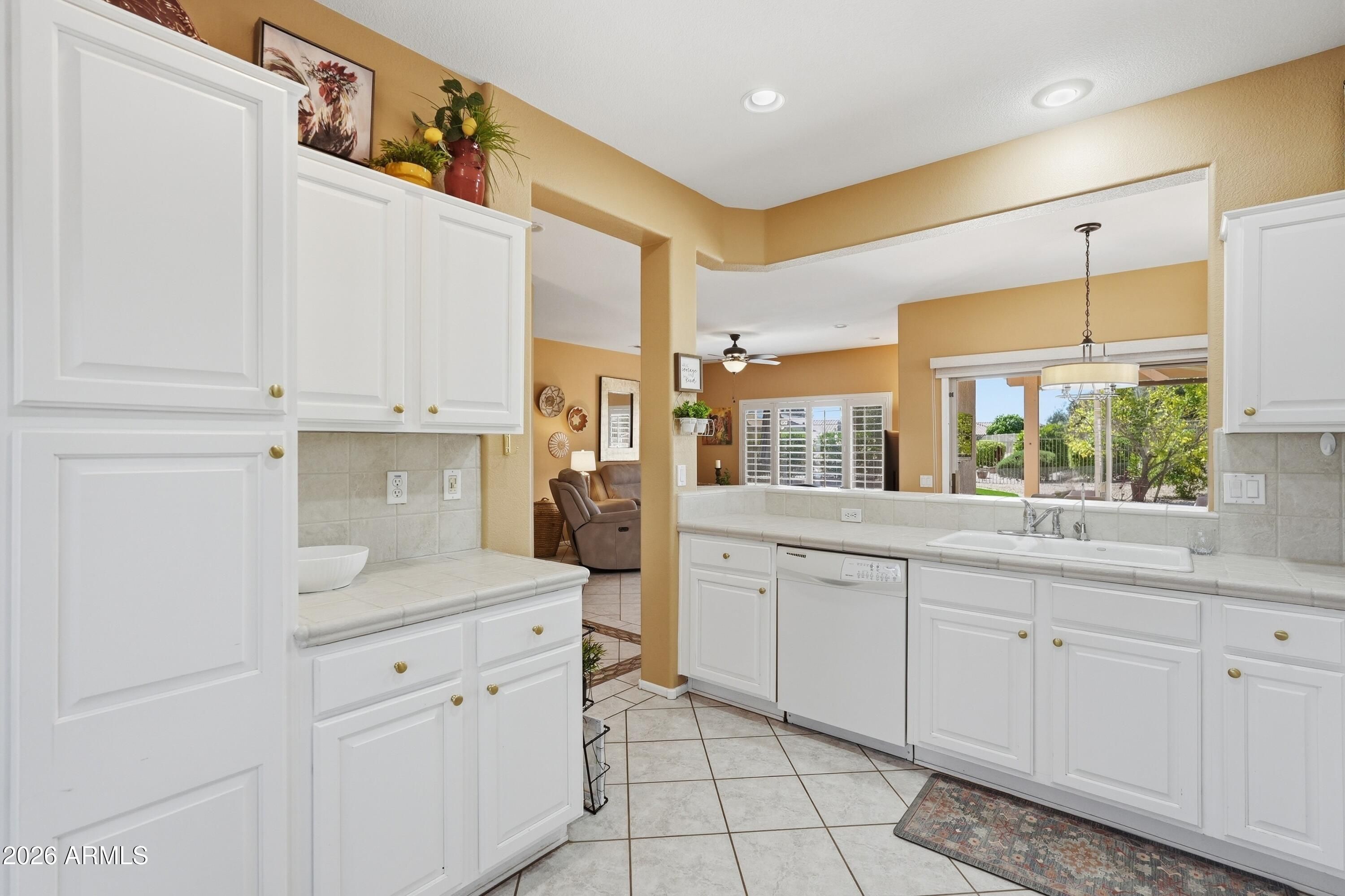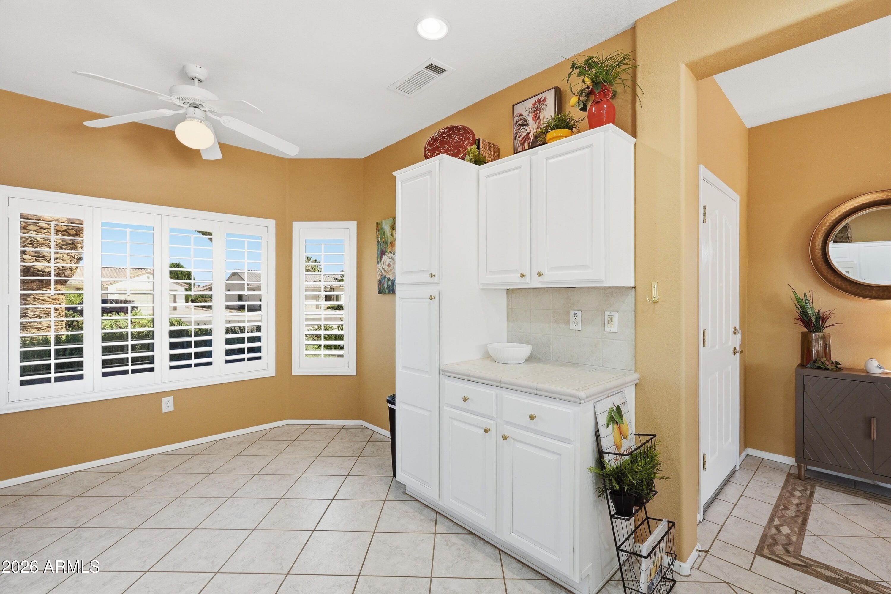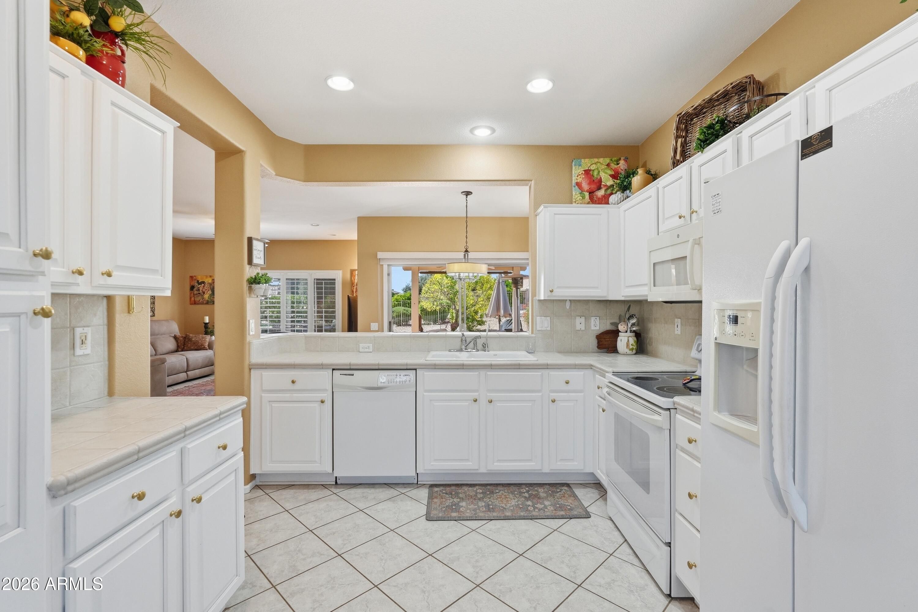 Backyard resort-style living awaits with a stunning pool installed in January 2023, complete with a relaxing sunshelf, extended covered patio with tile flooring, fragrant lemon tree, and lush greenery--perfect for entertaining or enjoying peaceful Arizona evenings. This beautifully maintained home sits on a quiet cul-de-sac and offers outstanding curb appeal with low-maintenance landscaping, charming front patio, and a 2-car garage with built-in storage. Inside, you'll find tile flooring, custom paint, plantation shutters, recessed lighting, and a bright living room that flows seamlessly into the dining area, creating a comfortable and inviting atmosphere. The kitchen features ample white cabinetry, tile backsplash, and a cozy breakfast nook ideal for casual dining. The spacious primary suite includes a bay window, walk-in closet, and private bathroom. Located in a prestigious 55+ community offering golf, clubhouse, fitness center, pool, sports courts, restaurants, and close proximity to shopping and everyday conveniences. This is Arizona living at its finest -- don't miss this exceptional opportunity.