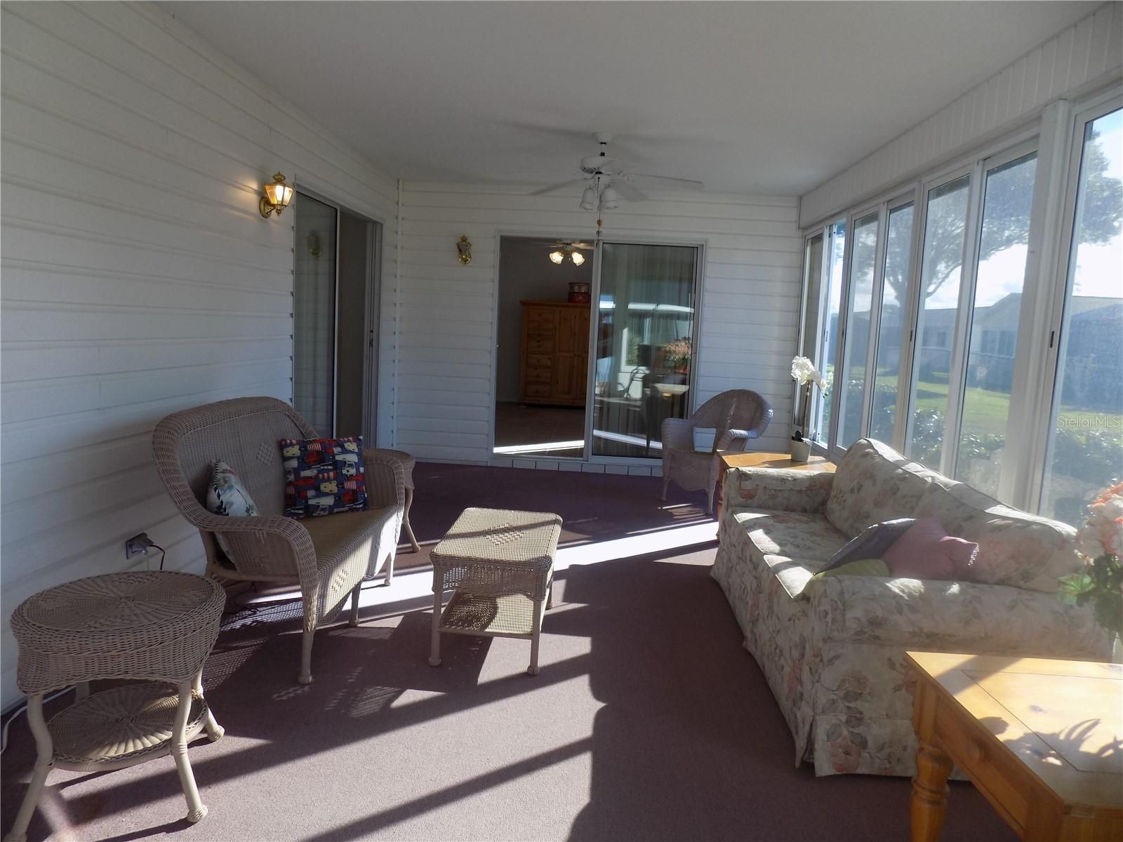 Motivated seller...... NEW Roof 2024.....NEW WINDOWS in lanai in 2021, PORTABLE AIR UNIT IN LANAI which cools easily. HVAC installed in 2009. CEILINGS ARE NOT POPCORN..... check this house out. The floor plan is one of the most popular in the neighborhood Split bedroom design along with the spacious lanai enclosed, NEW acrylic windows, and very usable as a office, craft or occasional guest room. Not an add-on so under roof and a finished area. This is a well maintained and comfortable home located in the best community near the villages. House is near the recreation center and pool and a easy walk to all your activities. Access to shopping, doctors and much more by golf cart. Walmart is a golf cart ride away. Security guard on 24 hours with a roaming guard on duty. Check this home out, promise it will be worth the walk-through.