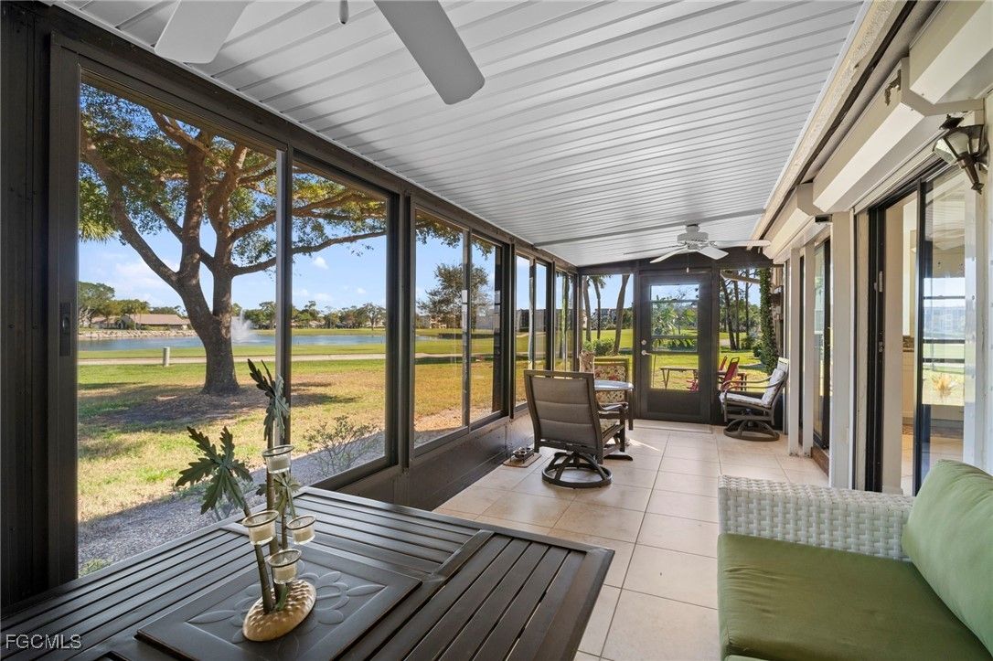Welcome to this Fully Furnished/Turnkey Biscayne Garden Villa floor plan over 1600 sq feet of living space the biggest floor plan in Seven Lakes and has gorgeous panoramic views of the 10th golf hole and the signature lake with its beautiful fountain! East-West rear exposure with natural light all day. Enjoy the winter breezes while you sit and relax on your large screened in lanai, furnished with a firepit that adds to your evening's enjoyment. Magnificent view right in front of the lake which captures the lighted water feature too. Three bedrooms and a den this floor plan offers lots of open living space for entertaining. Updated with tile flooring throughout the condo. Kitchen has shaker cabinetry with plenty of storage, a water filtering system too. Both Bathrooms have remodeled tile walk-in Showers and vanities. Impact Resistant windows (2025) and Hurricane shutters offer added protection. New roof 2024, Hot Water Heater 2023. The garage has a full-size washer and dryer, laundry tub, work bench, new tiled flooring and a screened door for your comfort. GOLF CART SPACE # 416 INCLUDED!! A Golf Cart with lithium batteries is negotiable. Quiet street yet walking distance to Tee Room (On-Site Restaurant) and TEE Off. Seven Lakes is an active adult Community!! 24 Hour Guard Gated entry. Condo fees cover your internet, cable, water, sewer, trash removal and lawn maintenance. As an owner you pay your monthly electric service. As for the outdoor activities; Executive 18-hole golf course, 6 Har-Tru Tennis Courts, Basketball, Pickle Ball Courts, Bocce, 6 Heated Pools, Shuffleboard; then for your indoor activities include Crafts, Pottery, Lapidary, Cards, hobby rooms, library, woodshop and so much more. Truly a lifestyle with an abundance of activities in your back yard. Come Visit Us and take a look at this must-see GARDEN VILLA!!