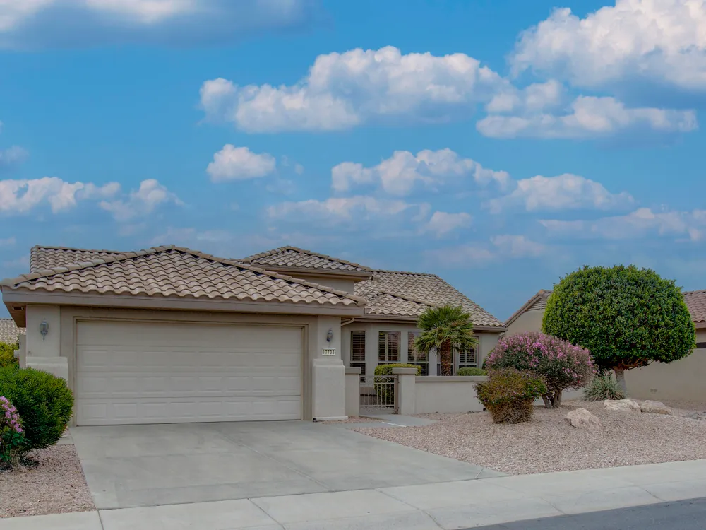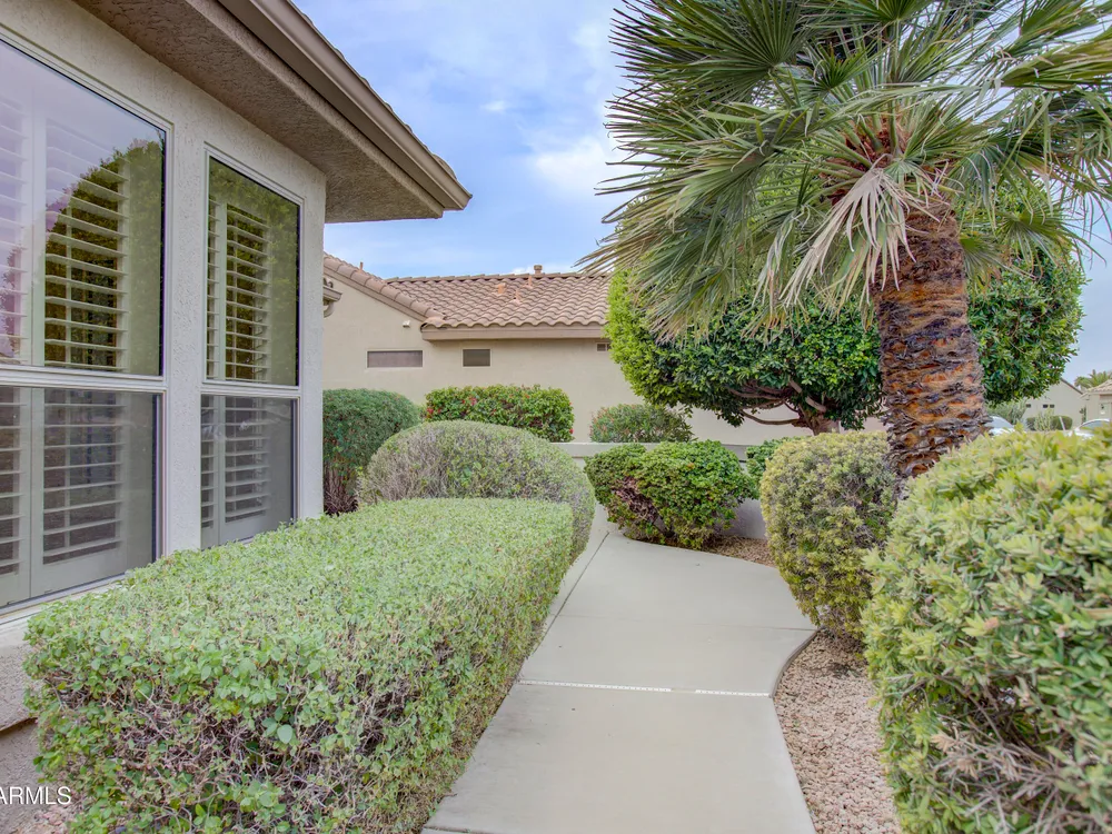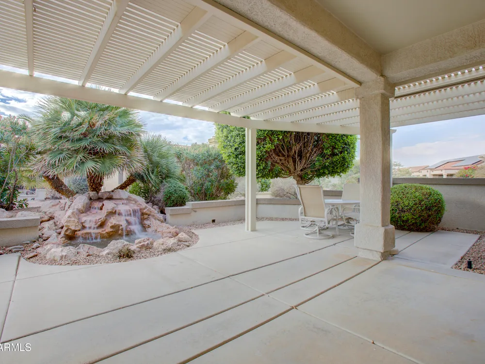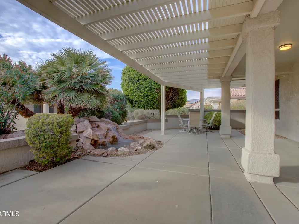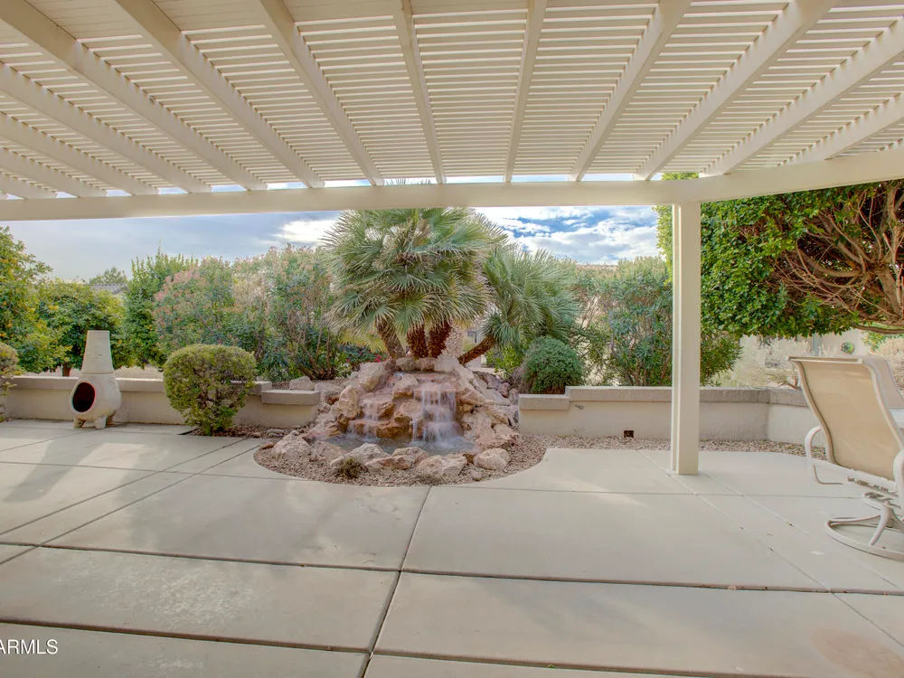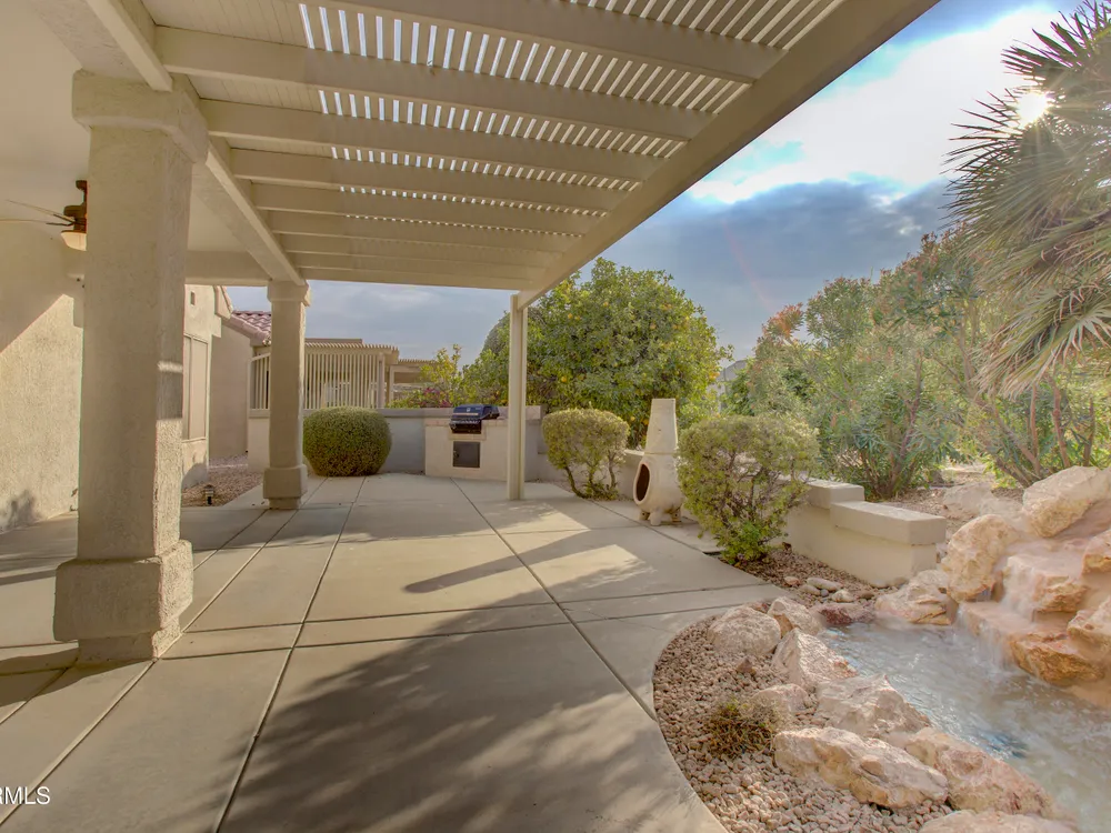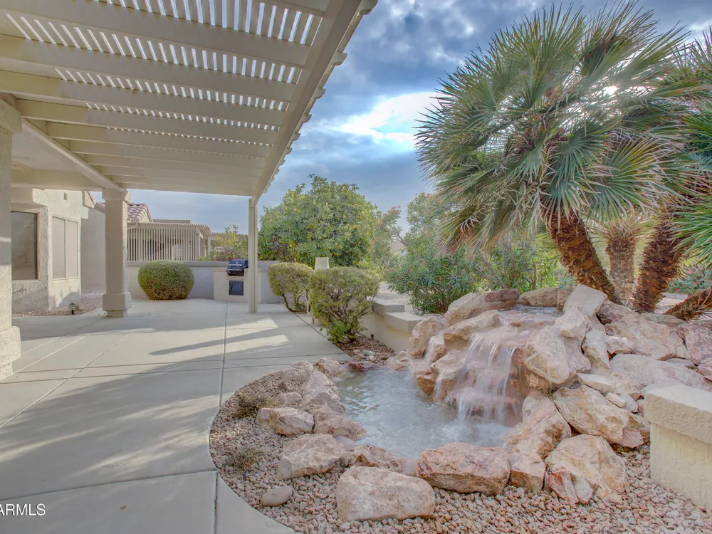 Buy a house and GET A CAR!! Original owner of this VERY clean Palo Verde floorplan home. One owner house and car. 2 bedrooms plus office/den with built in desk and shelves. Front courtyard with curved concrete sidewalk to seating area. Oasis backyard with extended pergola, built in BBQ, fountain, mountain views, and lush landscaping including grapefruit trees. A few upgrades include security doors, plantation shutters, surround sound in great room, master bedroom, and patio. Garage features built in cabinets, ceiling rack, and golf cart ramp. Sink in laundry room. New paint and carpet in 2024. Roof membrane replaced in 2023.