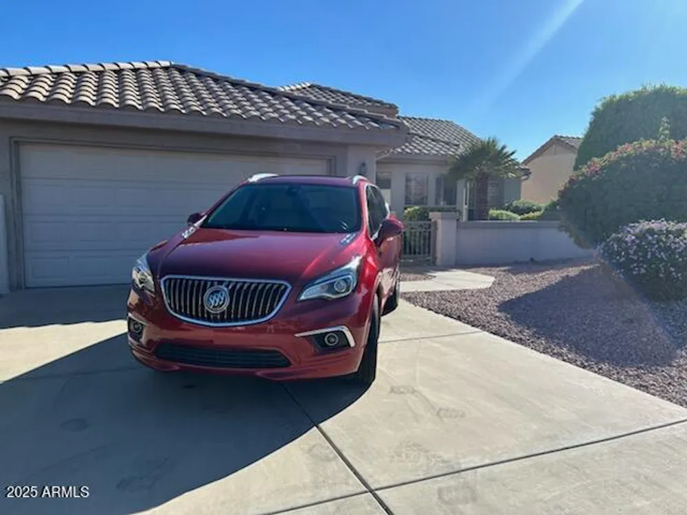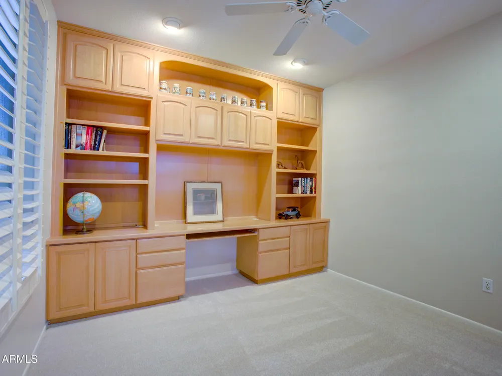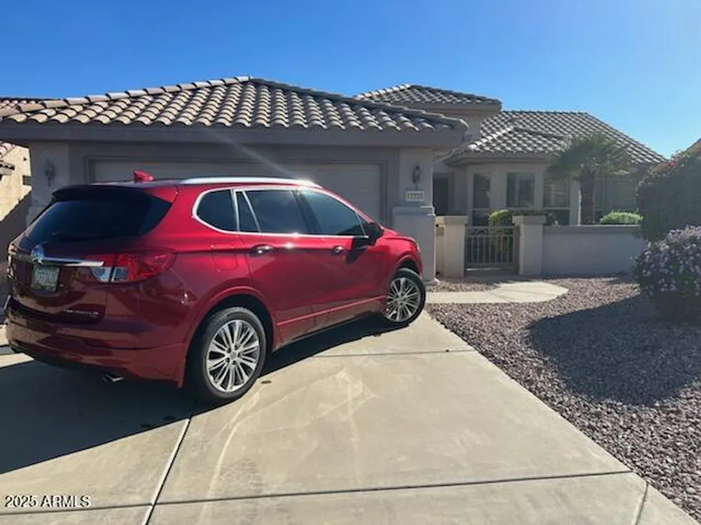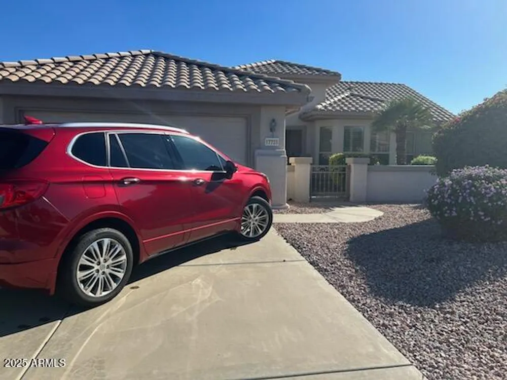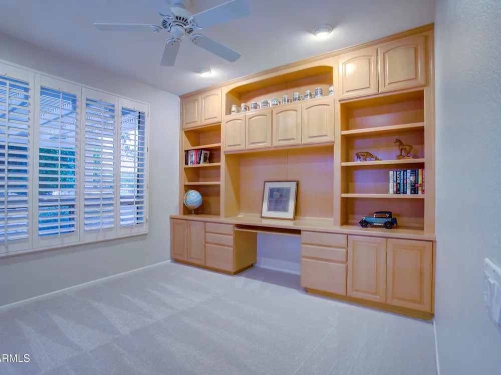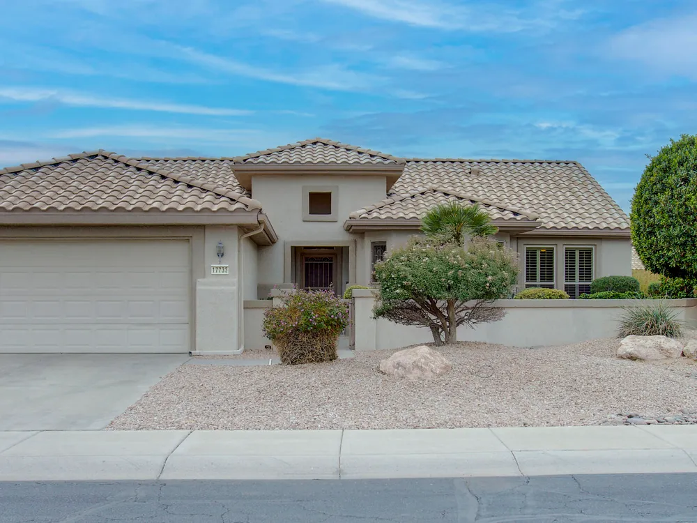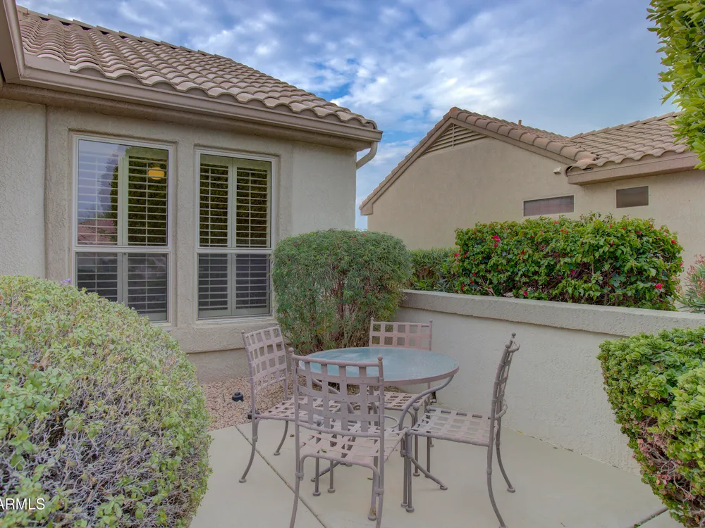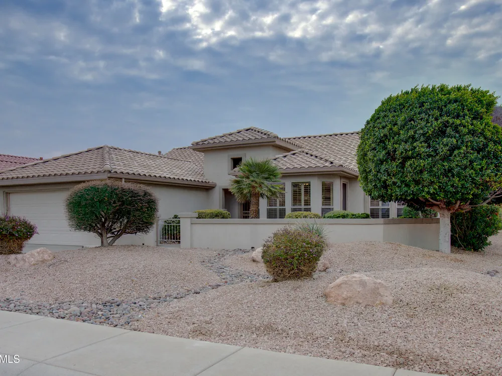 Buy a house and GET A CAR!! Original owner of this VERY clean Palo Verde floorplan home. One owner house and car. 2 bedrooms plus office/den with built in desk and shelves. Front courtyard with curved concrete sidewalk to seating area. Oasis backyard with extended pergola, built in BBQ, fountain, mountain views, and lush landscaping including grapefruit trees. A few upgrades include security doors, plantation shutters, surround sound in great room, master bedroom, and patio. Garage features built in cabinets, ceiling rack, and golf cart ramp. Sink in laundry room. New paint and carpet in 2024. Roof membrane replaced in 2023.