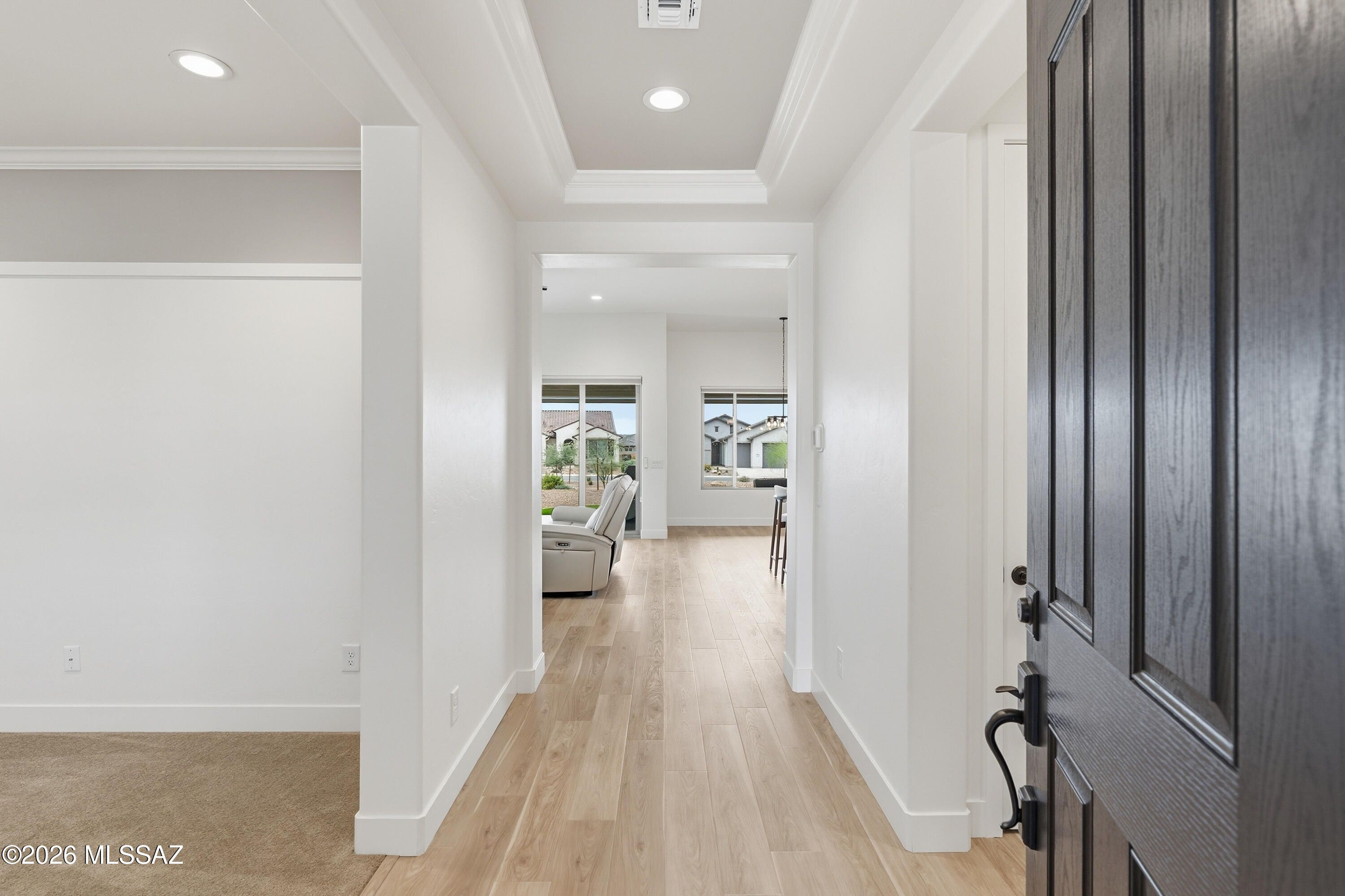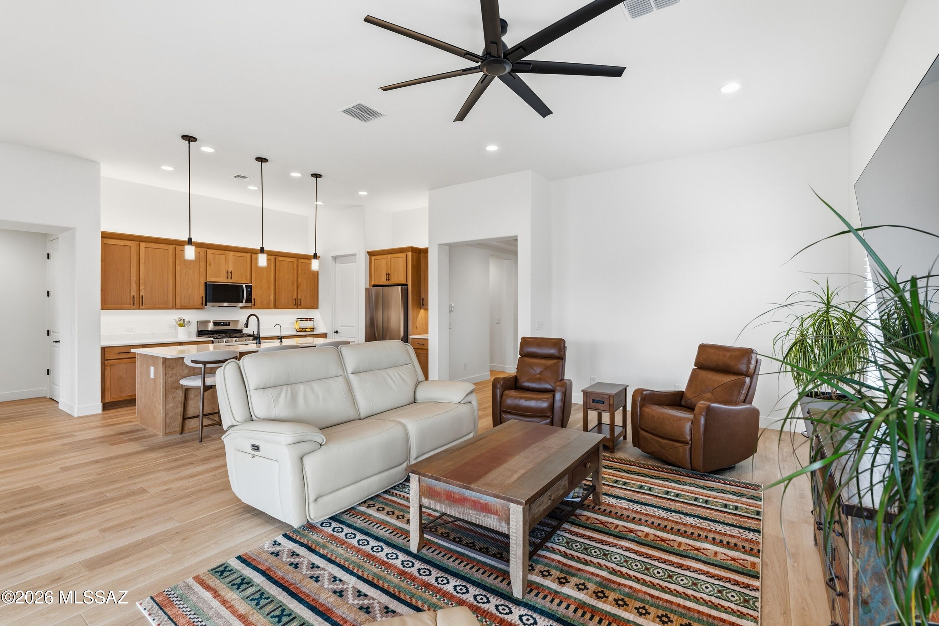 Better than new and beautifully upgraded, this 2025 Mandara model offers 1,884 sq. ft., 2 BR, 2.5 BA plus a den, with completed landscaping, window treatments, and appliances already in place! Just move right in and enjoy! Situated to capture scenic mountain views, this home features outstanding architectural upgrades including a front porch with cool deck coating, a 4' extended-length garage with golf cart bay and epoxy floors, and a 5' extended driveway. Enter through the welcoming foyer accented with crown molding, leading to a den with two-tone paint, crown molding, and recessed-fit plantation shutters. The open-concept great room is filled with natural light, and features a 4-panel center-opening glass slider that connects seamlessly to the rear patio for true indoor-outdoor living.