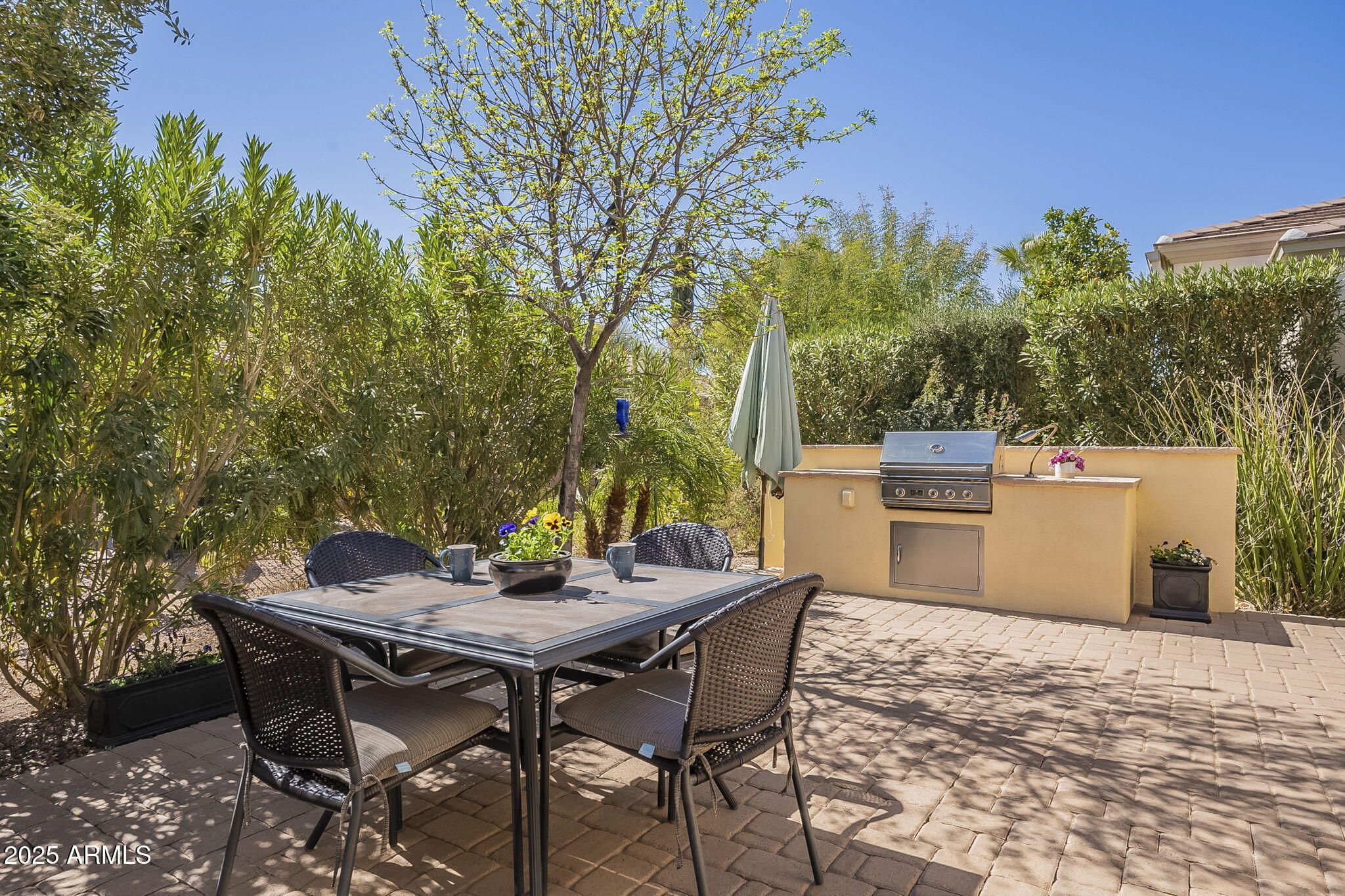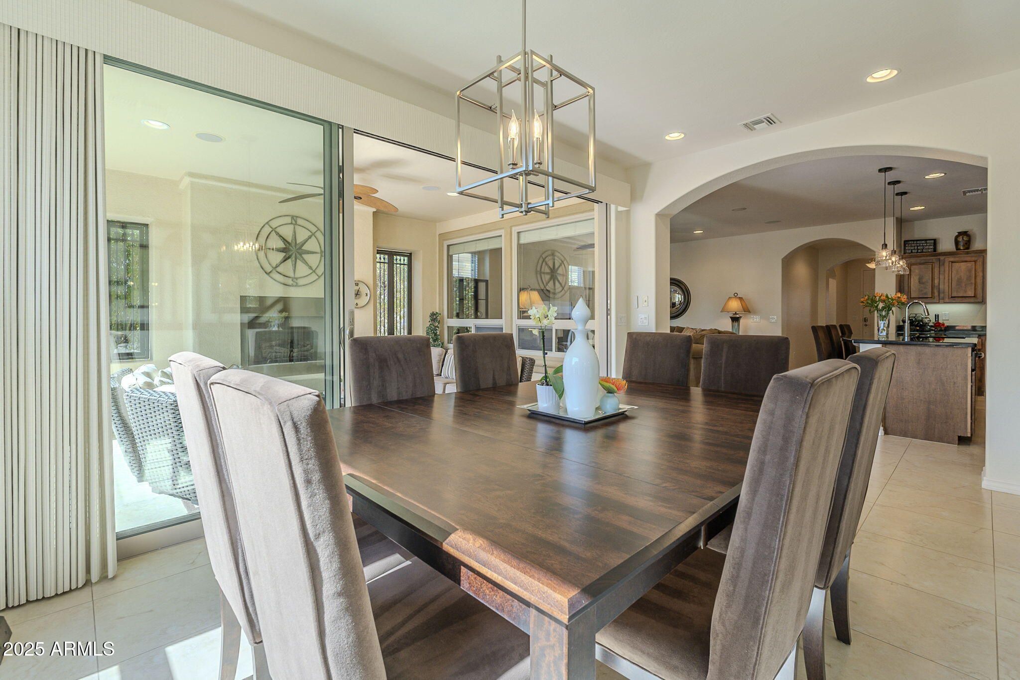 This beautifully furnished home in Encanterra Country Club is perfectly situated on a premium homesite backing to a wash, providing added privacy and serene desert views. Enjoy your private backyard retreat with lush, mature landscaping, a paved patio, built-in BBQ, and a cozy gas fireplace under the expansive covered patio, complete with a remote-controlled sun screen for year-round comfort. Inside, the open-concept design connects the spacious kitchen, dining, and living areas, offering the perfect setting for entertaining or relaxing at home. The desirable 3-bedroom layout adds flexibility, while upgrades such as solar, central vacuum, and a rolling wall of glass that blends indoor and outdoor living make this property truly stand out. A turnkey opportunity you don't want to miss!