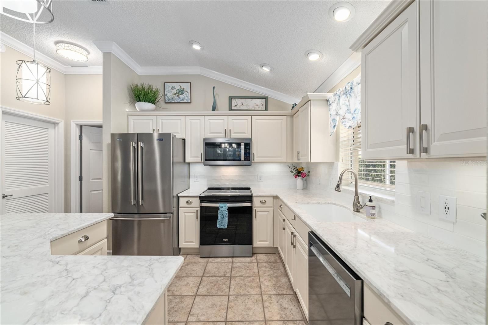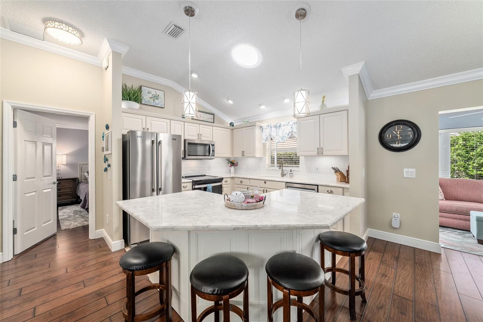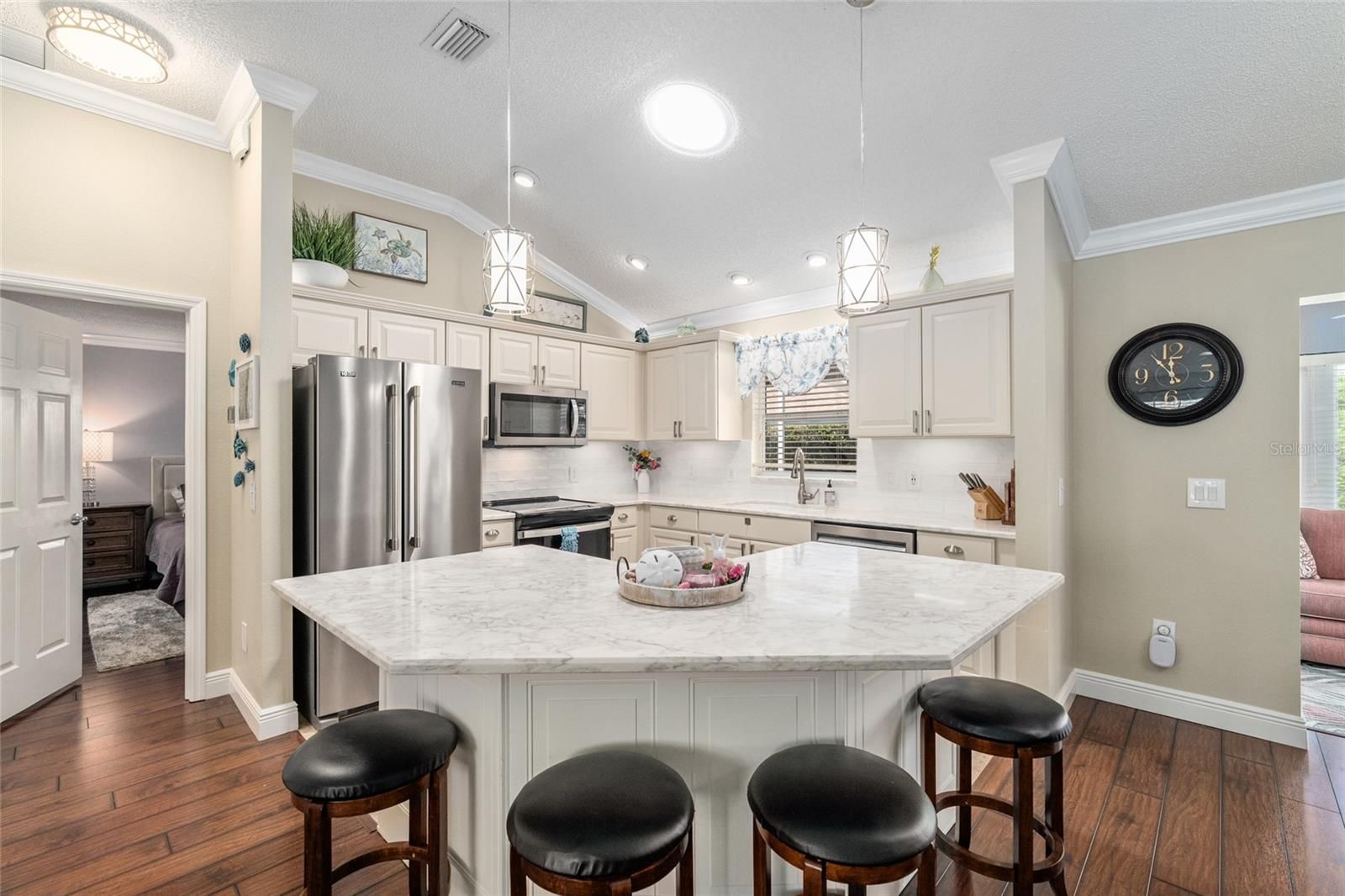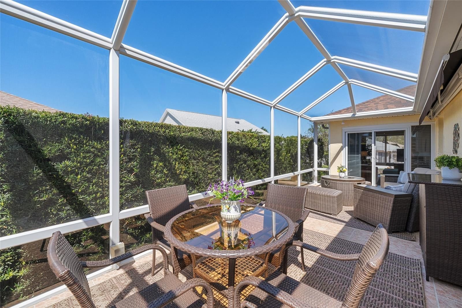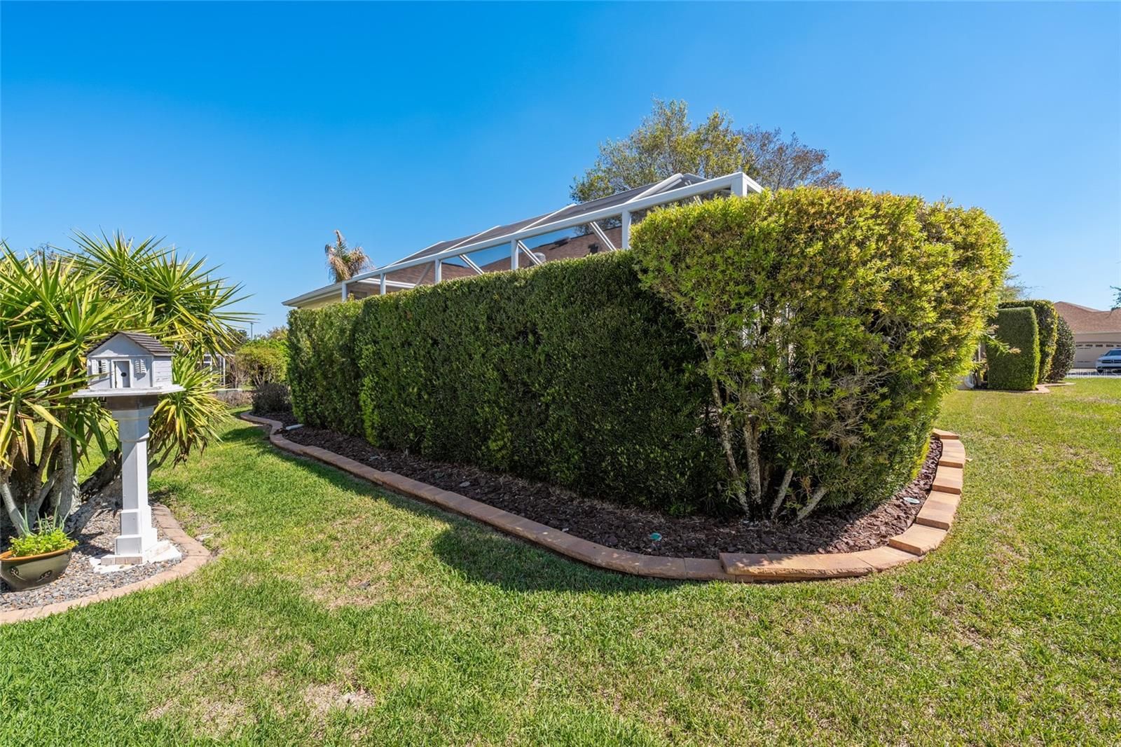 Welcome to this beautifully updated 3-bedroom, 2-bath Azalea (Maple) home, ideally located on a quiet cul-de-sac in the highly sought-after Village of Piedmont, featuring the added benefit of no bond. From the moment you arrive, the home impresses with its charming curb appeal, highlighted by a painted driveway and mature, lush landscaping. Step inside through the elegant glass front door to discover a bright, open floor plan with warm brown laminate flooring flowing throughout the main living areas and fresh interior paint enhancing the space. The kitchen is both stylish and functional, offering tile flooring, quartz countertops, a solar tube for natural light, a decorative backsplash, cabinet rollouts, and a spacious breakfast bar with seating for four, all complemented by brand-new 2025 appliances. Upscale details such as crown molding, 6-inch baseboards, and marble windowsills add a refined touch throughout. The primary suite provides a peaceful retreat with a walk-in closet and a beautifully updated en-suite bath featuring dual vanities, quartz counters, modern lighting, and a tiled walk-in shower. Guest bedrooms are generously sized and share a well-appointed updated bathroom. A tiled indoor laundry room with ample cabinetry includes a Maytag washer and gas dryer for added convenience. The home also features an enclosed Florida room that opens to a private birdcage patio, perfect for relaxing or entertaining, complete with tile flooring, tall privacy shrubs, and a retractable awning with LED lighting. Additional highlights include an oversized two-car garage plus a golf cart garage, epoxy flooring, an extended driveway, attic decking, and pull-down stairs for extra storage. Major updates include a 2018 roof, 2018 Trane HVAC system, and a 2019 water heater, along with energy-efficient features such as a solar attic fan and enhanced insulation. A new garbage disposal and irrigation control box were added in 2023. Conveniently located near recreation centers, pools, shopping, dining, and golf courses, including CHATHAM SQUARE, CALUMET GROVE, FIRST RESPONDERS, and MULBERRY GROVE, this home offers the perfect blend of comfort, style, and location—ready for you to move in and enjoy the convenience of being minutes away from MULBERRY GROVE SHOPPING CENTER, NANCY LOPEZ COUNTRY CLUB, and 4 EXECUTIVE GOLF COURSES. The SAVANNAH CENTER and GLENVIEW COUNTRY CLUB, along with restaurants and medical facilities, are just a short drive down the road. Come take a look at this beautiful home yourself, as this amazing opportunity will not last long!!