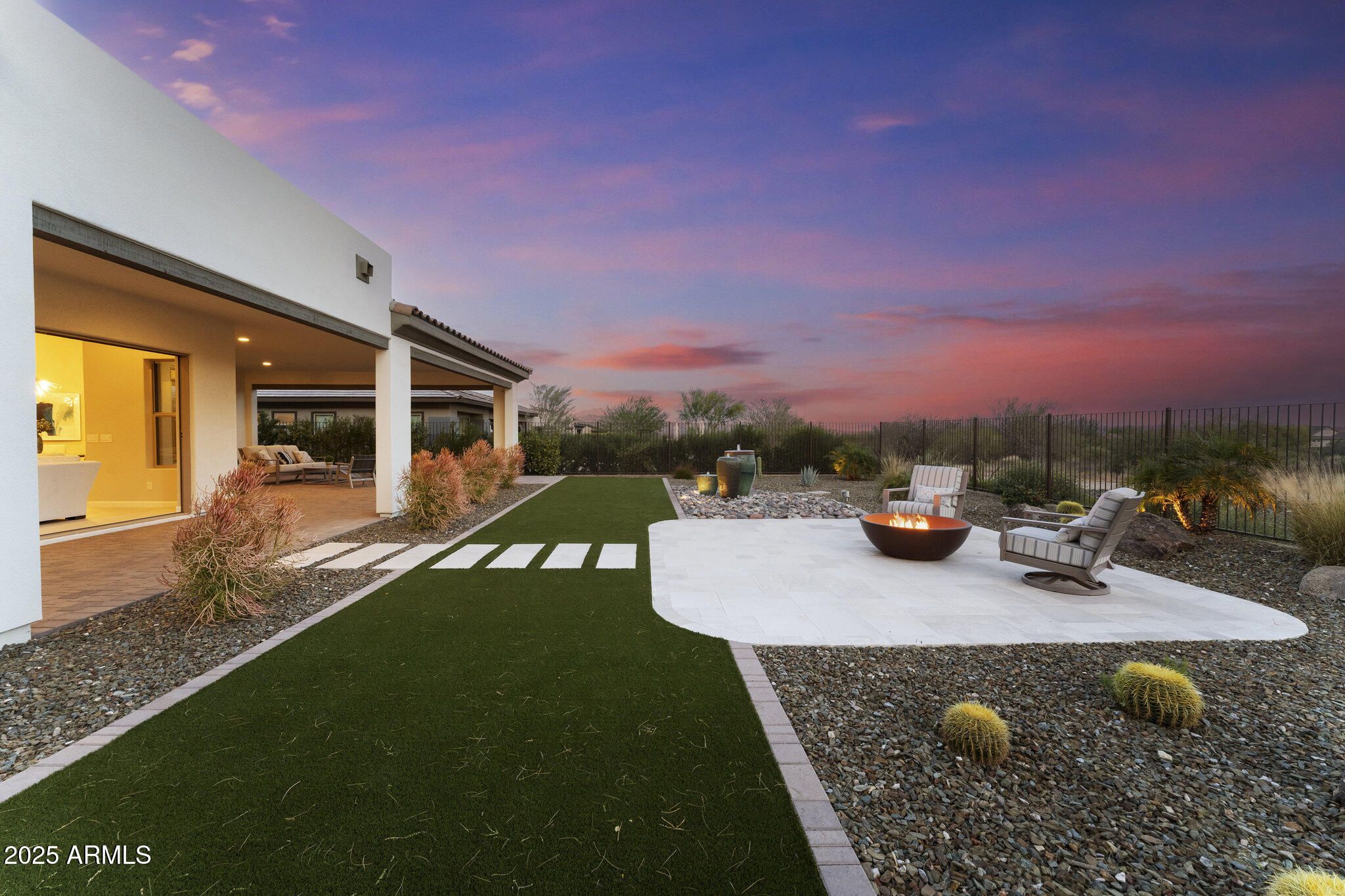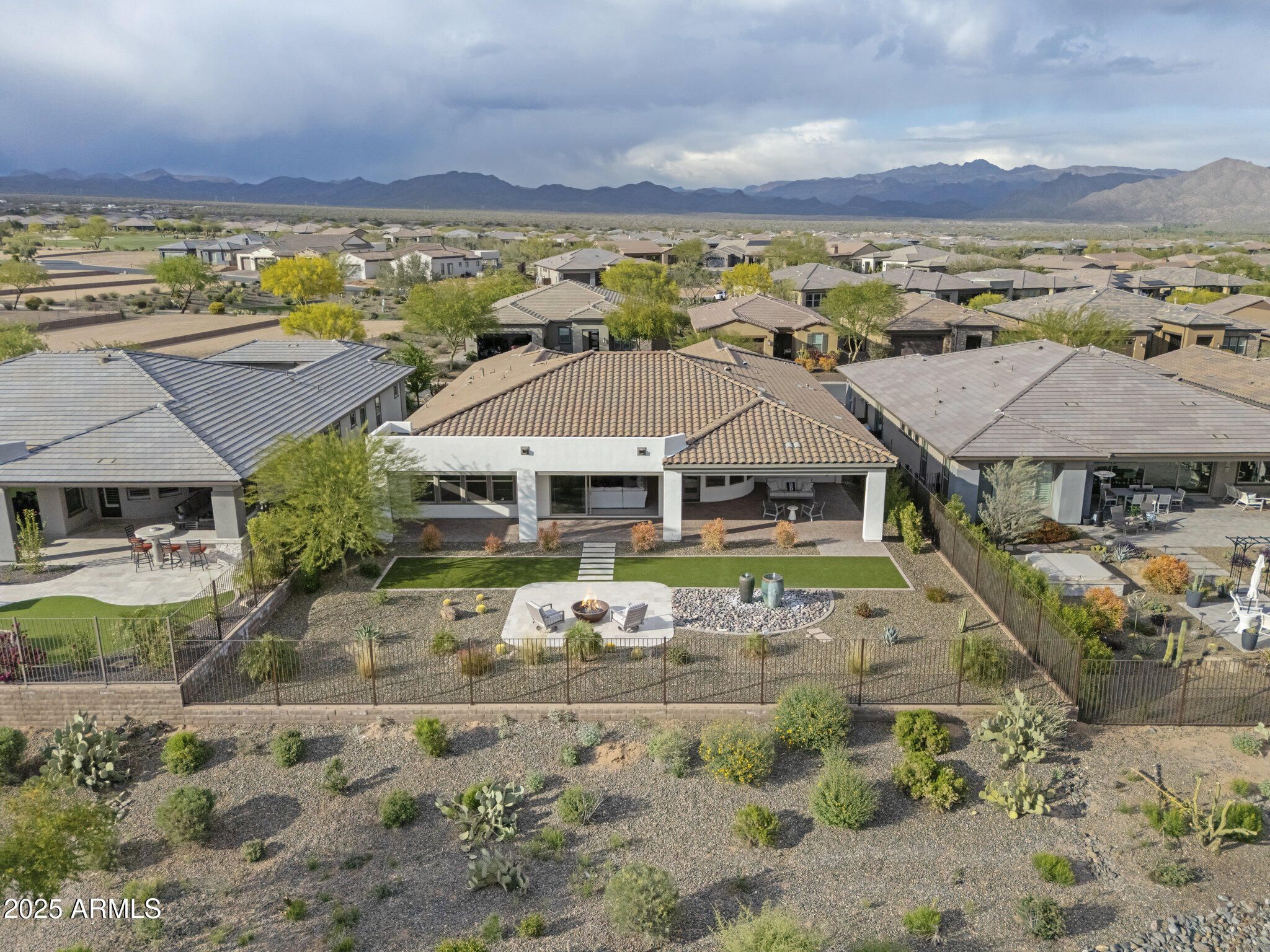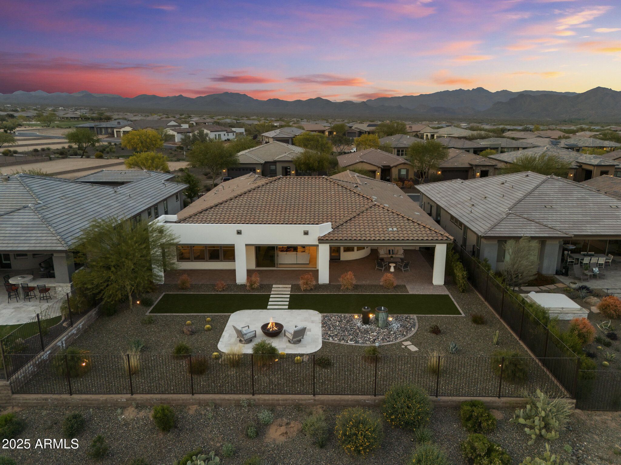 Welcome to your dream home in Trilogy at Verde River! This stunning, Orion model residence boasts over 3,000 square feet of exquisite living space, virtually brand new and flooded with natural light. The thoughtful split floor plan features a lavish primary suite, privately positioned away from the two guest rooms, each with en suite bathrooms. The gourmet chef's kitchen, complete with upgraded appliances, seamlessly flows into the spacious living room, enhanced by sliding doors that open to a covered patio, perfect for entertaining. Enjoy the ultimate movie experience in the media room with a Sonos surround sound system that extends to the back patios, and savor serene desert evenings by the fire pit, overlooking the 11th fairway with no neighbors behind. With the resort style