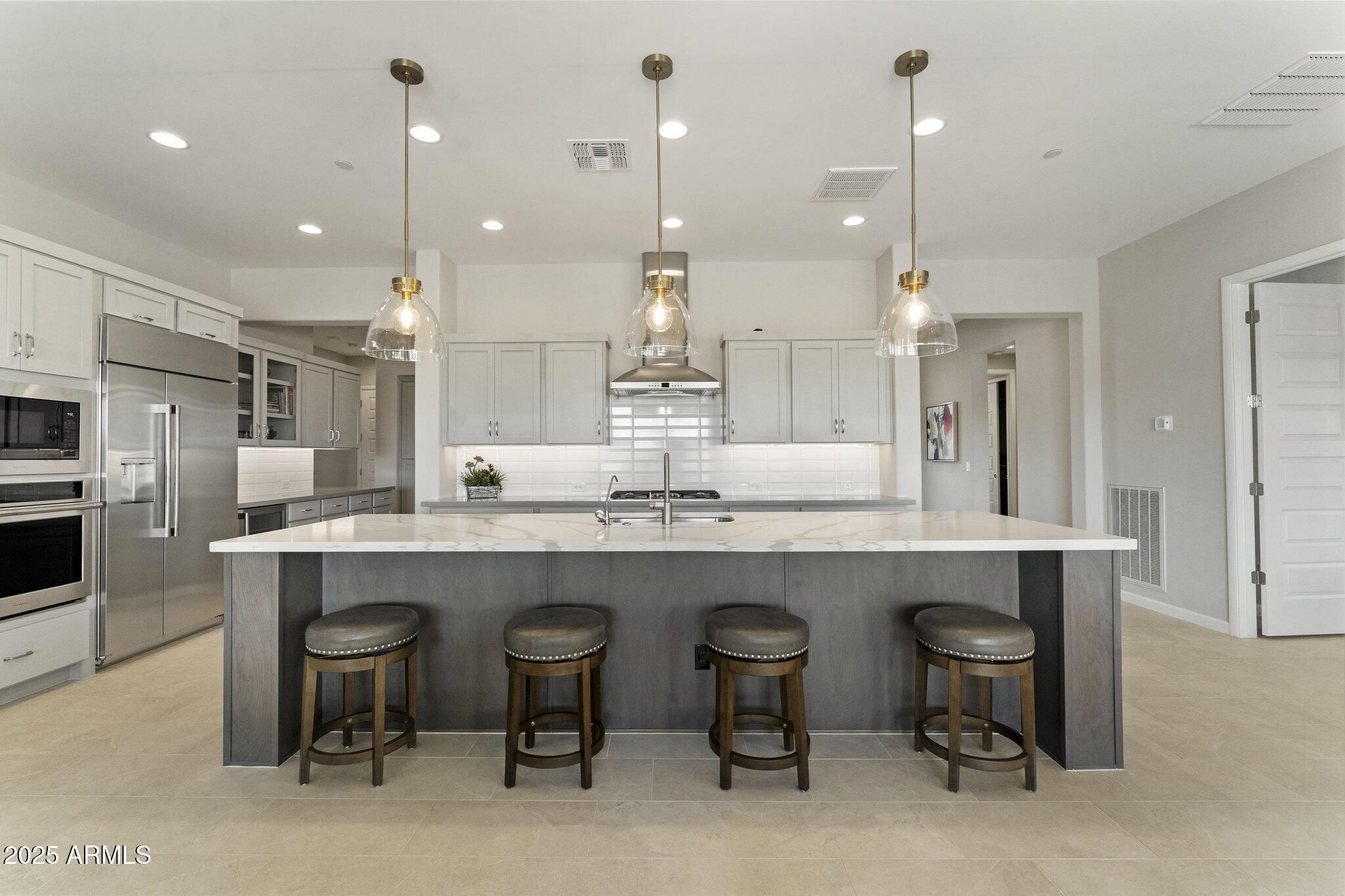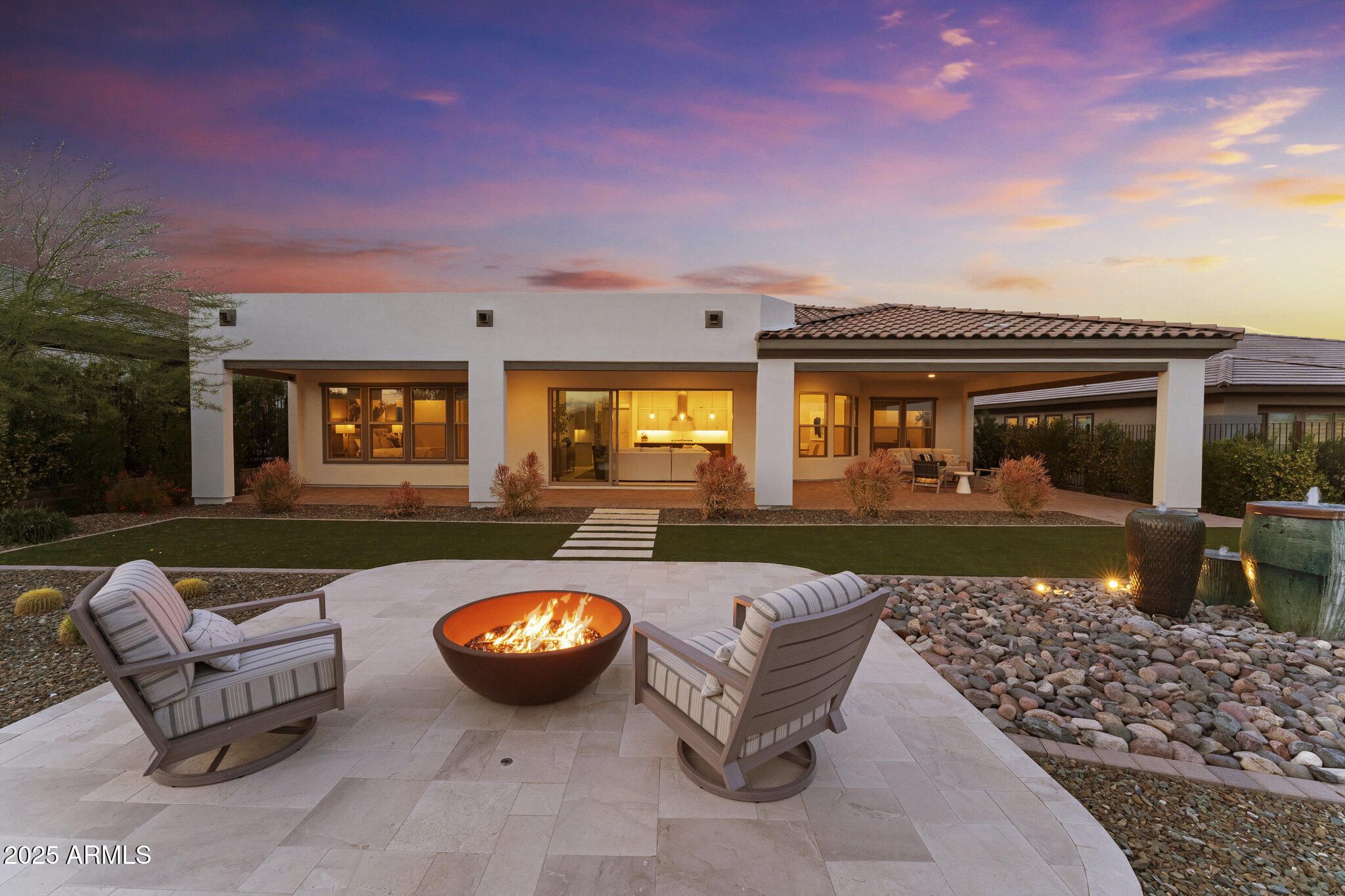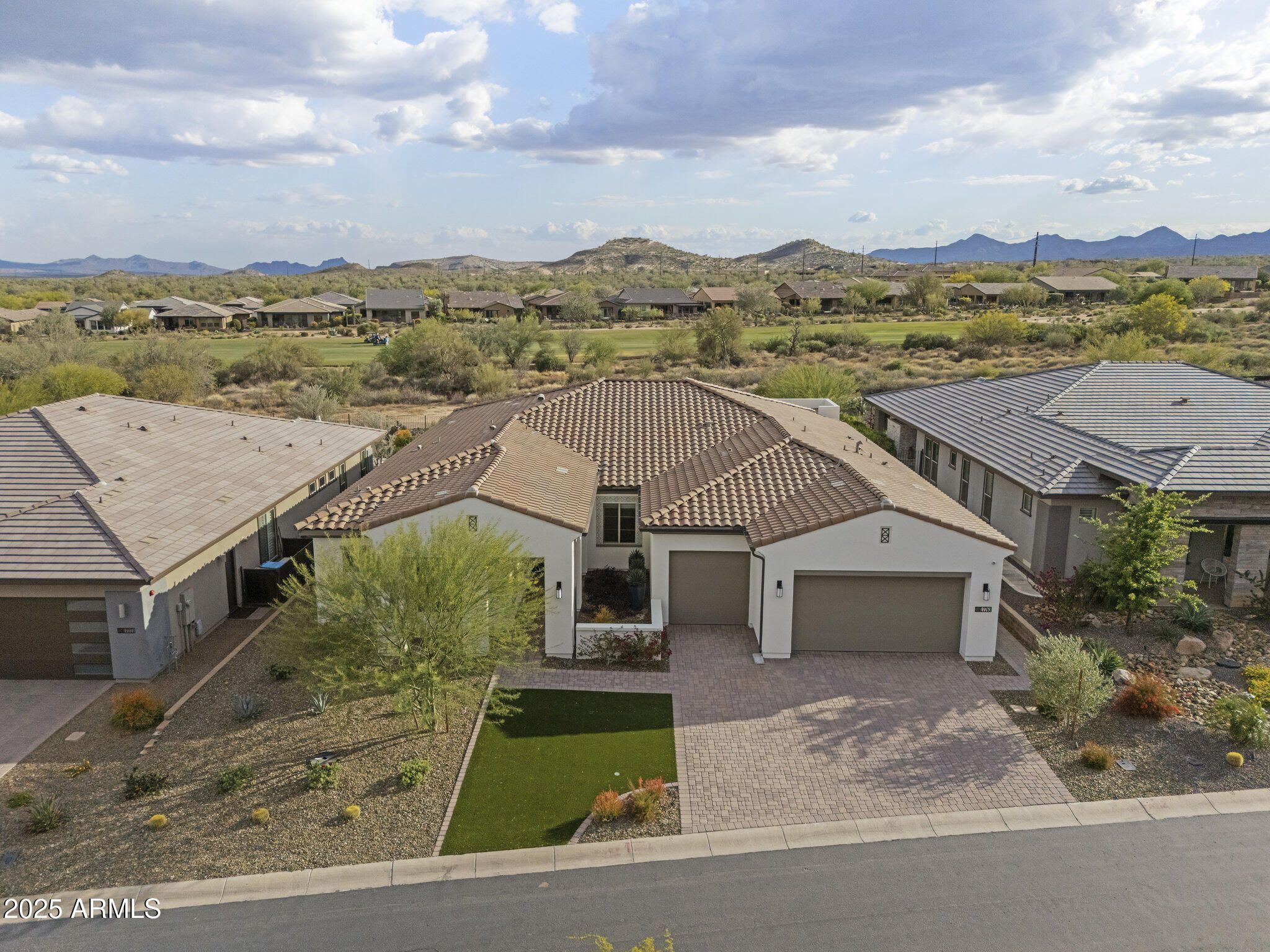 Welcome to your dream home in Trilogy at Verde River! This stunning, Orion model residence boasts over 3,000 square feet of exquisite living space, virtually brand new and flooded with natural light. The thoughtful split floor plan features a lavish primary suite, privately positioned away from the two guest rooms, each with en suite bathrooms. The gourmet chef's kitchen, complete with upgraded appliances, seamlessly flows into the spacious living room, enhanced by sliding doors that open to a covered patio, perfect for entertaining. Enjoy the ultimate movie experience in the media room with a Sonos surround sound system that extends to the back patios, and savor serene desert evenings by the fire pit, overlooking the 11th fairway with no neighbors behind. With the resort style