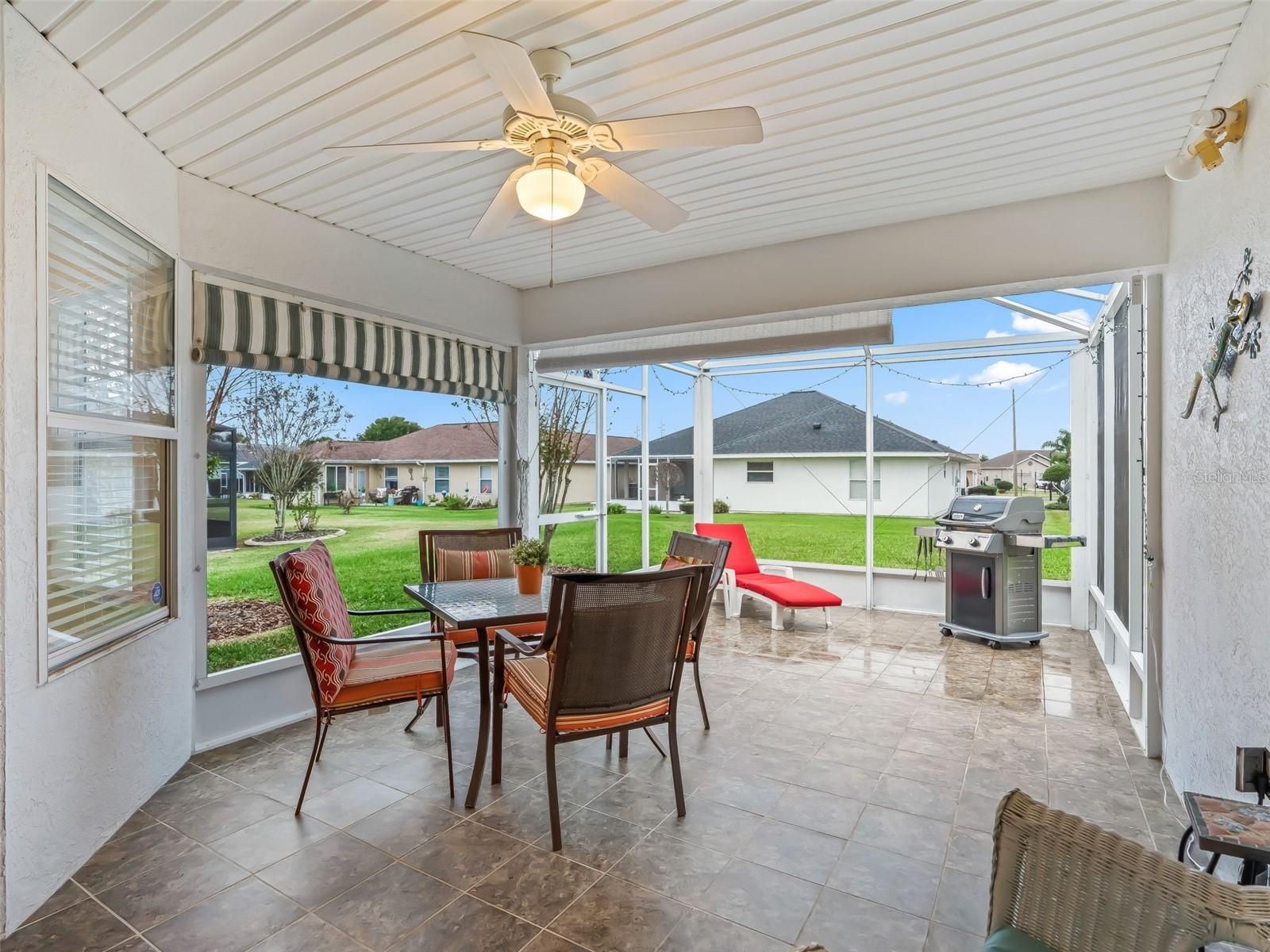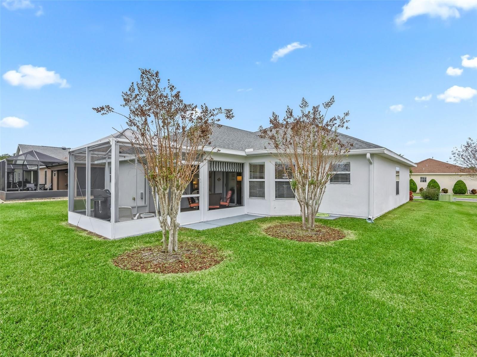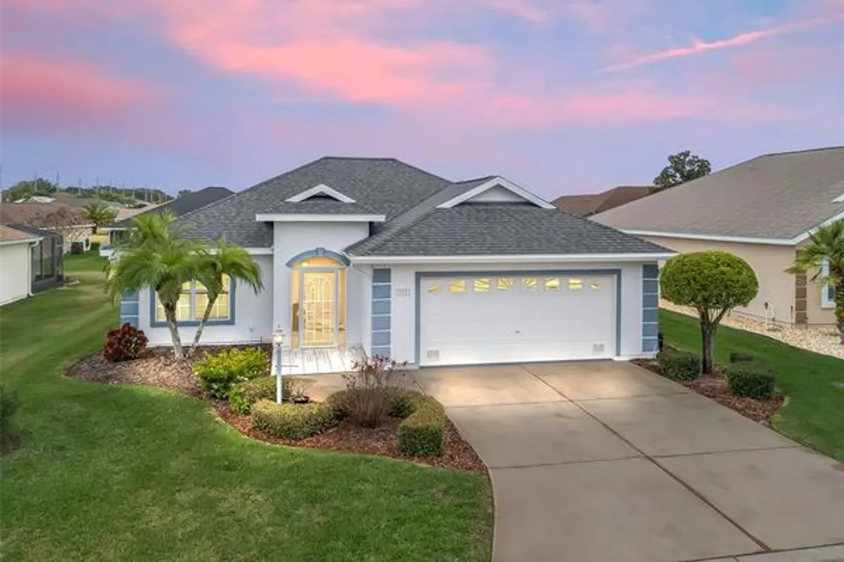 Welcome to this beautifully maintained 3-bedroom, 2-bath home with a spacious 2-car garage, located in the highly sought-after Stonecrest 55+ gated community. Lush landscaping and a screened front entry with elegant tiled flooring create an inviting first impression. Step inside to a welcoming foyer featuring tile flooring and graceful arched entryways throughout the home. A tasteful combination of luxury vinyl, wood laminate, and tile flooring adds both style and durability. The bright kitchen offers an eating area, light wood cabinetry, granite-look countertops, light appliances, tile backsplash, and a convenient closet pantry. An elevated counter with pendant lighting provides additional counter space, while above AND below-cabinet lighting and a ceiling fan complete the space. A separate formal dining room is perfect for entertaining. The spacious primary suite features sliding glass doors leading to the lanai, a ceiling fan, walk-in closet, linen closet, and a beautifully tiled glass walk-in shower. Two additional bedrooms are located near the second bath, which includes a vanity and a tub/shower combination for added convenience. The open great room boasts vaulted ceilings and sliding glass doors that lead to the lovely, partially covered lanai. The expansive screened lanai features roll-down shades and attractive tiled flooring, ideal for relaxing or enjoying Florida’s beautiful weather year-round. Additional highlights include an indoor laundry room and a large two-car garage. Furnishings may be available separately. Stonecrest is a truly gated, active 55+ community offering spacious lots, 24-hour security, private roads, and an impressive array of amenities. Residents enjoy an 18-hole championship golf course, multiple pools, pickleball courts, softball, the Broad Stripes Golf & Social Club, and over 80 clubs to join. Conveniently located off Highway 441, Stonecrest provides easy access to shopping, banking, dining, and more. Schedule your private viewing now!