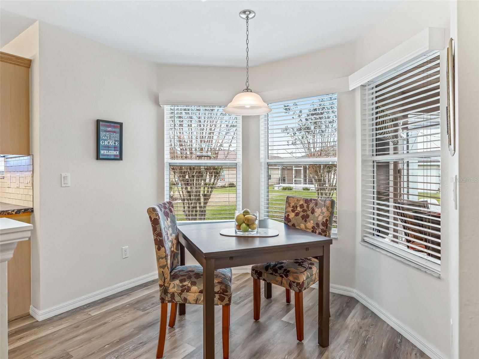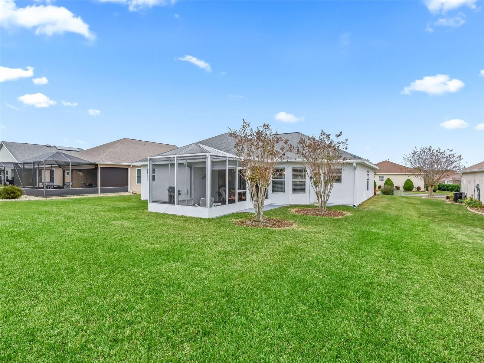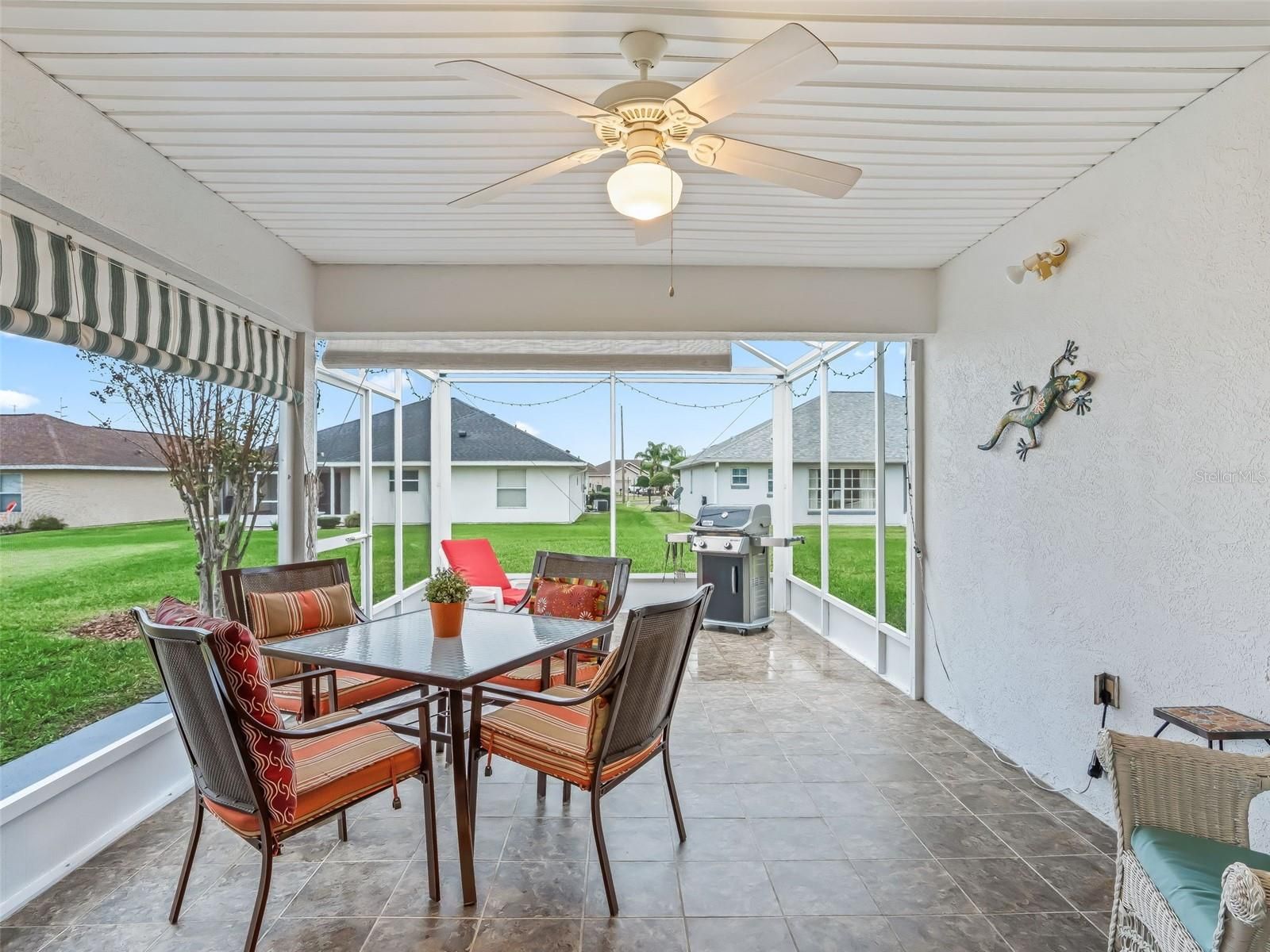 Welcome to this beautifully maintained 3-bedroom, 2-bath home with a spacious 2-car garage, located in the highly sought-after Stonecrest 55+ gated community. Lush landscaping and a screened front entry with elegant tiled flooring create an inviting first impression. Step inside to a welcoming foyer featuring tile flooring and graceful arched entryways throughout the home. A tasteful combination of luxury vinyl, wood laminate, and tile flooring adds both style and durability. The bright kitchen offers an eating area, light wood cabinetry, granite-look countertops, light appliances, tile backsplash, and a convenient closet pantry. An elevated counter with pendant lighting provides additional counter space, while above AND below-cabinet lighting and a ceiling fan complete the space. A separate formal dining room is perfect for entertaining. The spacious primary suite features sliding glass doors leading to the lanai, a ceiling fan, walk-in closet, linen closet, and a beautifully tiled glass walk-in shower. Two additional bedrooms are located near the second bath, which includes a vanity and a tub/shower combination for added convenience. The open great room boasts vaulted ceilings and sliding glass doors that lead to the lovely, partially covered lanai. The expansive screened lanai features roll-down shades and attractive tiled flooring, ideal for relaxing or enjoying Florida’s beautiful weather year-round. Additional highlights include an indoor laundry room and a large two-car garage. Furnishings may be available separately. Stonecrest is a truly gated, active 55+ community offering spacious lots, 24-hour security, private roads, and an impressive array of amenities. Residents enjoy an 18-hole championship golf course, multiple pools, pickleball courts, softball, the Broad Stripes Golf & Social Club, and over 80 clubs to join. Conveniently located off Highway 441, Stonecrest provides easy access to shopping, banking, dining, and more. Schedule your private viewing now!
