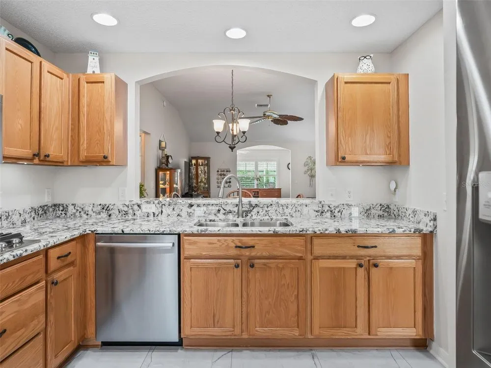 - Ceiling Fan(s), Eat-in Kitchen, Living/Dining Room, Split Bedrooms, Stone Counters, Vaulted Ceiling(s), Walk-In Closet(s), Window Treatments