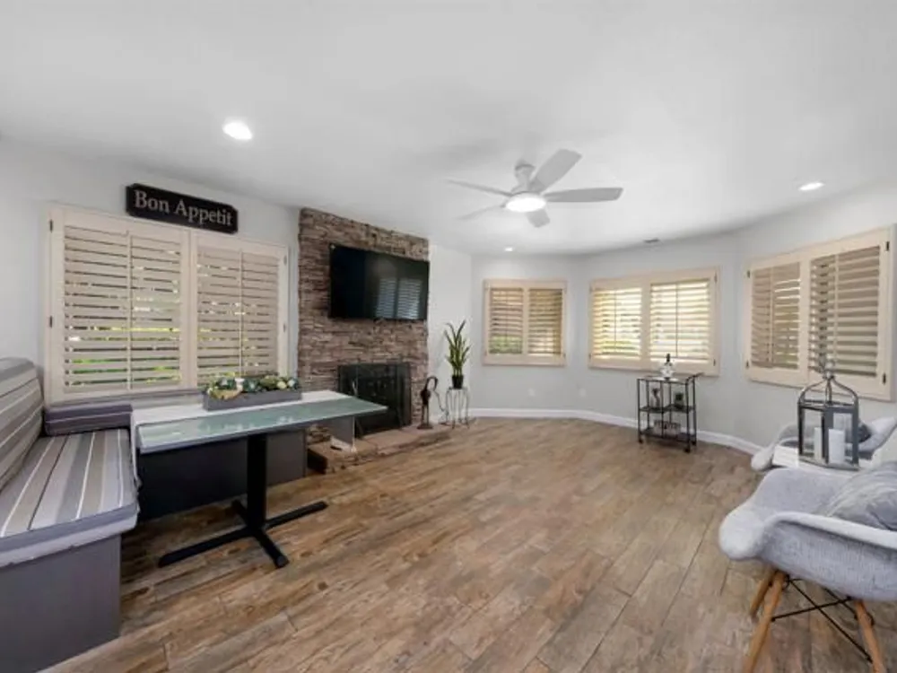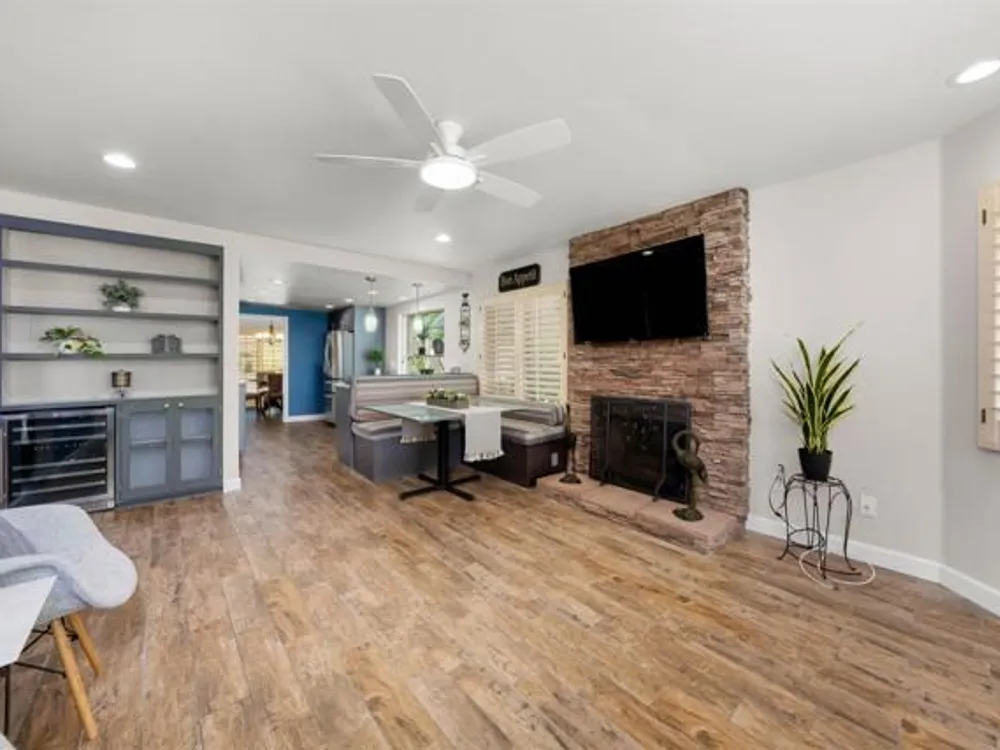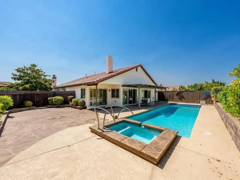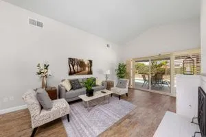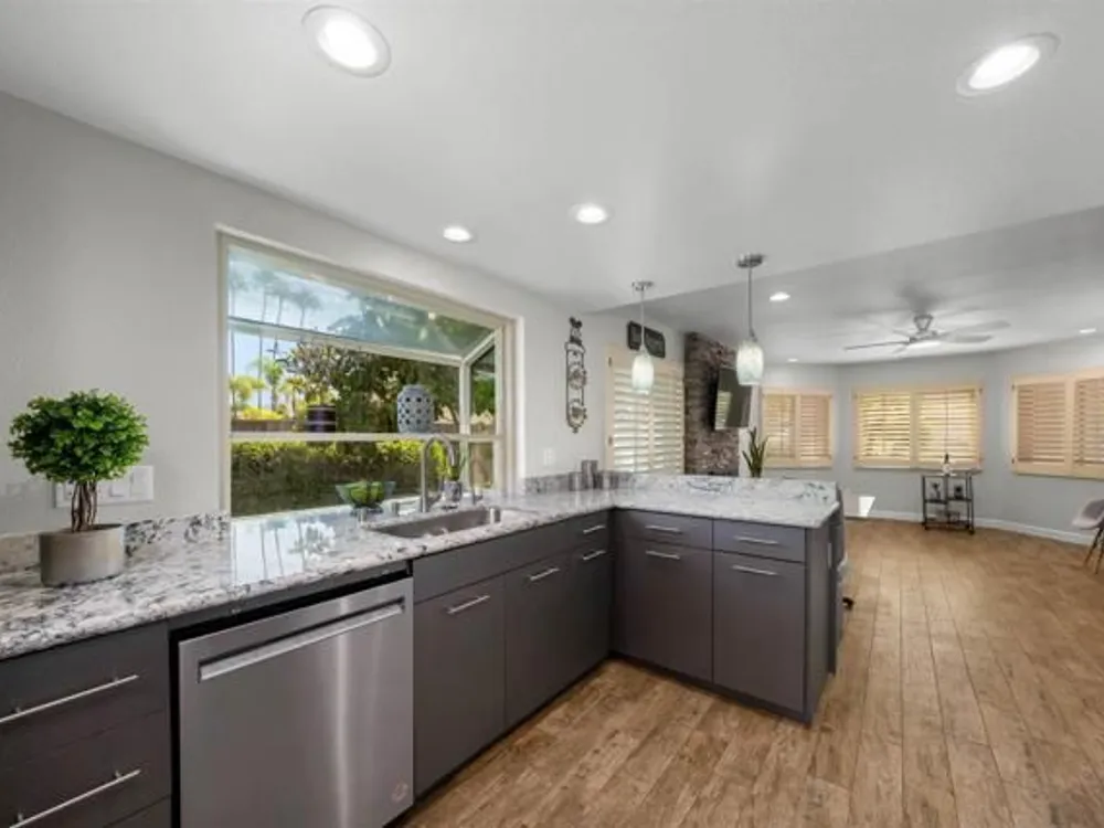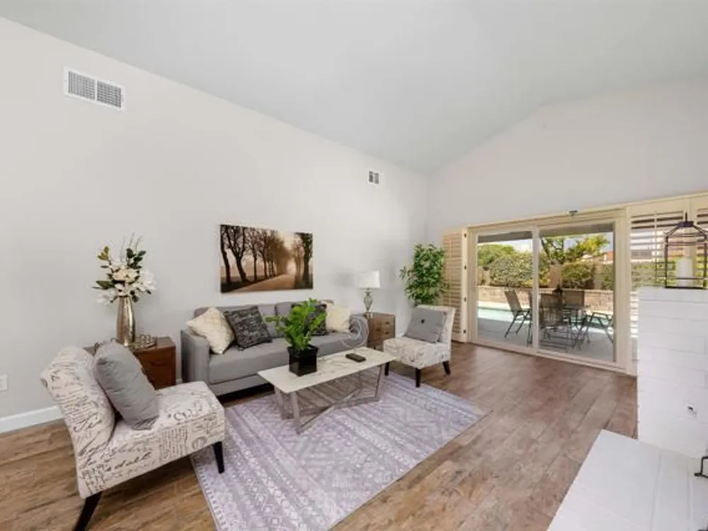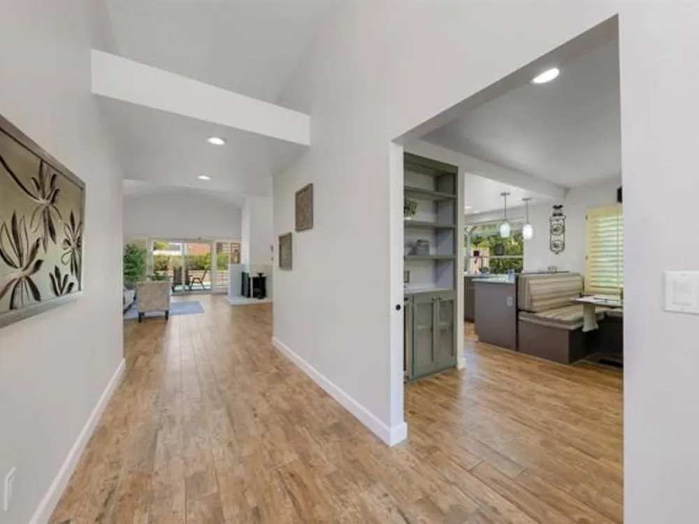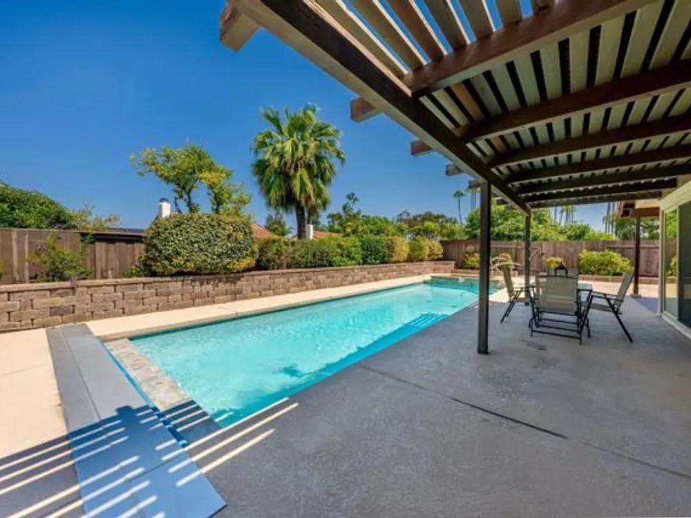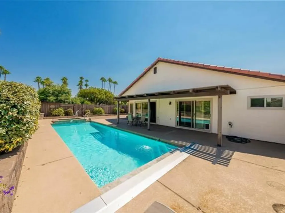Remodeled & Move-In Ready! Step into luxury and comfort in this recently remodeled & upgraded 3-bedroom, 2-bath home designed for easy living and elegant entertaining. Every detail has been thoughtfully updated from the custom double glass entry doors generating a stunning first impression to the designer tile wood-look flooring to beautifully renewed baths creating a fresh, modern feel throughout. Inside, enjoy a spacious living room with fireplace, a separate and welcoming family room with another fireplace & a convenient wine frig both featuring high ceilings enhancing the open, airy atmosphere. A gourmet kitchen with new cabinets, spacious quartz countertops, all new double oven, smooth-top range, dishwasher & refrigerator all enhanced with a bay window & recessed lighting adjacent to the formal dining room with Plantation Shutters framing the back patio, pool & spa. The Primary Suite is a retreat of its own, offering double closets, mirrored doors & a spa-like bath with dual sinks & a separate water closet and ceiling fans throughout keep every room comfortable. The 2-car attached garage is finished with a gleaming floor, a work area and extra storage. Step out back through one of three sliding glass doors to your private backyard oasis: covered patio, lap pool with automated cover, spa, a sunny side patio - EVEN a separate fenced garden & orchard. Producing avocado, apple, lemon, orange & grapefruit trees plus a raised garden bed, perfect for homegrown delights. The lot is beautifully landscaped for low maintenance assuring you more time to enjoy all that is here. This is more than a home. It's a lifestyle placed on a cul-de-sac lot in a wonderfully welcoming 55+ community.