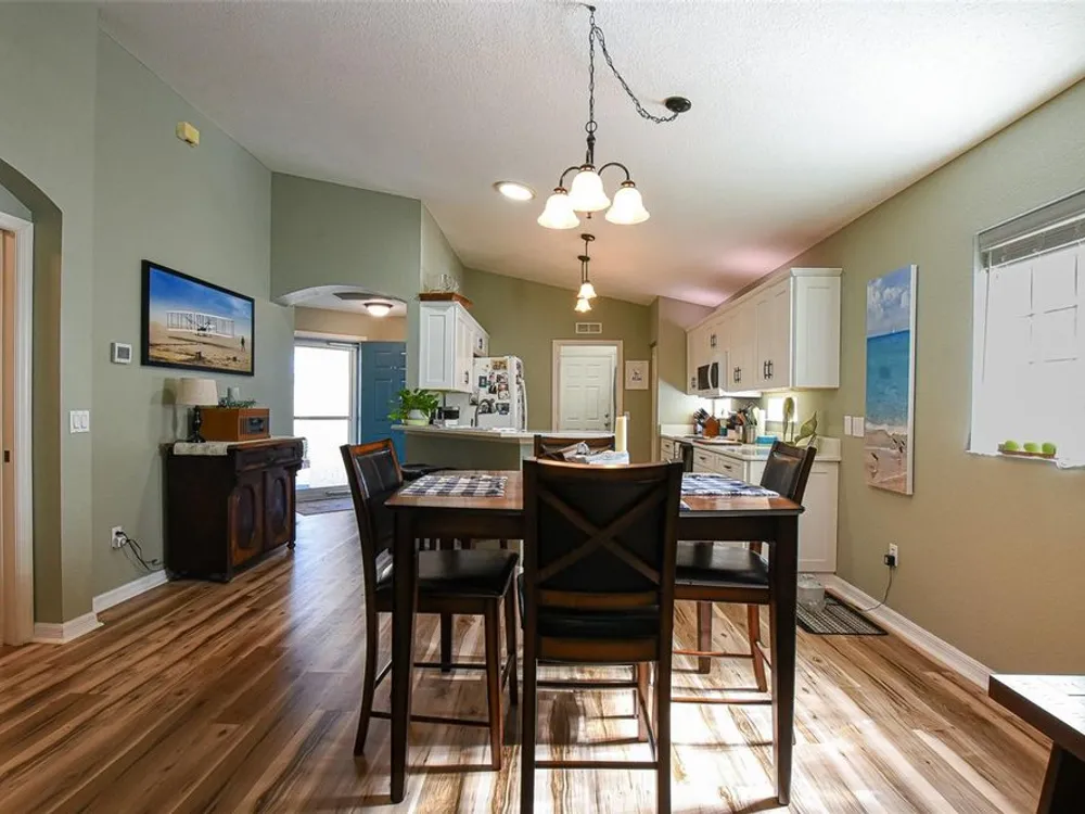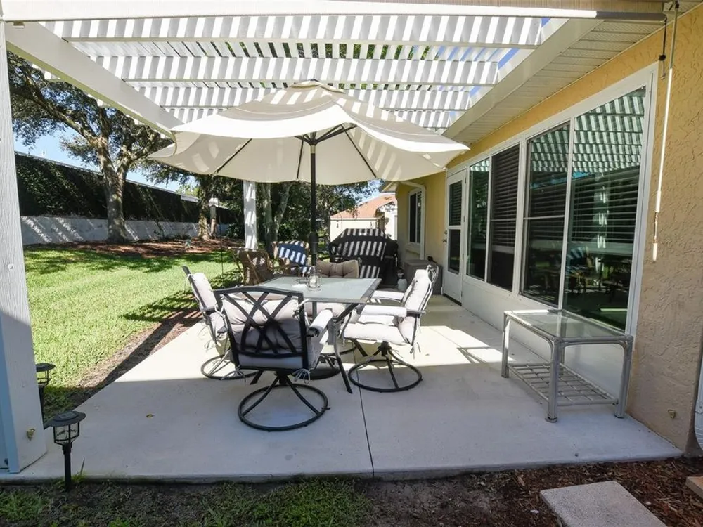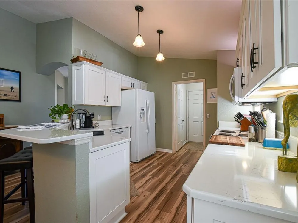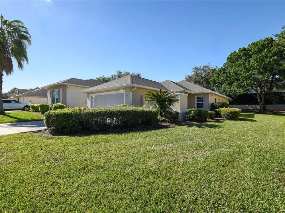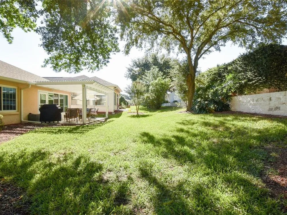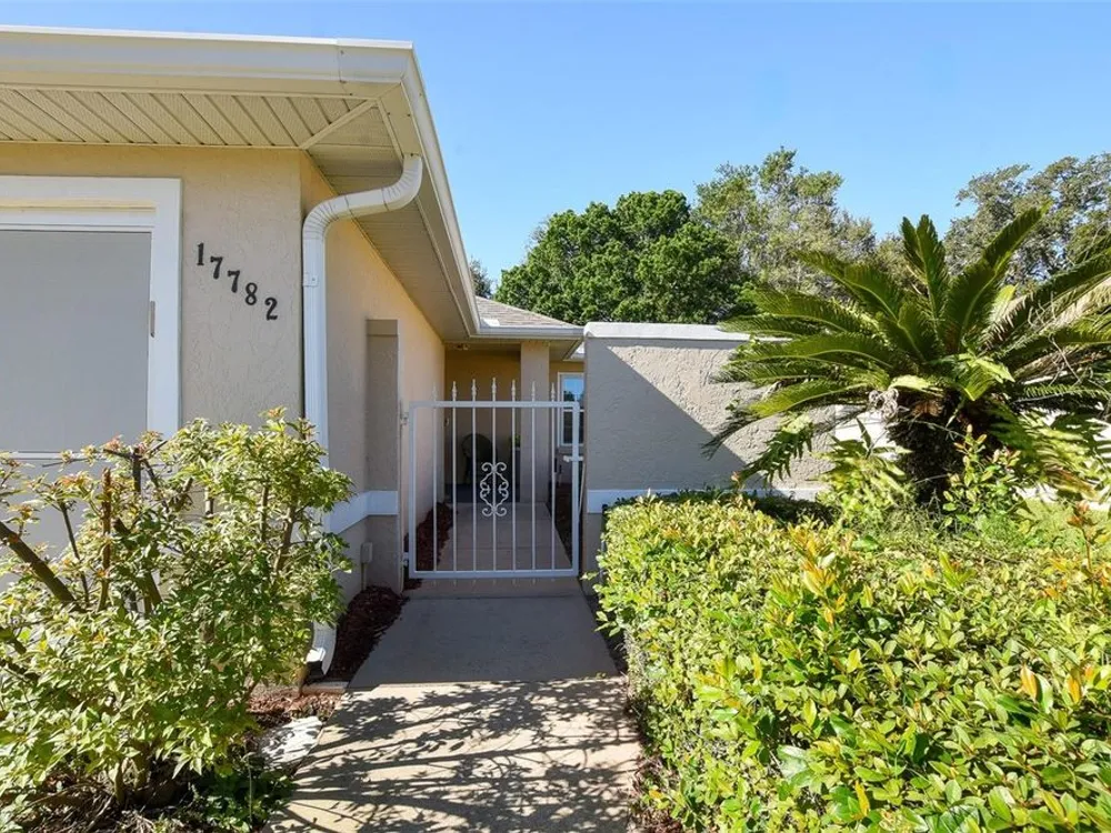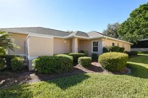This beautifully updated 2-bedroom, 2-bath villa with a 2-car garage was originally a model home, showcasing thoughtful design and premium finishes throughout. Located in the desirable 55+ gated golf course community of Stonecrest in Summerfield, FL, it offers 1,234 sq ft of living space plus a 120 sq ft sunroom—ideal for a den, office, or relaxation space. The kitchen shines with newer cabinets, quartz countertops, crown molding, a deep stainless steel sink, a solar tube for natural light, and glass block recipe-style windows that also appear in the laundry room and dining area. The home features luxury vinyl plank flooring in the main living areas and newer carpeting in both bedrooms, freshly painted interior, all new lighting, 6-panel doors throughout, and all new windows except in the bathrooms. A pocket door separates the guest bedroom and bath for added privacy, and the inside laundry room adds convenience. Step outside to a newer concrete patio with a charming pergola overhead. Villa owners enjoy full-service lawn and shrub care provided by the HOA, plus access to 3 outdoor pools, 1 indoor pool, a restaurant, and a vibrant calendar of activities. With a prime location close to shopping, dining, nightly entertainment, and medical facilities, this home offers low-maintenance living in a lively, amenity-rich community. (Washer and Dryer do not convey).