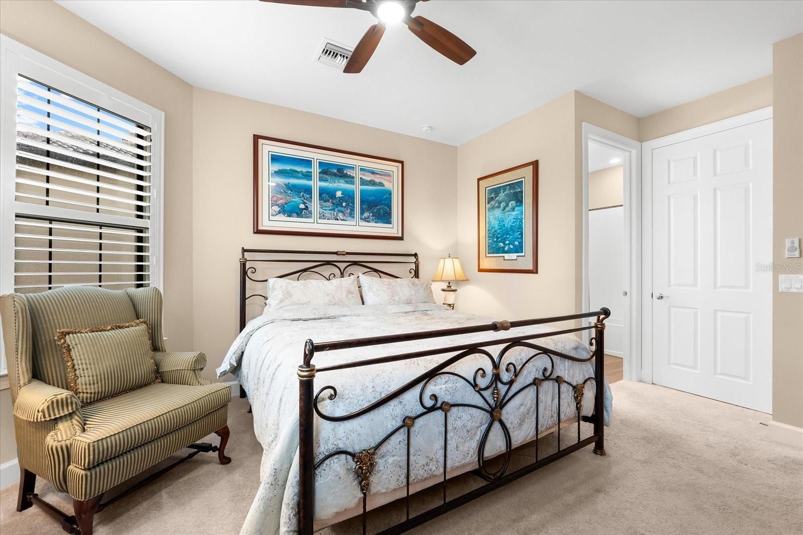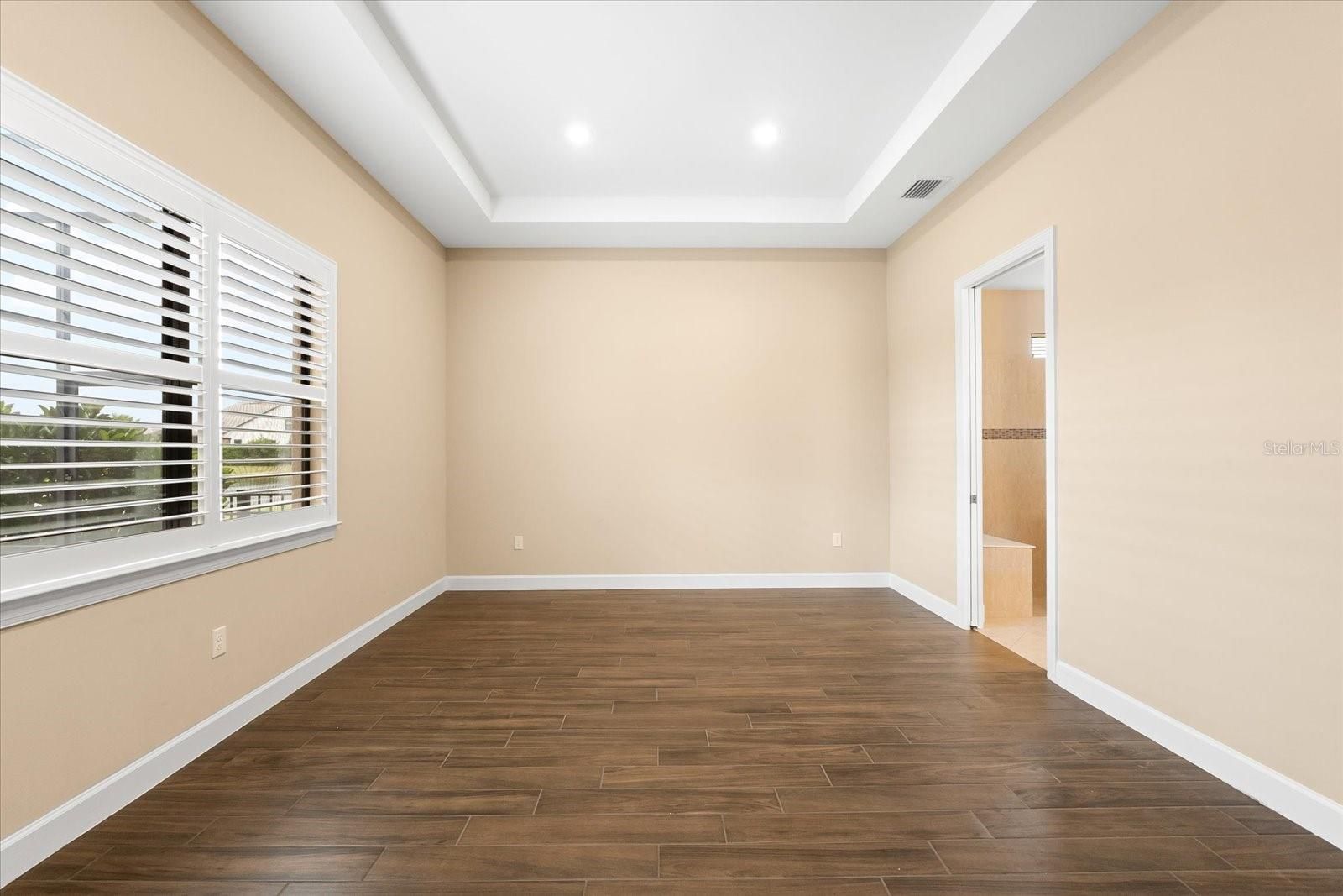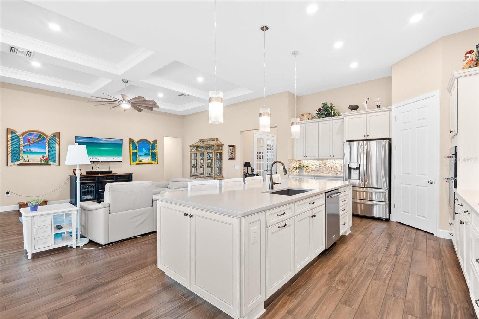 - Ceiling Fan(s), Coffered Ceiling(s), Eat-in Kitchen, Kitchen/Family Room Combo, Open Floorplan, Main Level Primary, Solid-Wood Cabinets, Split Bedrooms, Stone Counters, Thermostat, Tray Ceiling(s), Walk-In Closet(s), Window Treatments