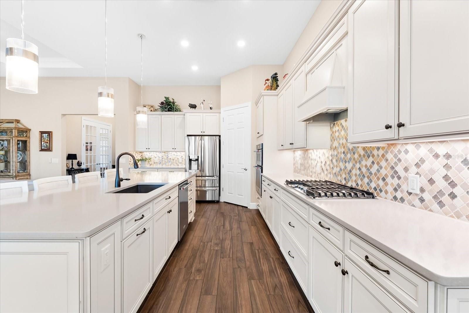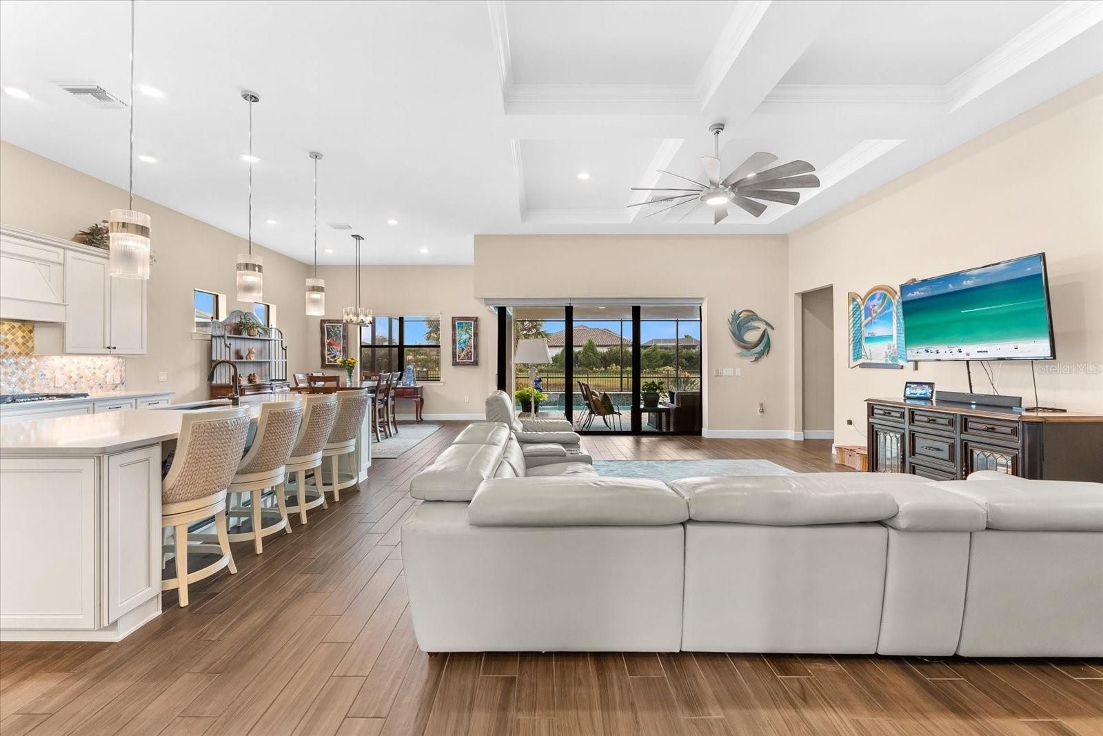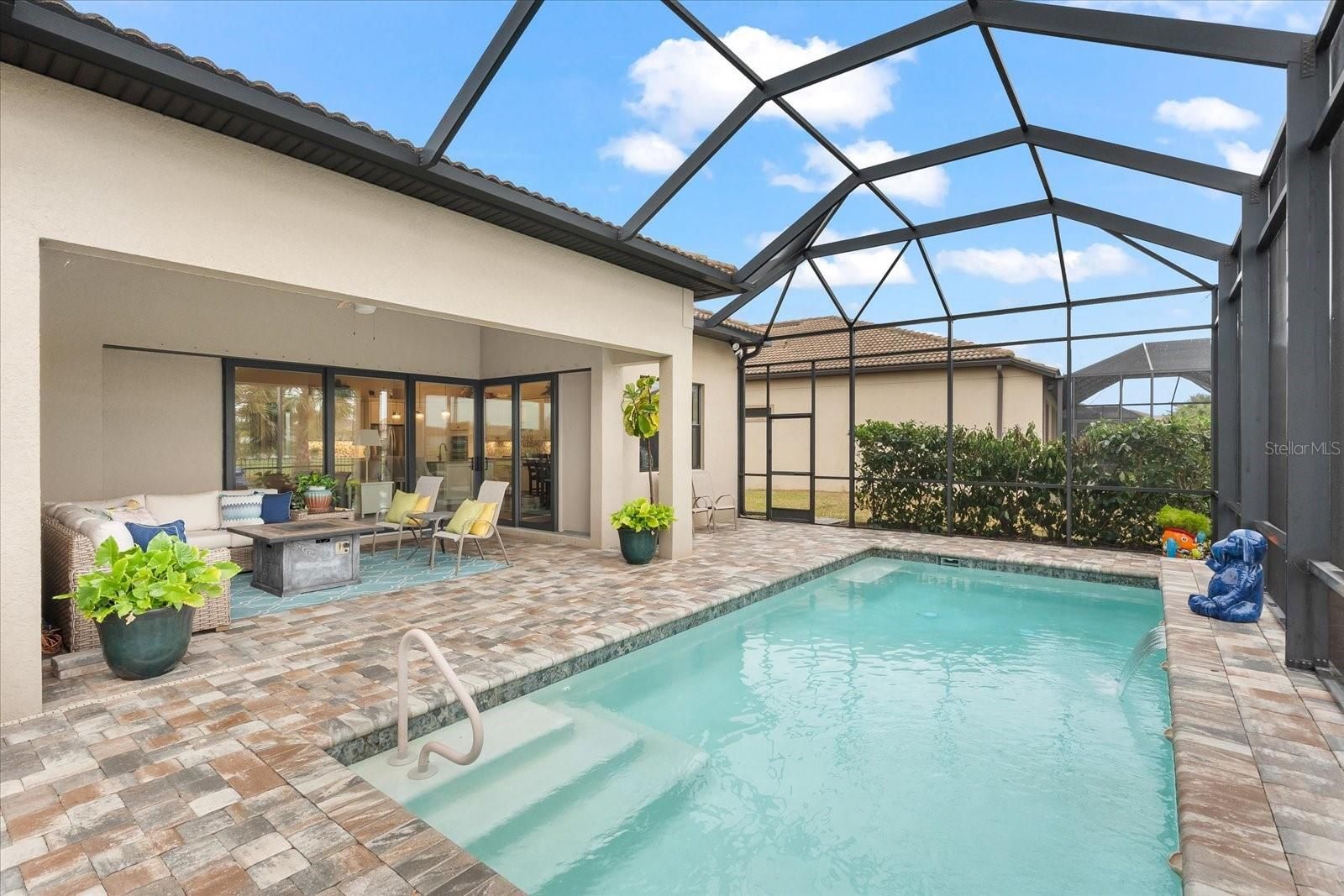 Under contract-accepting backup offers. Welcome to the Pinnacle of Perfection. Prepare to be impressed by this remarkable Pinnacle Model, beautifully positioned on a tranquil water view lot within the highly coveted Del Webb 55+ community in Lakewood Ranch. Designed for refined Florida living, this exceptional residence seamlessly blends classic elegance with modern upgrades, offering both stye and everyday functionality. Featuring 3 bedrooms, 3 bathrooms, a private den, and a thoughtfully crafted open layout, this home is ideal for entertaining guests or enjoying relaxed daily living Designer details abound, including Plantation shutters, a tray ceiling in the owner’s suite, a striking coffered ceiling in the gathering room, and contemporary lighting and ceiling fans throughout. At the heart of the home, the expansive gathering room flows effortlessly into a chef-inspired gourmet kitchen. This show-stopping space highlights a large island with seating for four, stylish pendant lighting,42” cabinetry, quartz countertops, a granite sink, designer backsplash, gas cooktop, and a statement wood hood—perfect for both casual meals and entertaining. Throughout the main living areas, medium-toned plank tile flooring creates warmth and continuity, while plush carpeting in the bedrooms and large- format tile in the owner’s bath add comfort and elegance. Open the zero-corner sliding glass doors to discover an inviting, covered extended lanai---your private outdoor retreat. Enjoy a heated pool with a soothing waterfall, peaceful water views, and a fenced yard ideal for pets, creating the ultimate outdoor lifestyle. The expansive owner’s suite offers a serene escape with space for a sitting area and a spa-like ensuite featuring dual vanities, a spacious walk-in shower, and a custom walk-in closet with drawers, shelving, and abundant hanging space. Two additional guest bedrooms—one with its own ensuite—provide comfort and privacy for visitors. The versatile den easily adapts to your lifestyle, whether as a home office, gym, hobby room, or creative space. This home is loaded with premium upgrades, including a whole-home generator, double-pane windows, 4-foot garage extension with epoxy coated flooring, and convenient attic storage with pull-down access. Opportunities like this are rare. Don’t miss your chance to own this exceptional Pinnacle Model in Del Webb. Schedule your private showing today and experience luxury living at its finest.