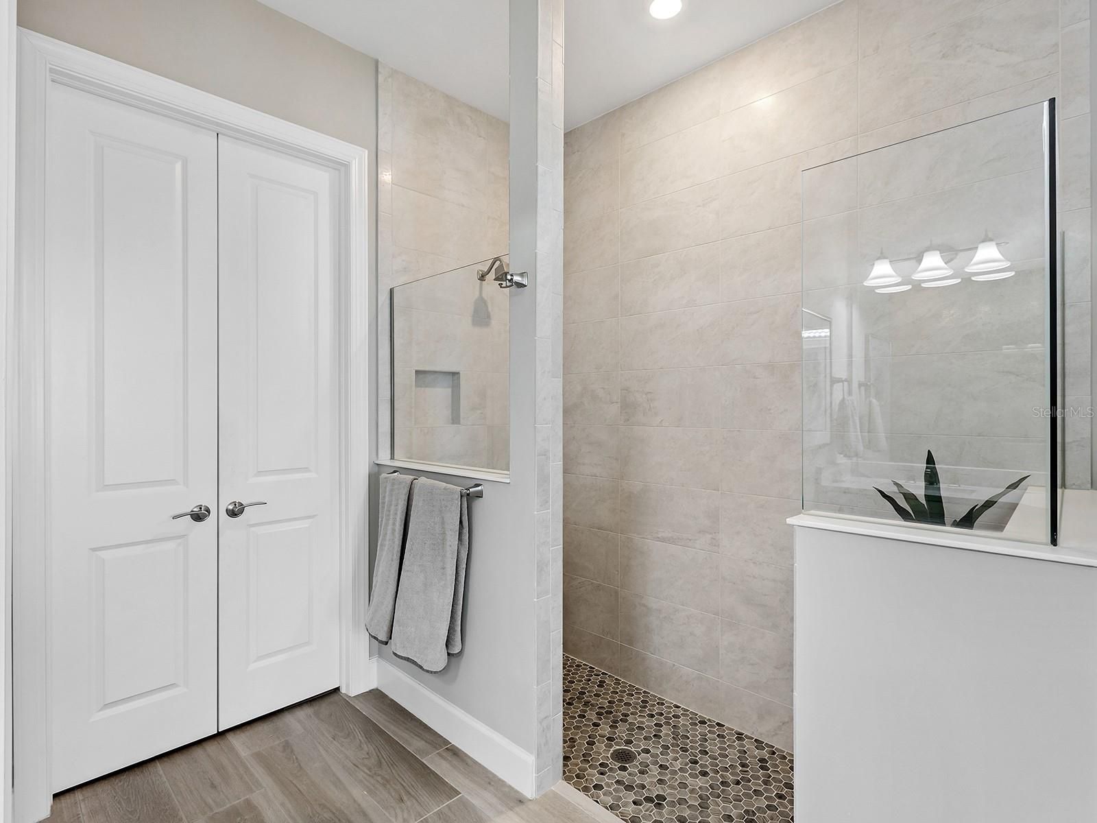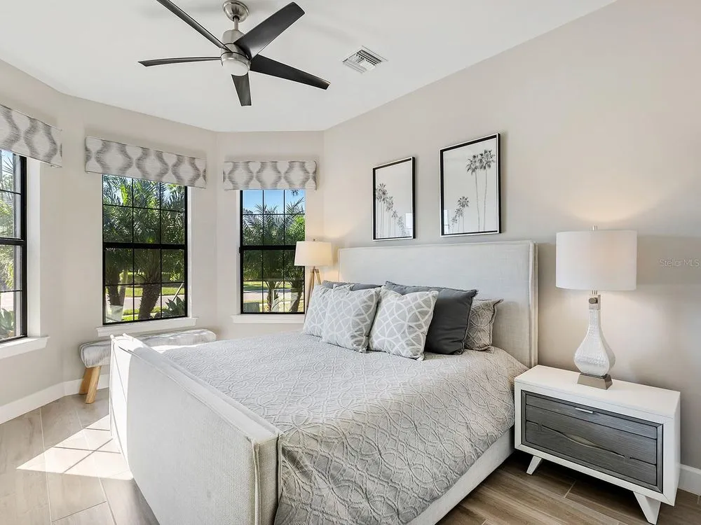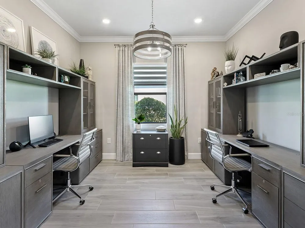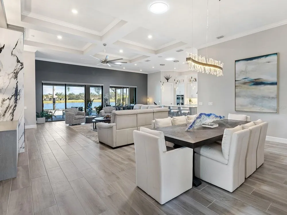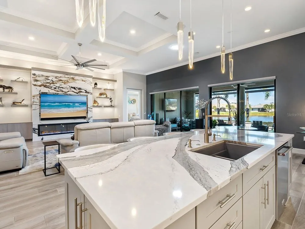 Filled to the brim with clever and beautiful upgrades, this fully FURNISHED home on a prime lakefront lot is the crowning jewel of Del Webb, Lakewood Ranch's premier 55+ active adult community. Starting with this spacious single level floor plan, the owners made numerous upgrades enhancing the beauty; and then expanded on those upgrades throughout 2022 to 2025 improving the form, function and appearance of this residence even more. From the moment you enter you will be greeted by upscale front landscaping with rocks and lights, large lake views, wood-look porcelain plank flooring throughout, an open floor plan ideal for entertaining and custom upgrades in every room that make this home truly one of a kind. The central great room boasts a 2023 feature wall with custom built-in cabinetry and under-lit floating shelves, a full porcelain wall with 85” TV, built in sound system, electric fireplace and solar skylights, plus coffered ceiling and wall of sliding glass doors to the lanai. The opulent formal dining room features a showstopping custom dry bar added in 2023 with granite counters, crackle glass display cabinets, and custom handpainted backsplash, plus 2023 crystal chandelier. The chef’s kitchen shines with 2023 Calacatta quartz island counter, 2023 crystal pendants, custom two-tone cabinetry with additional lit upper glass displays, walk-in pantry, and adjacent dinette. The stainless-steel appliance suite includes 2021 induction cooktop (pre-plumbed for future gas cooktop if desired), dishwasher, 2023 Advantium built-in microwave and wall oven, and refrigerator. Through the sliding glass doors, take in the gorgeous lake views from the 2021 paver lanai with summer kitchen, pool and motorized hurricane screens. Enjoy meals alfresco from the outdoor kitchen with stainless steel grill, dual-drawer bar fridge and side burner. Lounge by the lakeside in your custom 2021 pool with large sunshelf, raised spa, fire bar, water features and surrounded by panoramic screen enclosure with additional integrated sunshade for privacy on the east side. Inside the primary bedroom is your private oasis with sunset lake views, large walk-in closet with custom shelving and spa-like bathroom with oversized walk-in shower. Guests will cherish the two guest bedrooms and two full guest bathrooms outfitted with luxe upgrades. When you’re ready for privacy, retreat to the study with dual walls of desks and storage. Also included in this impeccable residence is a laundry room with 2023 floor-to-ceiling storage cabinetry and large folding counter, along with an expanded 3-car garage with its own air conditioner and workshop space. Enjoy premium peace of mind with a 2023 Kohler whole-house GENERATOR and 2023 whole-house storm power and roller shades. Additional upgrades include blackout window treatments, 2023 gas pool heater and salt cell and 2023 upgraded front landscaping. Offered fully FURNISHED, this residence is ready for you to move in right away! Del Webb is a premier 55+ active adult, gated community with extensive resort-style amenities and social activities including an expansive clubhouse, restaurant, fitness center with classes, resort-style pool, lap pool and spa, outdoor and events areas, dog park, tennis and pickleball courts, social clubs and events, full-time lifestyle director and more! Lakewood Ranch is the top multi-generational community in the country for seven years in a row with plentiful shopping, dining, parks and nearby beaches.