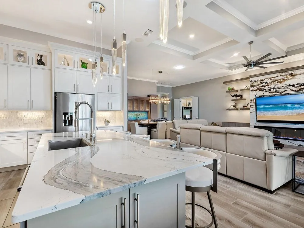 - Built-in Features, Ceiling Fan(s), Coffered Ceiling(s), Crown Molding, Dry Bar, Eat-in Kitchen, High Ceilings, Living/Dining Room, Open Floorplan, Main Level Primary, Solid-Wood Cabinets, Split Bedrooms, Stone Counters, Tray Ceiling(s), Walk-In Closet(s), Window Treatments