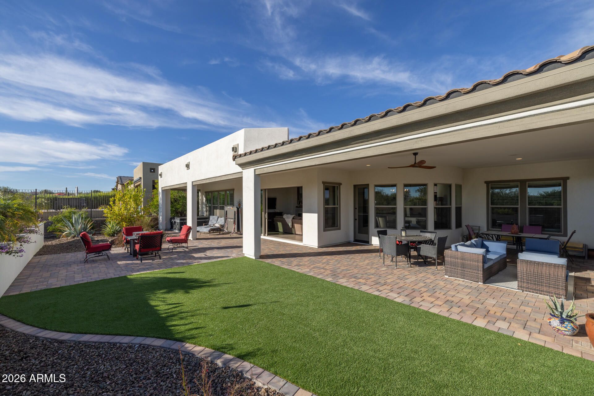 Welcome to Trilogy at Verde River and this impressive Orion floorplan, where polished desert-modern design makes a bold first impression. The front yard showcases drought-tolerant plants and mature landscaping, creating sleek, modern curb appeal. Inside, the home opens to sweeping four-peak mountain views and exceptional privacy, backing to a serene common area with no neighbors behind. The thoughtfully designed layout includes three spacious bedrooms, each with a private ensuite, along with a dedicated office and flexible media room complete with surround sound. The gourmet kitchen anchors the home with built-in stainless steel appliances, an expansive island with a breakfast bar, and a dining room that flows seamlessly into the great room. The great room features a fireplace and multi- panel sliding doors that open to the outdoors. The primary suite is a spa-inspired retreat with dual vanities, a soaking tub, walk-in shower, and generous closet. Outside, the extended patio is framed by structured landscaping, artificial turf, and a dramatic planter wall filled with Pygmy Date Palms and vibrant bougainvillea, and includes a fireplace, TV niche, BBQ, beverage fridge, and rattlesnake fencing. A spacious 3-car garage completes this exceptional home. Don't miss your chance to experience the perfect Arizona winter lifestyle. The amenities at Verde River are World Class with Tom Lehman inspired eighteen-hole Golf course, tennis courts, 12 pickleball courts, and bocce ball, heated lap pool and Resort style swimming pool, hot tub, Afterburn fitness center, Helen's demonstration Kitchen for cooking classes and a 7.5 acre dog park. The community center has casual poolside dining at Eddy's Diner and gourmet dining at award-winning Needle Rock Kitchen and Tap, Alvea Spa with full-service Salon and Spa amenities, Art Loft and events center. Trilogy at Verde River is adjacent to the Tonto National Forest and is situated in the middle of miles and miles of hiking and biking trails.