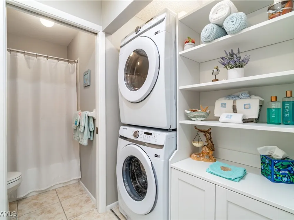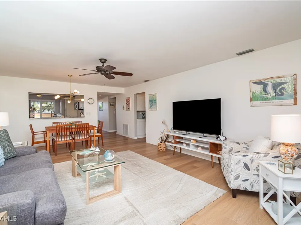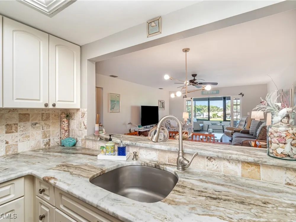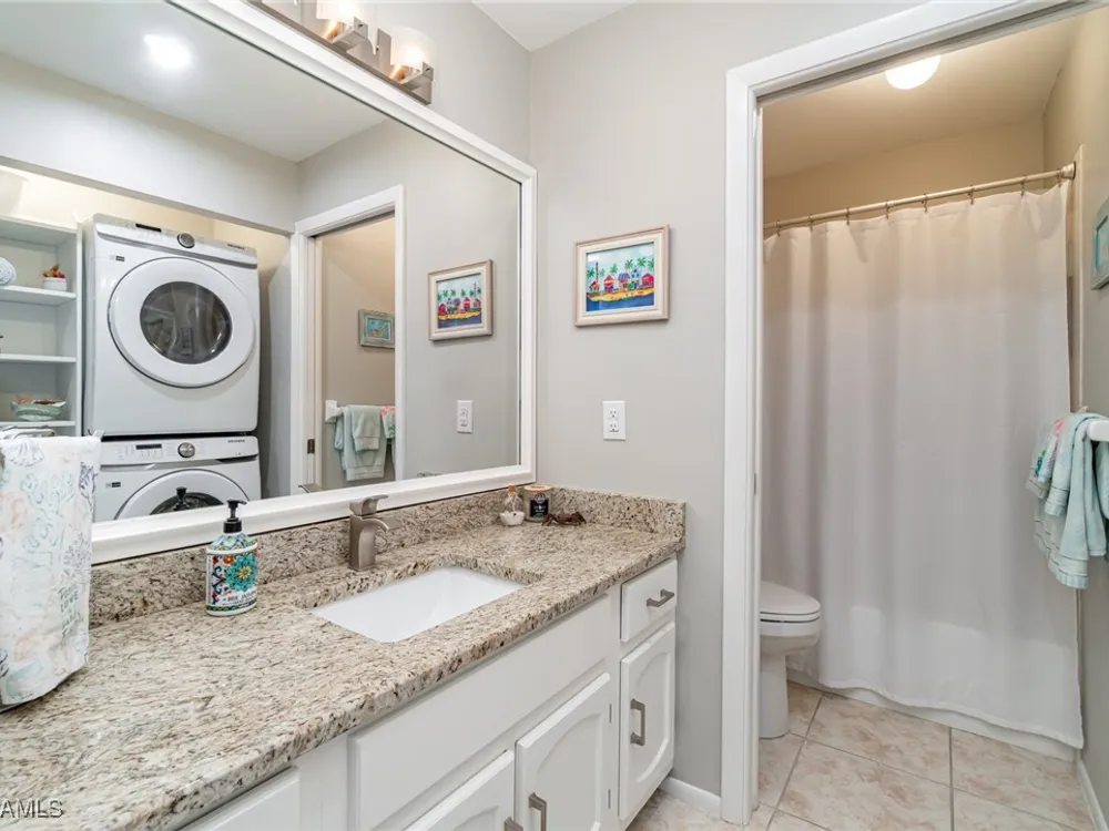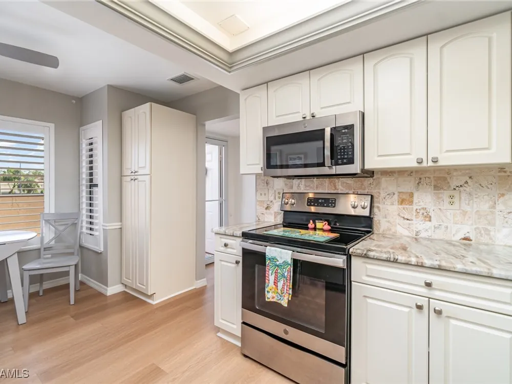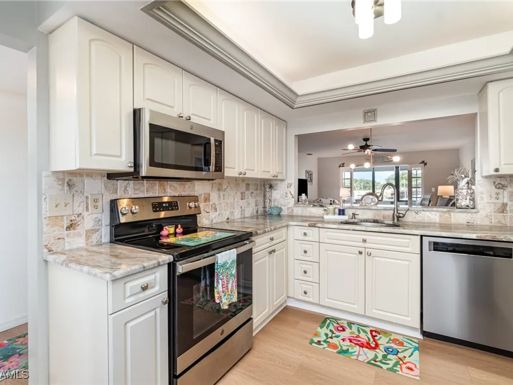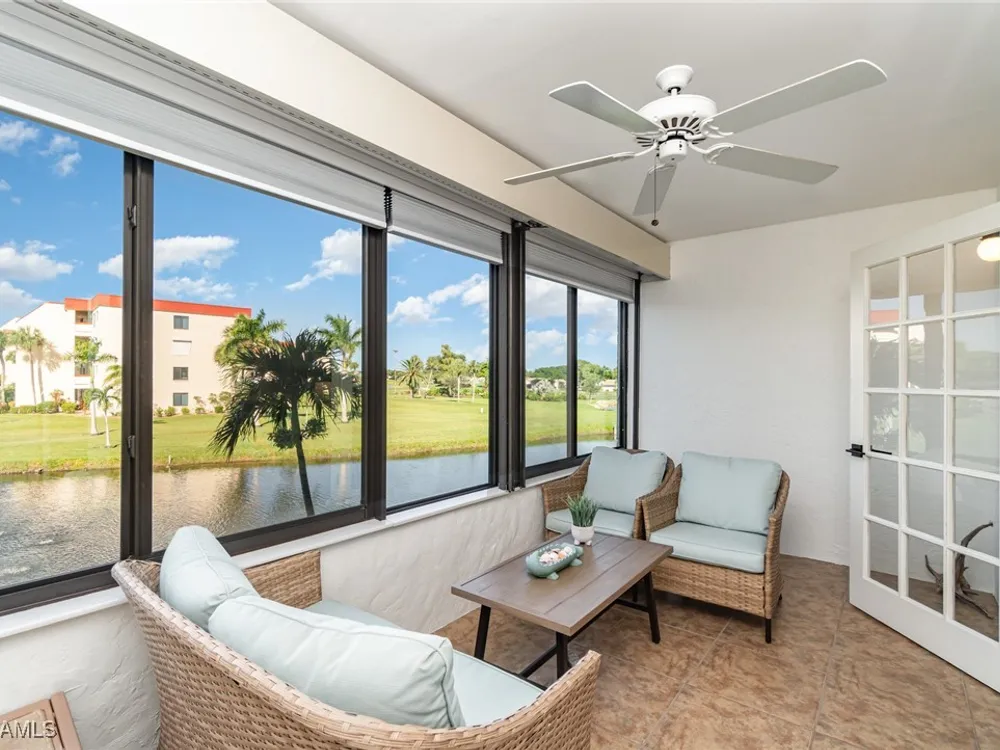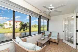 Enjoy the best of Florida living in this beautifully updated 2-bedroom, 2-bath, second-floor condo overlooking the water in the highly desirable Seven Lakes Golf & Tennis Community! This light and bright home features a remodeled kitchen with a tray ceiling, updated lighting, granite countertops, and stainless-steel appliances. A convenient pass-through window to the dining area is perfect for entertaining. The interior has been freshly painted and includes new luxury vinyl flooring and baseboards throughout. Both bathrooms have been tastefully upgraded. The primary bath offers a walk-in tiled shower, and the guest bath features granite counters and a tiled tub/shower combination. Additional highlights include plantation shutters, a full-size stackable Samsung washer and dryer (2022), HVAC Trane system (2020), and water heater (2021). Relax year-round on the spacious lanai with hurricane resistant windows and hurricane shutters. This condo is being offered furnished with a King Bed in the primary bedroom and a Queen Bed in the guest bedroom. It includes a covered carport and golf cart space. Seven Lakes is an active 55+ community with an executive golf course (no transfer or green fees!), six heated pools, six Har-Tru tennis courts, pickleball, bocce, shuffleboard, fitness center, library, woodworking and craft rooms, billiards, and an on-site restaurant and lounge with regular social events, dinners, and dances. Pet-friendly (one pet up to 25 lbs.) and securely gated with 24-hour guard. HOA fees include golf, tennis, water, cable/Wi-Fi, trash, building insurance, and exterior maintenance—residents only pay for electricity! Conveniently located across from Bell Tower Shops, near fine dining, shopping, and just a short drive to RSW Airport and Southwest Florida’s beautiful beaches.