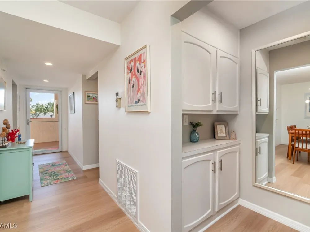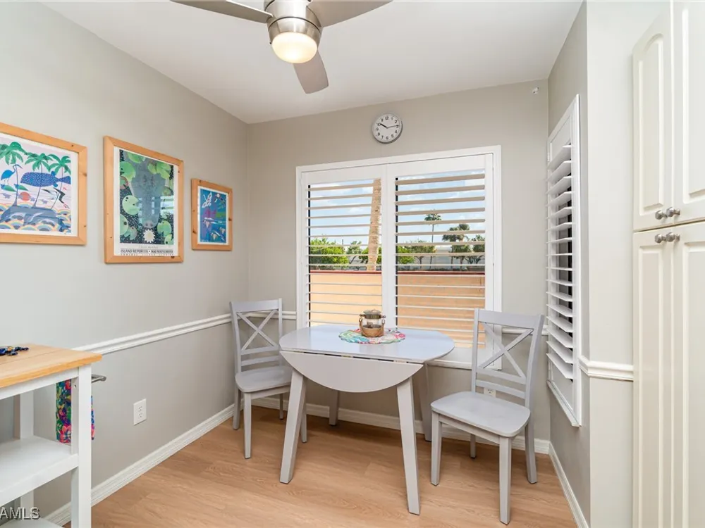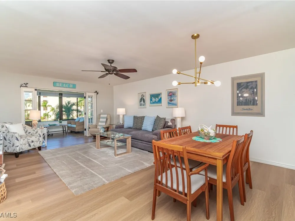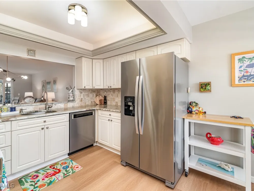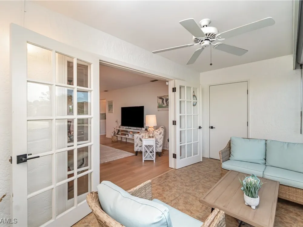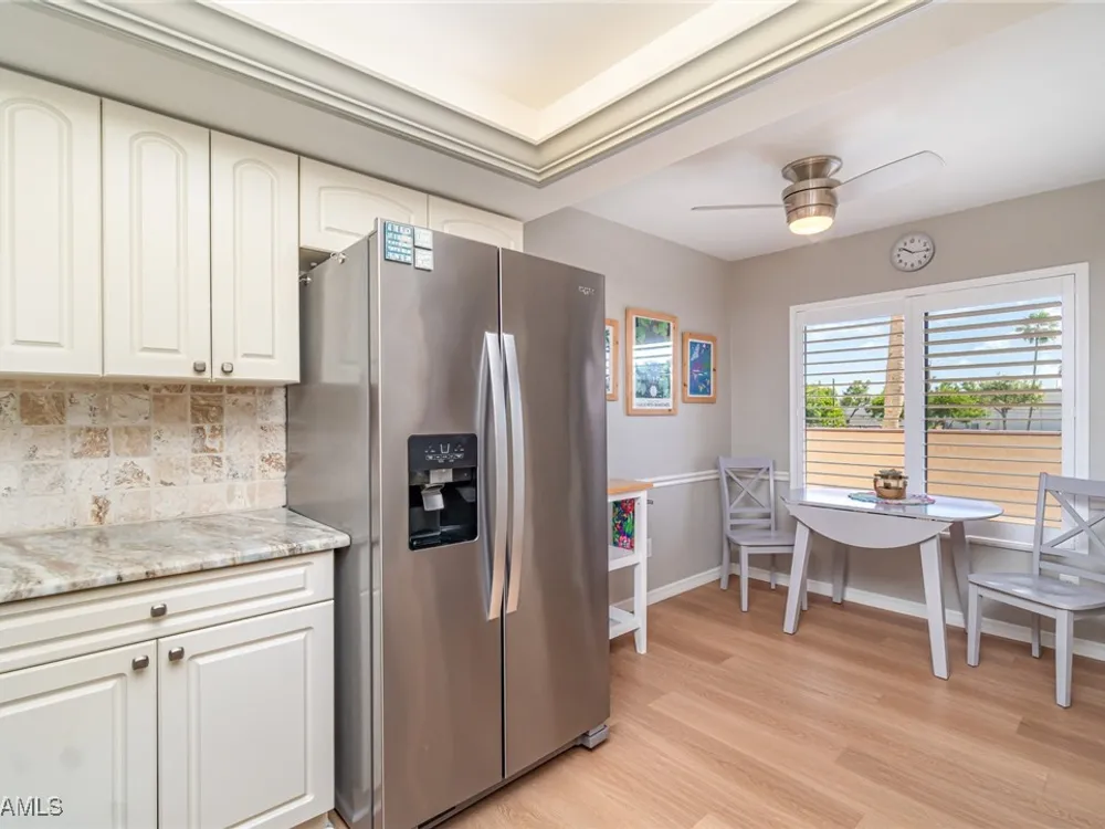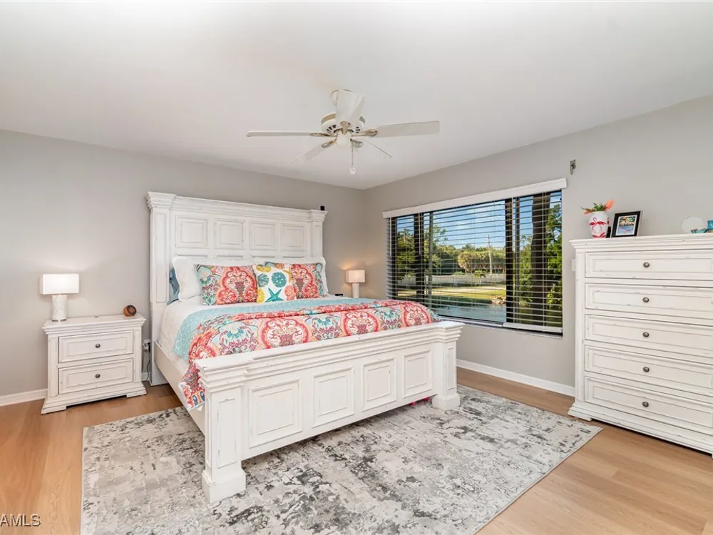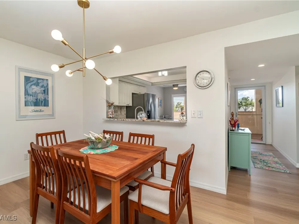 Enjoy the best of Florida living in this beautifully updated 2-bedroom, 2-bath, second-floor condo overlooking the water in the highly desirable Seven Lakes Golf & Tennis Community! This light and bright home features a remodeled kitchen with a tray ceiling, updated lighting, granite countertops, and stainless-steel appliances. A convenient pass-through window to the dining area is perfect for entertaining. The interior has been freshly painted and includes new luxury vinyl flooring and baseboards throughout. Both bathrooms have been tastefully upgraded. The primary bath offers a walk-in tiled shower, and the guest bath features granite counters and a tiled tub/shower combination. Additional highlights include plantation shutters, a full-size stackable Samsung washer and dryer (2022), HVAC Trane system (2020), and water heater (2021). Relax year-round on the spacious lanai with hurricane resistant windows and hurricane shutters. This condo is being offered furnished with a King Bed in the primary bedroom and a Queen Bed in the guest bedroom. It includes a covered carport and golf cart space. Seven Lakes is an active 55+ community with an executive golf course (no transfer or green fees!), six heated pools, six Har-Tru tennis courts, pickleball, bocce, shuffleboard, fitness center, library, woodworking and craft rooms, billiards, and an on-site restaurant and lounge with regular social events, dinners, and dances. Pet-friendly (one pet up to 25 lbs.) and securely gated with 24-hour guard. HOA fees include golf, tennis, water, cable/Wi-Fi, trash, building insurance, and exterior maintenance—residents only pay for electricity! Conveniently located across from Bell Tower Shops, near fine dining, shopping, and just a short drive to RSW Airport and Southwest Florida’s beautiful beaches.