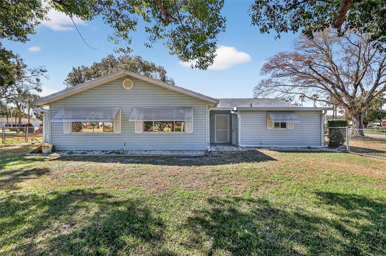 Welcome to your NEW HOME in SPRUCE CREEK SOUTH! This beautiful 2/2 CUSTOM PECAN model has a BRAND NEW ROOF (2026) and is situated on a large CORNER LOT! As you enter the home you will find a Neutral Color Palette , Durable LUXURY VINYL FLOORING in the Kitchen, Living Rm, Dining Rm and Hallway Plus PLANTATION SHUTTERS throughout!! The Kitchen has been updated with GRANITE Countertops and CABINETS with Pull-Outs..Just off the Dining Rm this house boasts a large FLORIDA ROOM. This Space is perfect for Entertaining or Relaxing. The GUEST BATHRM has been updated with a Beautiful New COUNTERTOP/CABINET and LIGHTING.A spacious TWO-CAR GARAGE with an INSULATED DOOR PLUS SCREEN and ATTIC ACCESS .There is also a SEPARATE GOLF CART GARAGE in the BACK of the Garage providing plenty of STORAGE SPACE. OTHER FEATURES INCLUDE: HVAC 2021-Including Ducts and Attic Insulation, HT WT HEATER 2014, FENCED IN BACK YARD,TRANSFERABLE TERMITE TREATMENT PLAN.LIGHTWEIGHT PLASTIC HURRICANE COVERS FOR WINDOWS.Don't miss this opportunity to live in a WONDERFUL 55+ community. Drive your Golf Cart to Restaurants,Golf and Shopping! Call for your appt today!