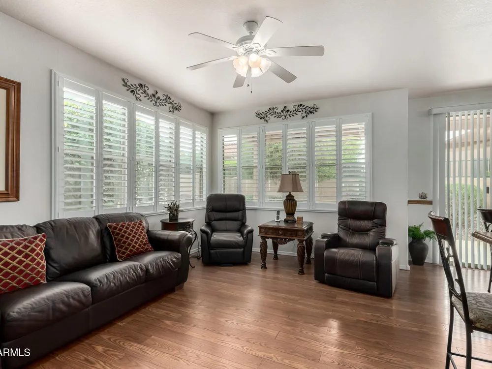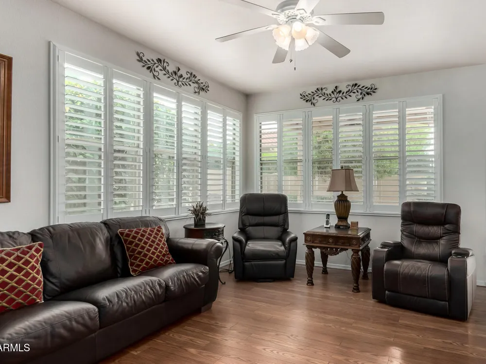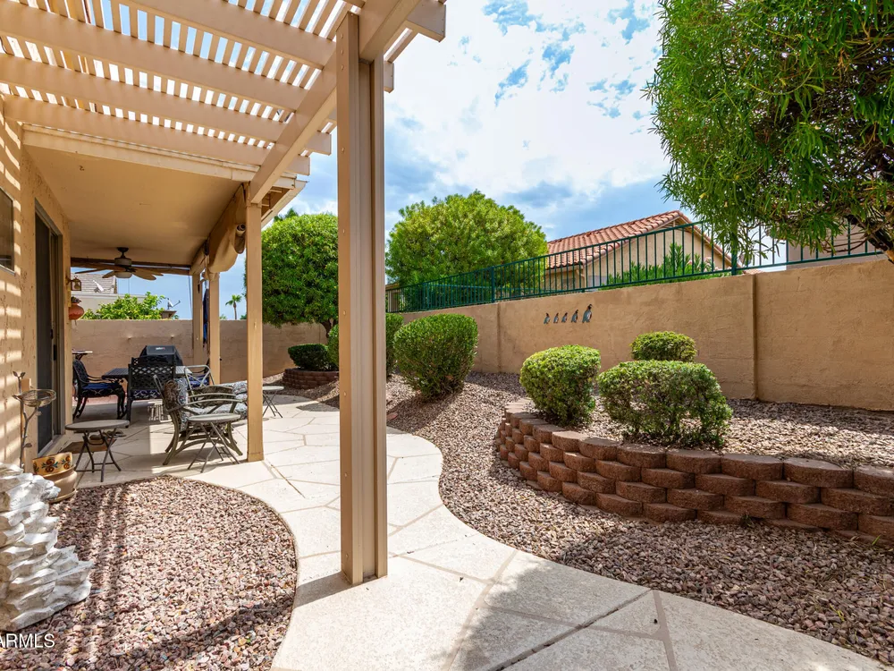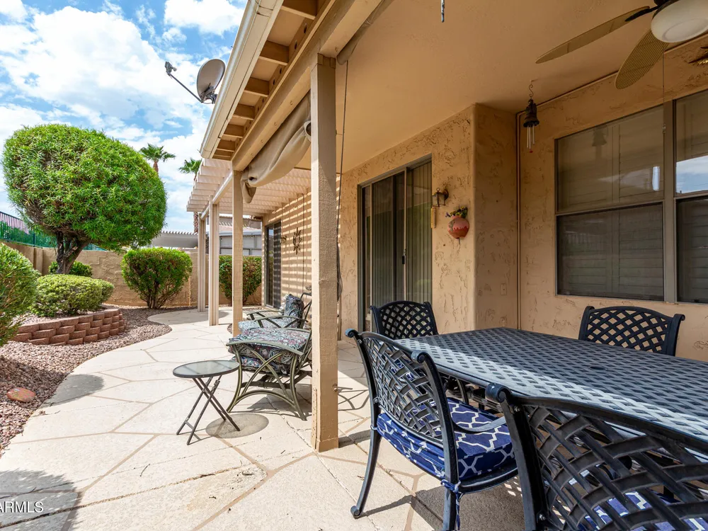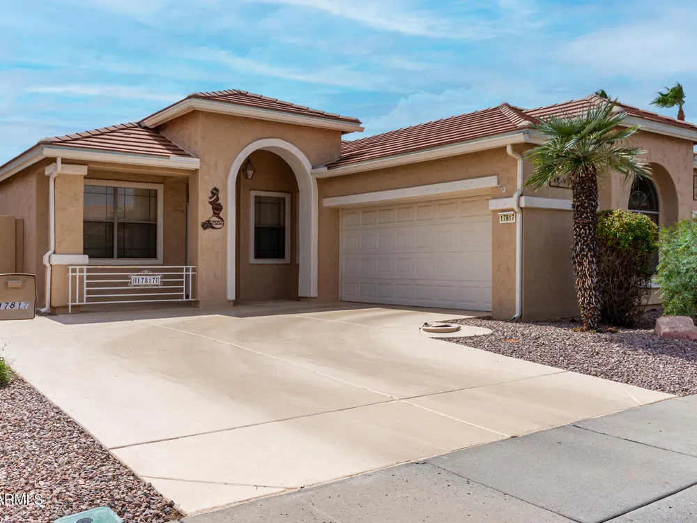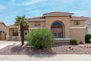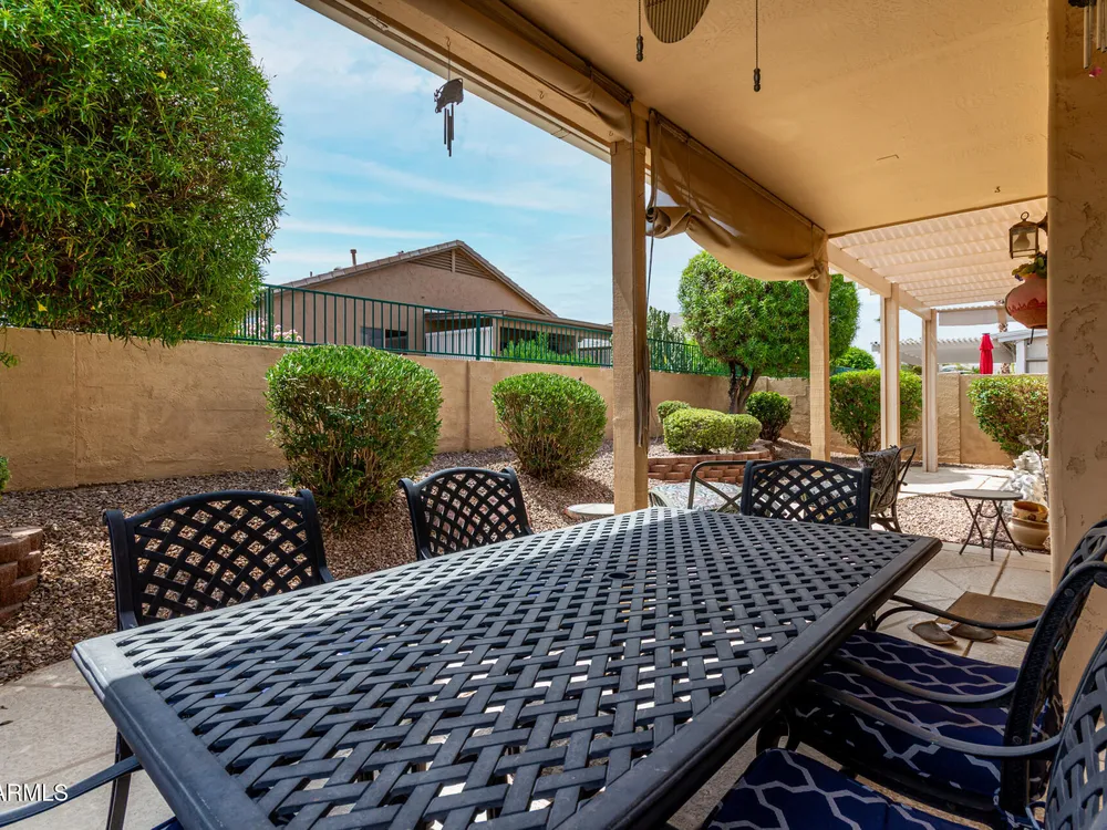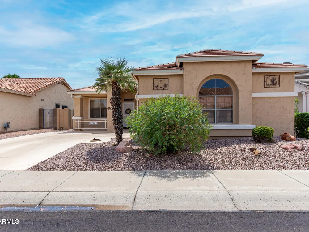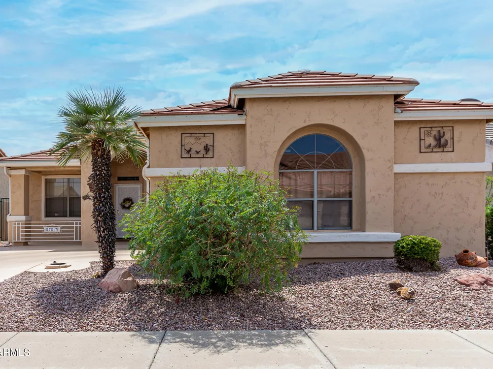 Presenting a beautifully maintained and expanded 2-bedroom plus den plus bonus room home in the Guard-Gated 55+ Arizona Traditions Resort Community! This spacious floor plan offers Formal Living and Dining areas, along with an open Great Room that combines the Family room, Kitchen, and Breakfast Nook. The open island kitchen features rich granite counters and newer stainless-steel appliances. The large primary suite includes two closets (one is a walk-in) an ensuite bath with updated Silestone counters, dual sinks, framed mirrors, and a private patio exit. A versatile den/office and a private bonus room off the Laundry provide space for crafts, sewing, storage, or a second home office. Gleaming wood laminate flooring flows throughout the main living areas and hallways, . . . with carpet in the bedrooms and tile in both baths and the flex room. Plantation shutters accent most windows. The backyard is fully fenced and designed for outdoor living, featuring an extended pergola patio cover (2020), extended stamped concrete, and lush desert landscaping highlighted by mature lemon and grapefruit trees that produce abundantly in season. The roof underlayment was replaced in May 2021. HVAC replaced in 2022. Additional features include garage cabinets, a workbench, utility sink and a water softener (disconnected, never used). This well-cared-for home is a must-see! There is an exciting array of amenities and social activity available to the residents of Arizona Traditions. The 20,400 sf clubhouse is the central hub for community activities. It includes a ballroom, arts and crafts studios, woodshop, sewing room, library and state-of-the-art fitness center. Residents enjoy three pools, a softball field, horseshoe pit, biking and walking trails, bocce ball, pickleball and tennis courts. The 18-hole Arizona Traditions Golf Course designed by Dick Bailey winds throughout the community. It provides an exciting and challenging round for golfers of all skill levels. After a round of golf, many residents like to gather with friends at the public Arizona Traditions Bar located in our clubhouse. Within a mile, there are numerous everyday shopping conveniences such as grocery stores, a pharmacy, hardware store, hair salons and restaurants. The Surprise Sports Complex is five minutes away and is home to Spring Training for the Texas Rangers and the Kansas City Royals. Plus, Arrowhead Mall, West Valley Art Museum, West Gate Entertainment Center, State Farm (Cardinal Stadium) and numerous other sporting venues are within 20 to 30 minutes.