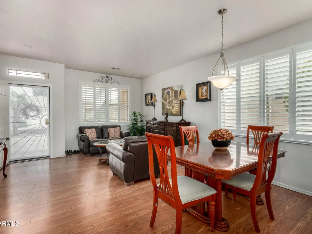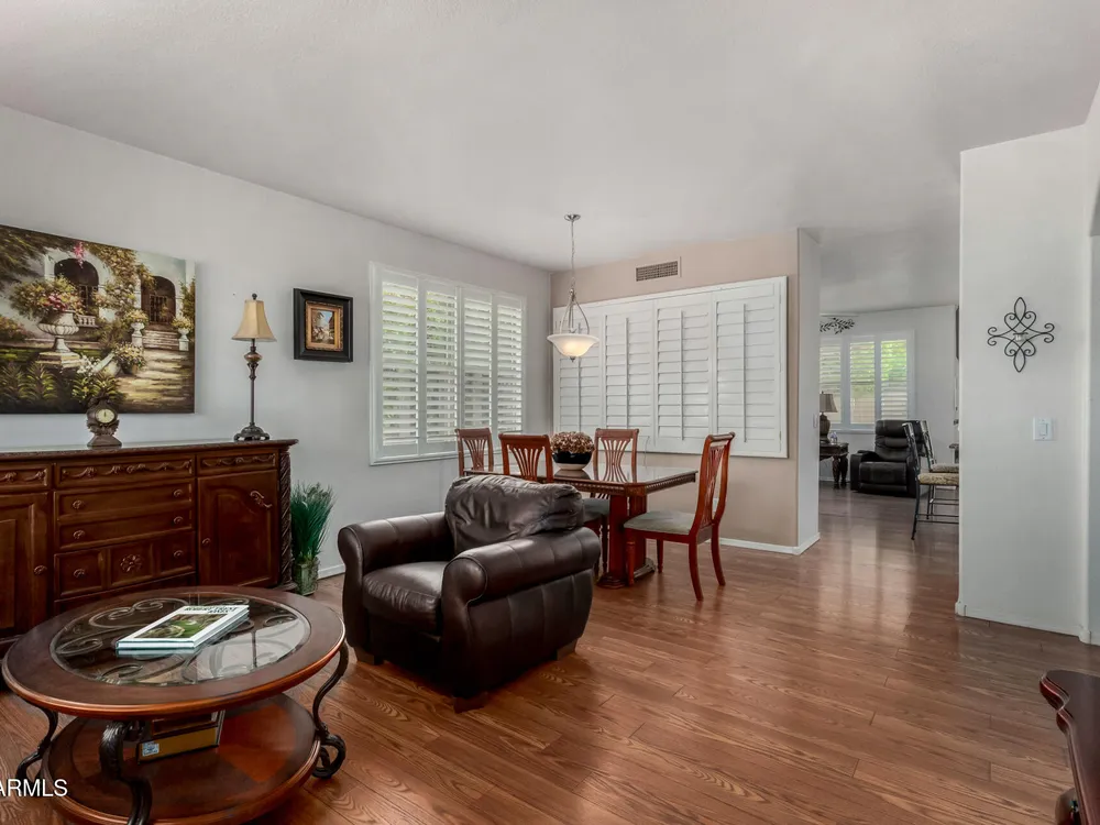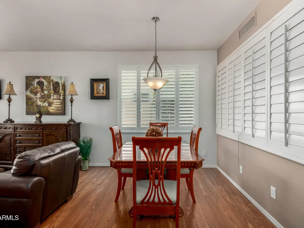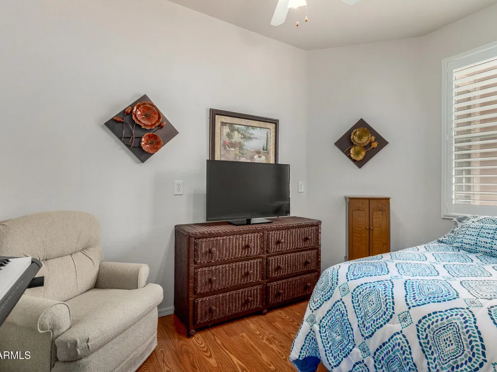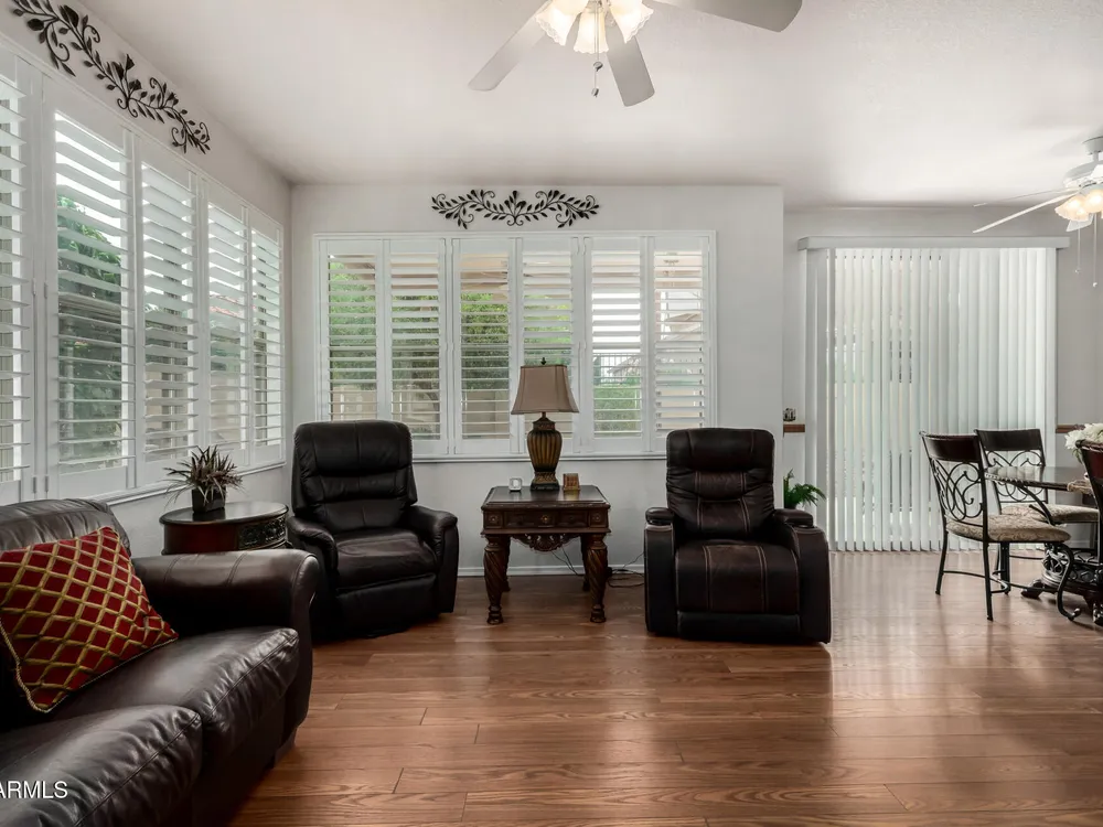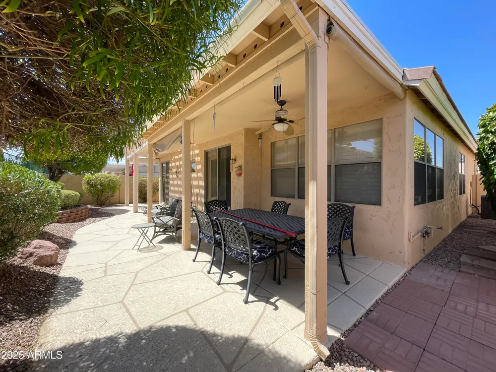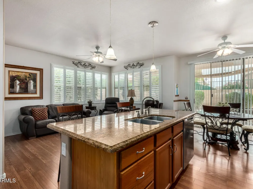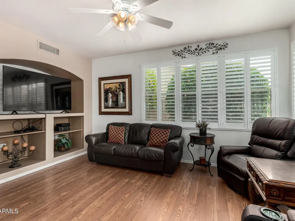 Presenting a beautifully maintained and expanded 2-bedroom plus den plus bonus room home in the Guard-Gated 55+ Arizona Traditions Resort Community! This spacious floor plan offers Formal Living and Dining areas, along with an open Great Room that combines the Family room, Kitchen, and Breakfast Nook. The open island kitchen features rich granite counters and newer stainless-steel appliances. The large primary suite includes two closets (one is a walk-in) an ensuite bath with updated Silestone counters, dual sinks, framed mirrors, and a private patio exit. A versatile den/office and a private bonus room off the Laundry provide space for crafts, sewing, storage, or a second home office. Gleaming wood laminate flooring flows throughout the main living areas and hallways, . . . with carpet in the bedrooms and tile in both baths and the flex room. Plantation shutters accent most windows. The backyard is fully fenced and designed for outdoor living, featuring an extended pergola patio cover (2020), extended stamped concrete, and lush desert landscaping highlighted by mature lemon and grapefruit trees that produce abundantly in season. The roof underlayment was replaced in May 2021. HVAC replaced in 2022. Additional features include garage cabinets, a workbench, utility sink and a water softener (disconnected, never used). This well-cared-for home is a must-see! There is an exciting array of amenities and social activity available to the residents of Arizona Traditions. The 20,400 sf clubhouse is the central hub for community activities. It includes a ballroom, arts and crafts studios, woodshop, sewing room, library and state-of-the-art fitness center. Residents enjoy three pools, a softball field, horseshoe pit, biking and walking trails, bocce ball, pickleball and tennis courts. The 18-hole Arizona Traditions Golf Course designed by Dick Bailey winds throughout the community. It provides an exciting and challenging round for golfers of all skill levels. After a round of golf, many residents like to gather with friends at the public Arizona Traditions Bar located in our clubhouse. Within a mile, there are numerous everyday shopping conveniences such as grocery stores, a pharmacy, hardware store, hair salons and restaurants. The Surprise Sports Complex is five minutes away and is home to Spring Training for the Texas Rangers and the Kansas City Royals. Plus, Arrowhead Mall, West Valley Art Museum, West Gate Entertainment Center, State Farm (Cardinal Stadium) and numerous other sporting venues are within 20 to 30 minutes.